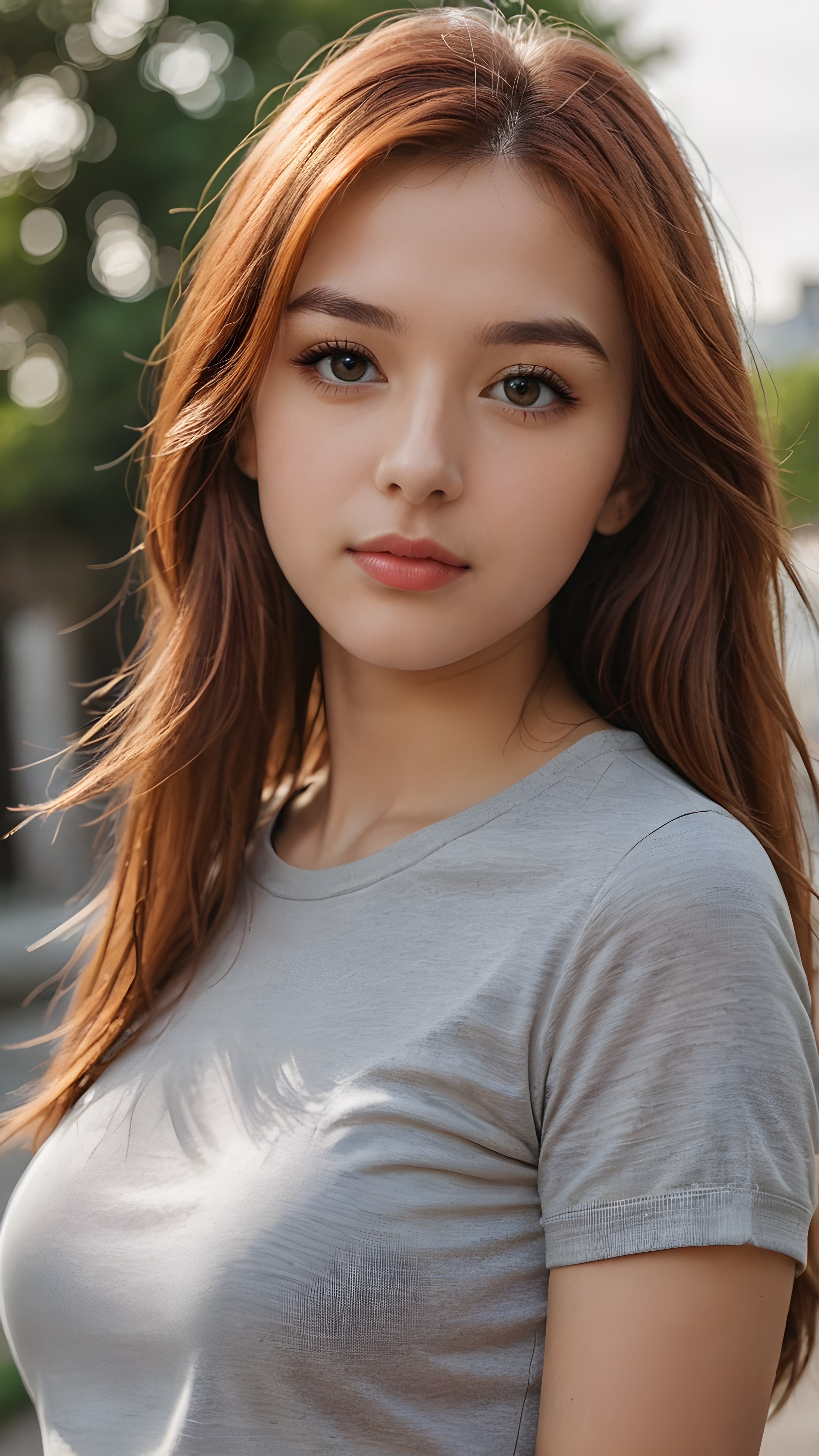 a thoughtful (((cute and petite girl))) with long, soft, red straight hair, soft lips and grey eyes that give off a romantic glow, wears a form-fitting tight t-shirt