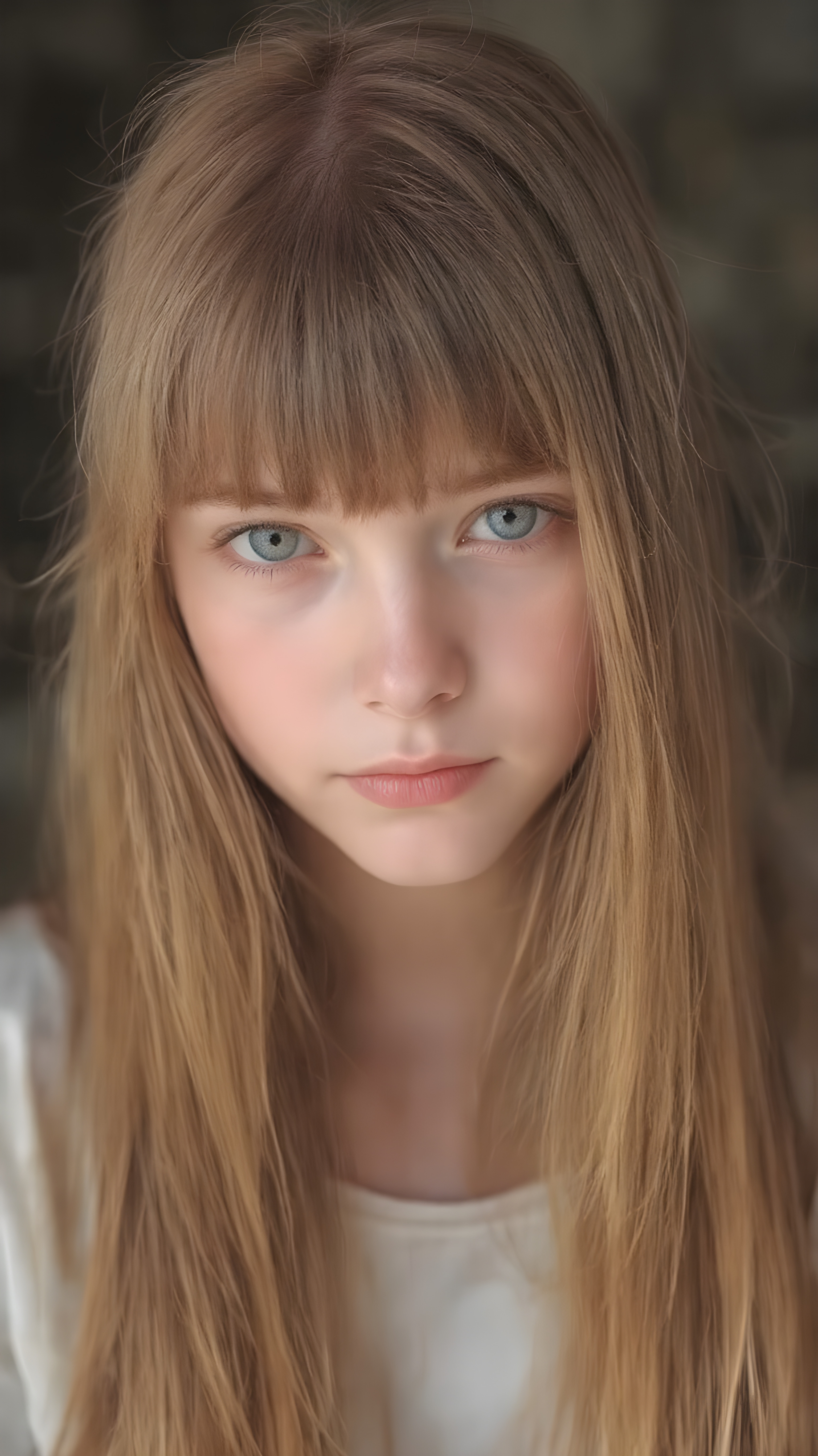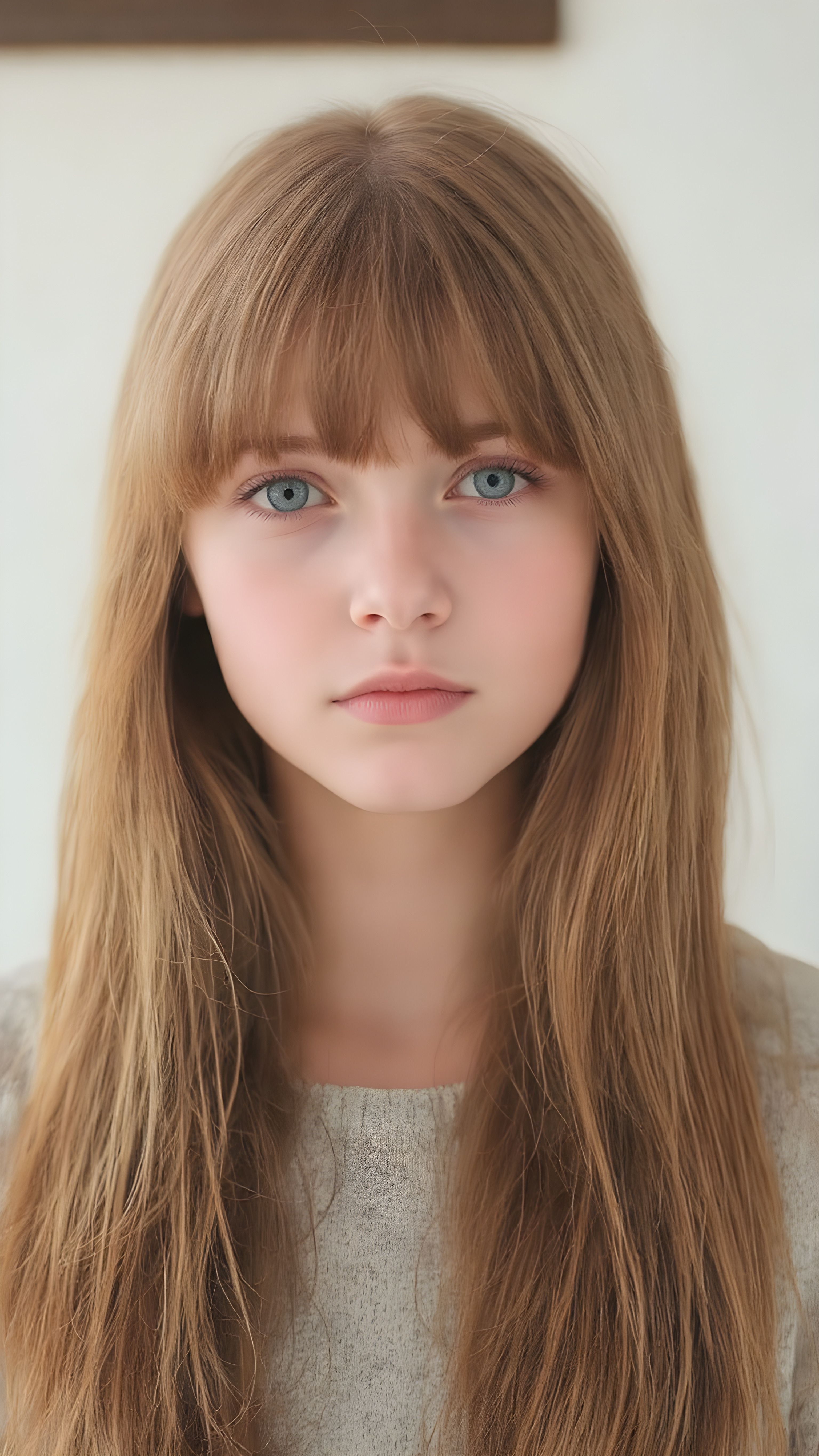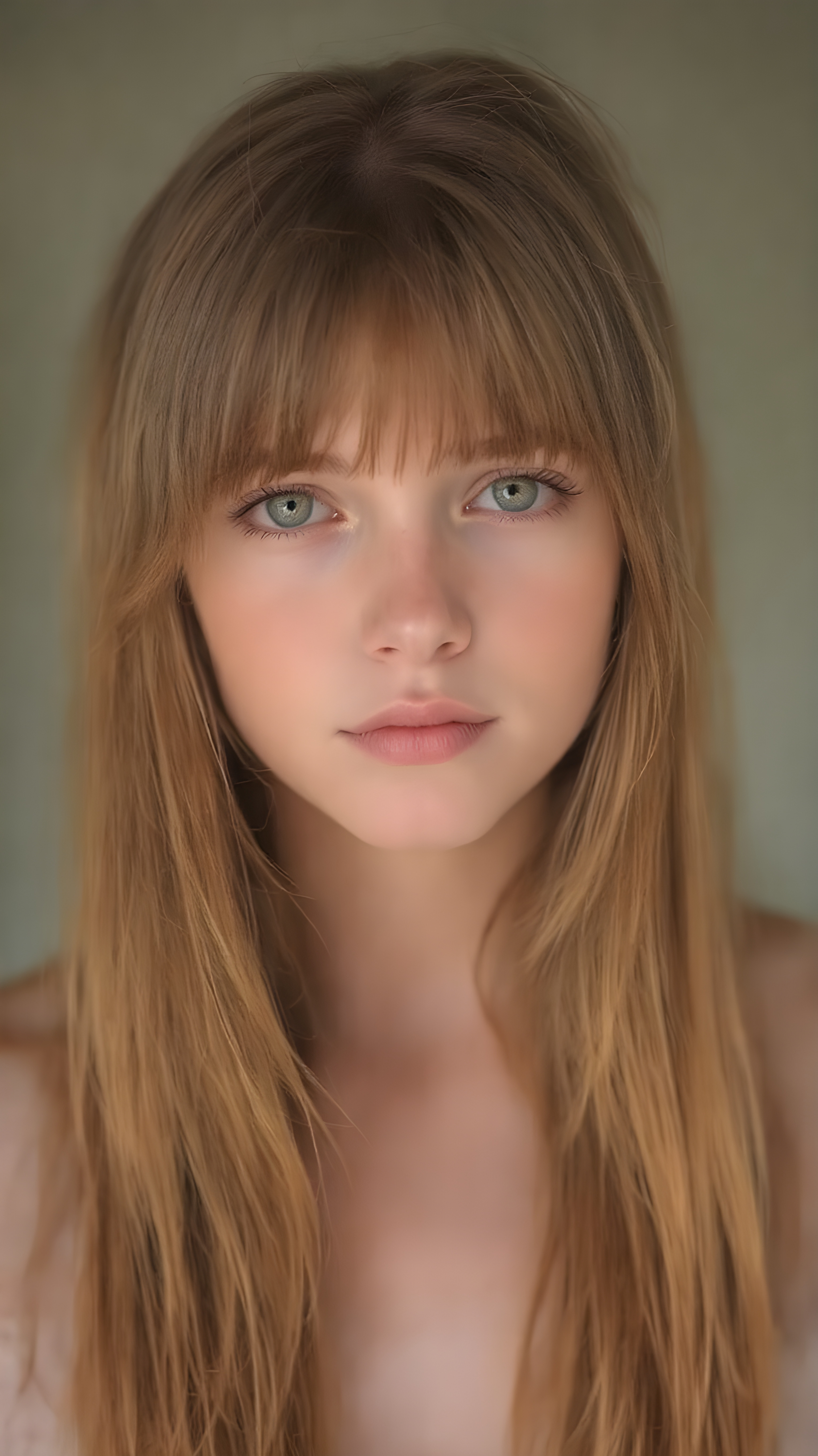 A (((highly detailed and realistic full-body photograph))), featuring a (((beautiful young girl))) with ((extremely long, thick, soft straight hair)) that flows down (soft and gentle) and perfectly natural (pale skin) that complements her flawless complexion, against a backdrop of natural light, with her ((natural ginger red hair)) artfully styled in a loose bangs frame her face beautifully, looks direct in your eyes