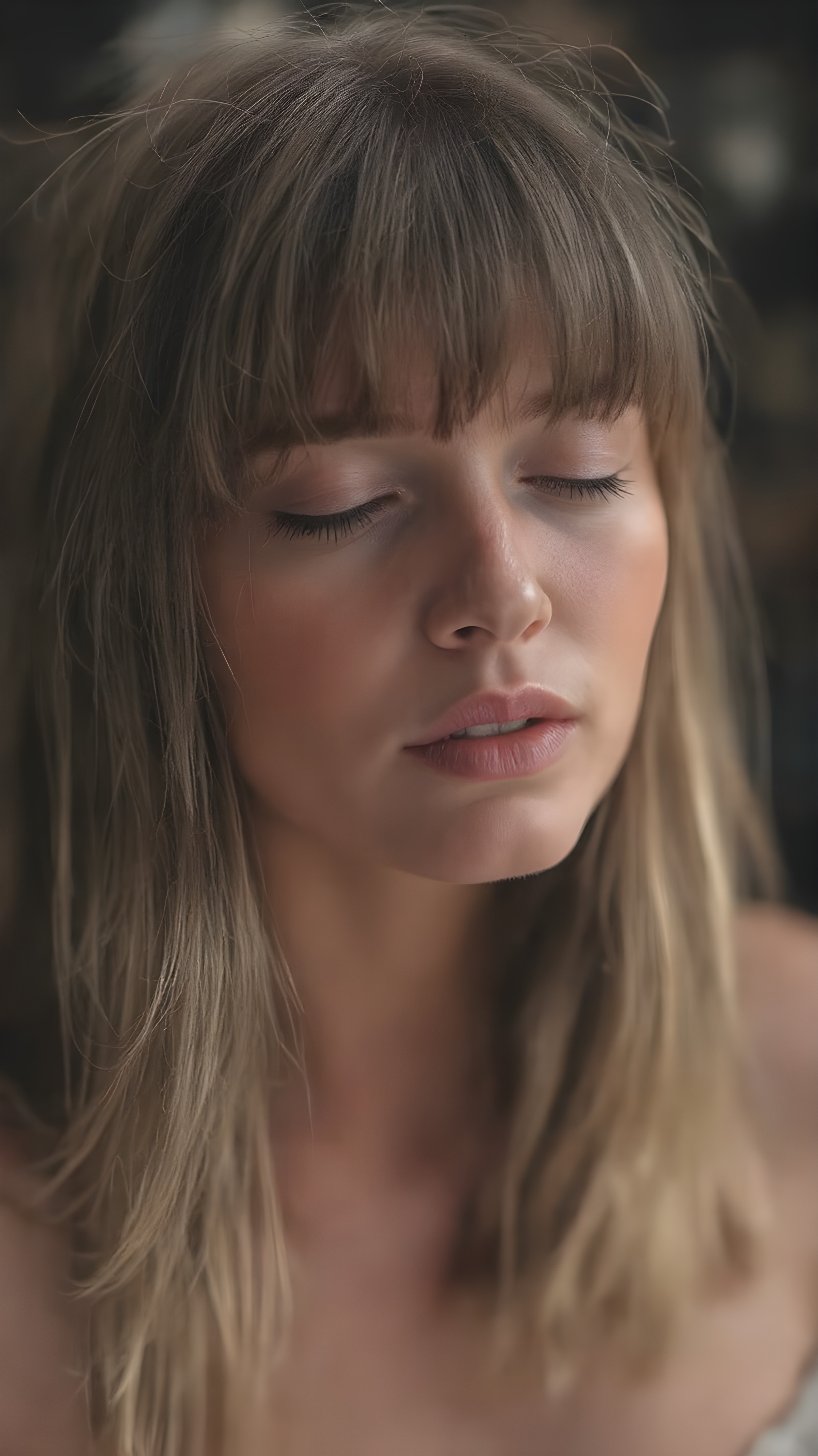 a girl with a beautiful pout, plump lips, long soft brown and blond hair in perfect bangs cut frame her round face, realistic and detailed, she wears a lifted cropped tank top, stunning female body, she waits seductively for a kiss with closed eyes and half open mouth