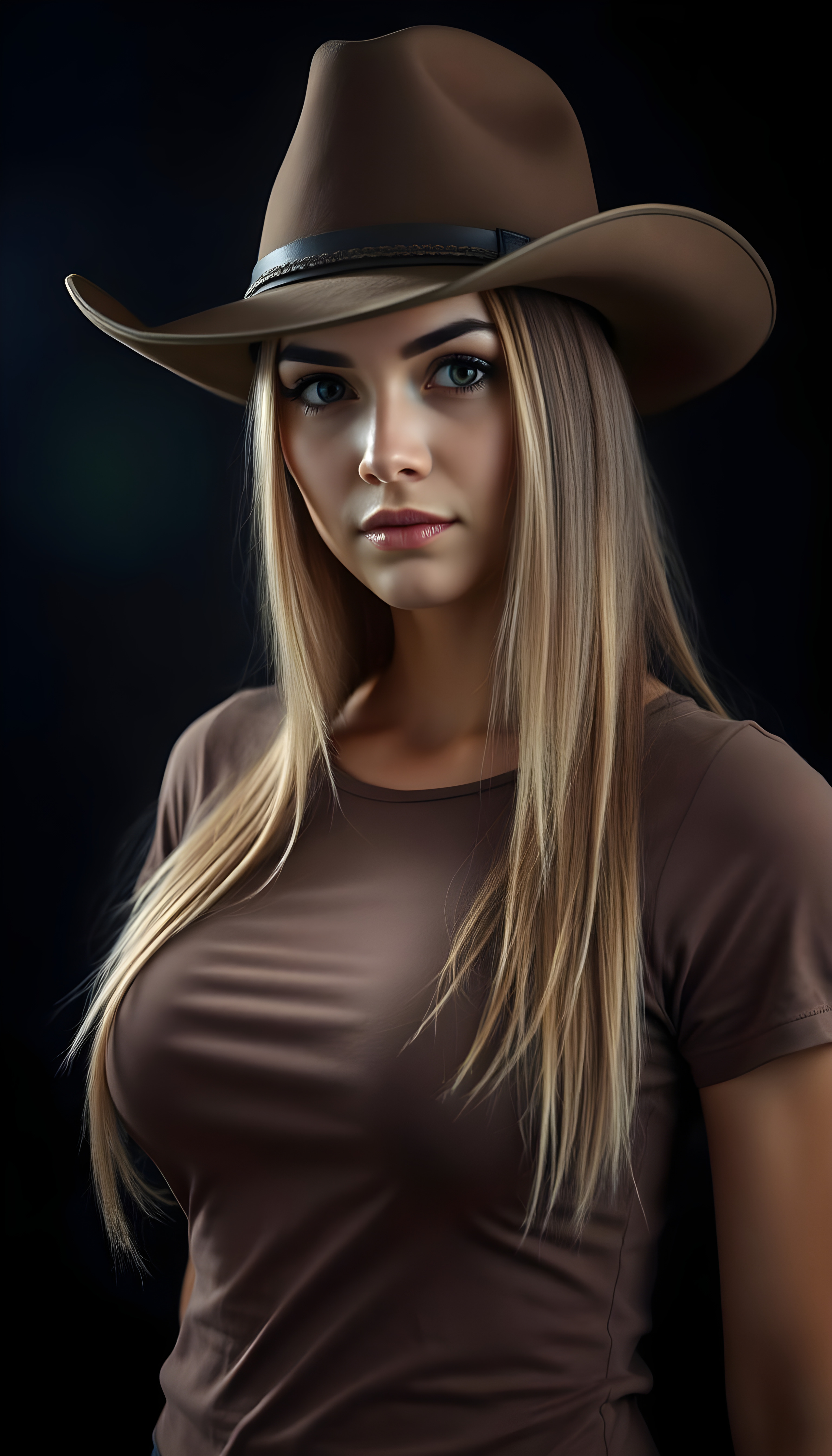 a well busty Cowgirl dressed in a brown thin t-shirt, brown leather hat, against a black background, shoulder long straight blond hair with brown highlights, perfect curved female body