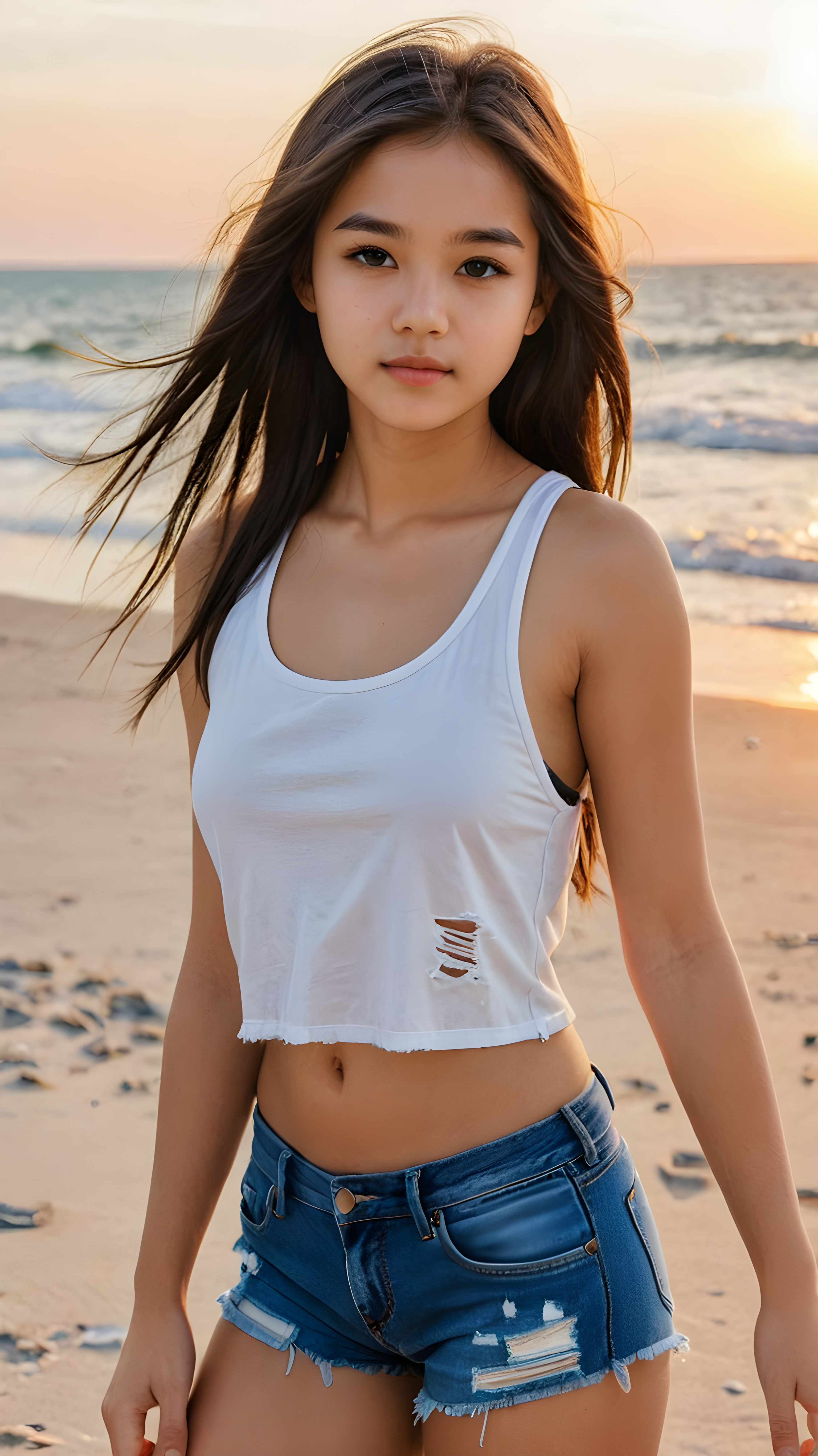 an Exotic young teen girl, long straight soft hair, 14 years old, ((round face)), looks seductively, ((tattered crop tank top)), perfect body, (stunning) (gorgeous) (on a sandy beach, beautiful sunrise OR sunset in background) ((detailed))