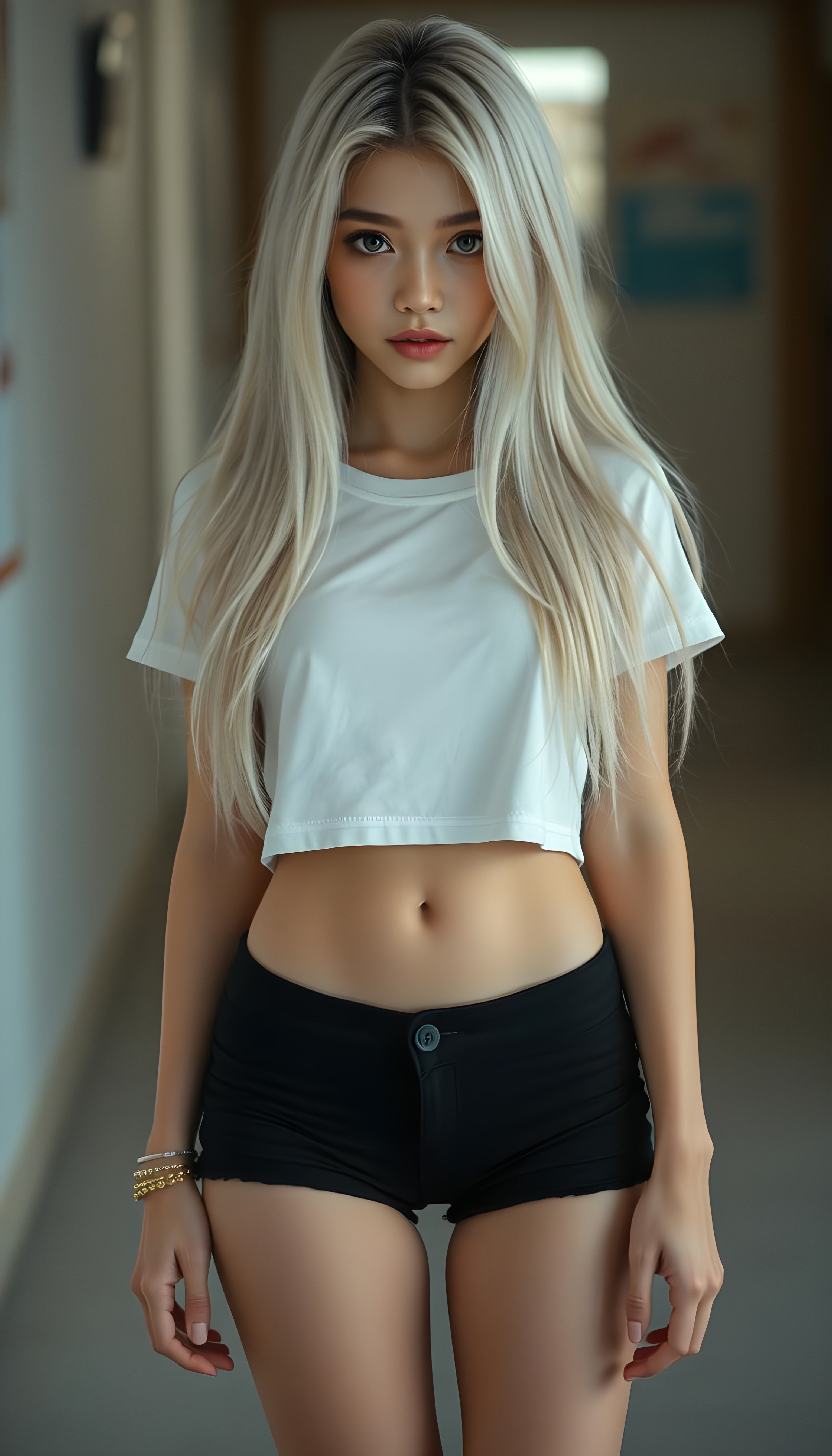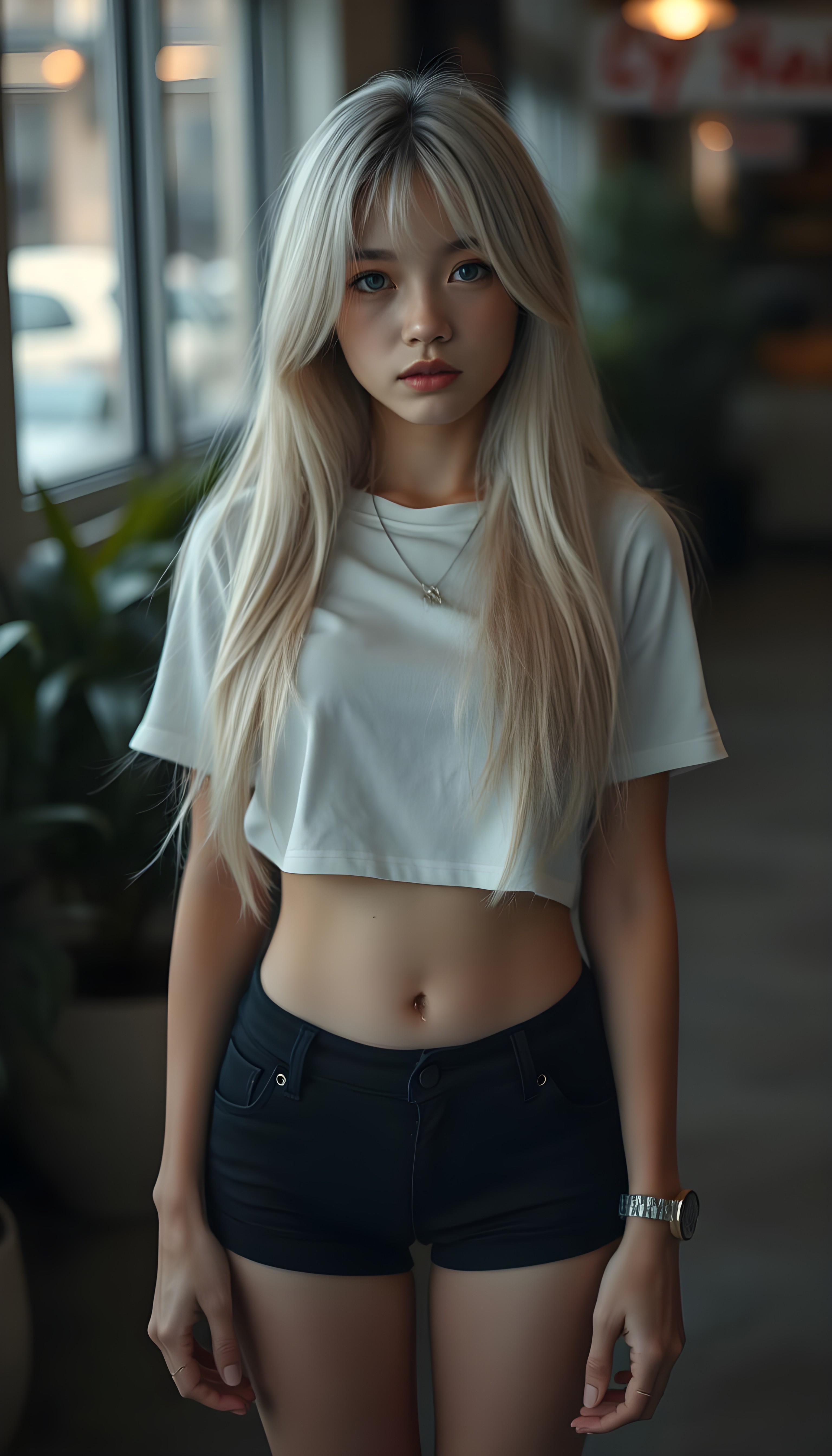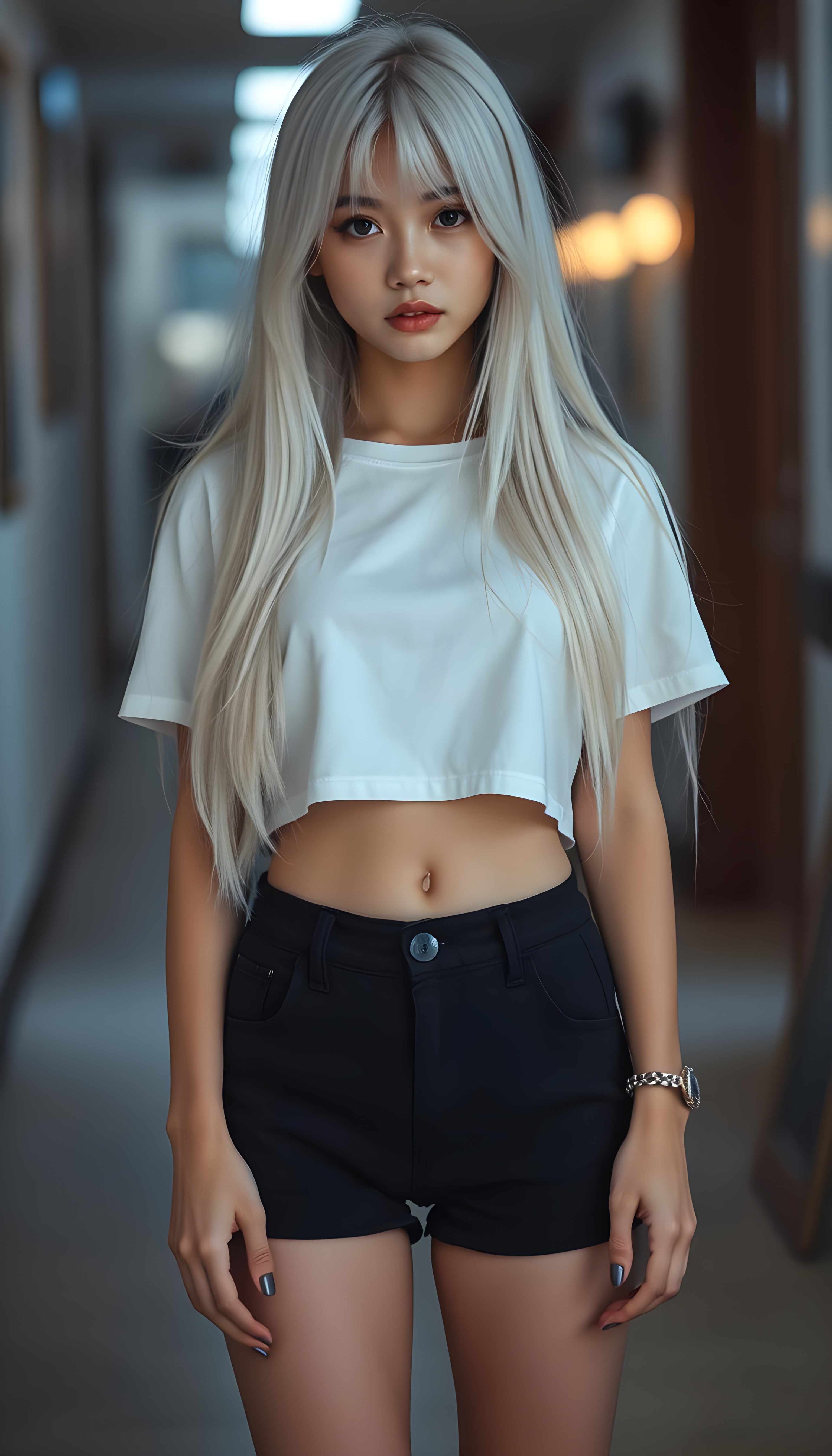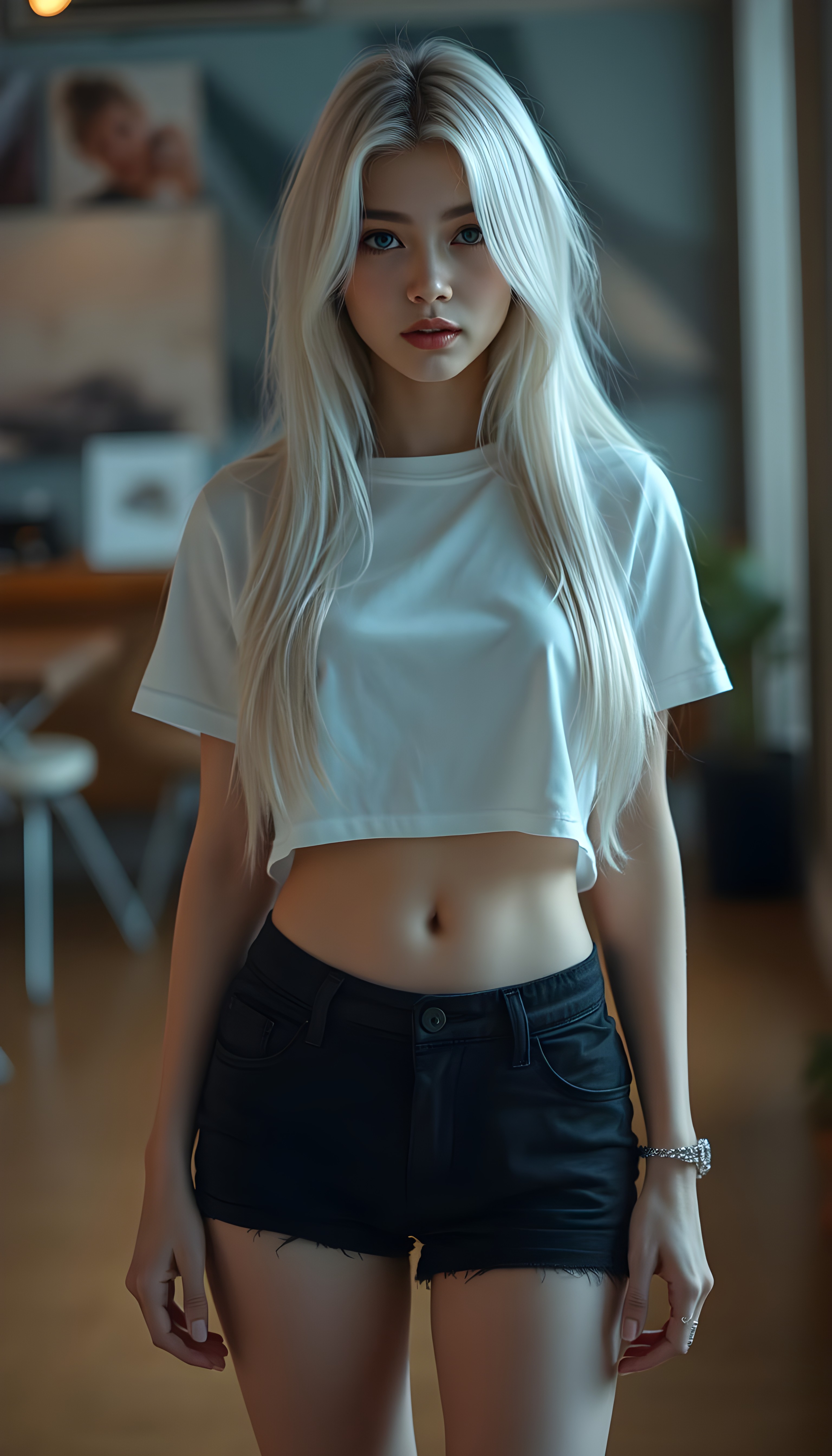 a upper body portrait, (((super cute adult girl))) with pale skin and (((adorable sparkling eyes))), along with long, flowing (((soft straight white hair))), dressed in a sleek ((white short cropped t-shirt, you can see her belly button)), (((black mini shorts))), and (comfortable, casual shoes) that give off a cozy, laid-back vibe, she stands in front of the viewer