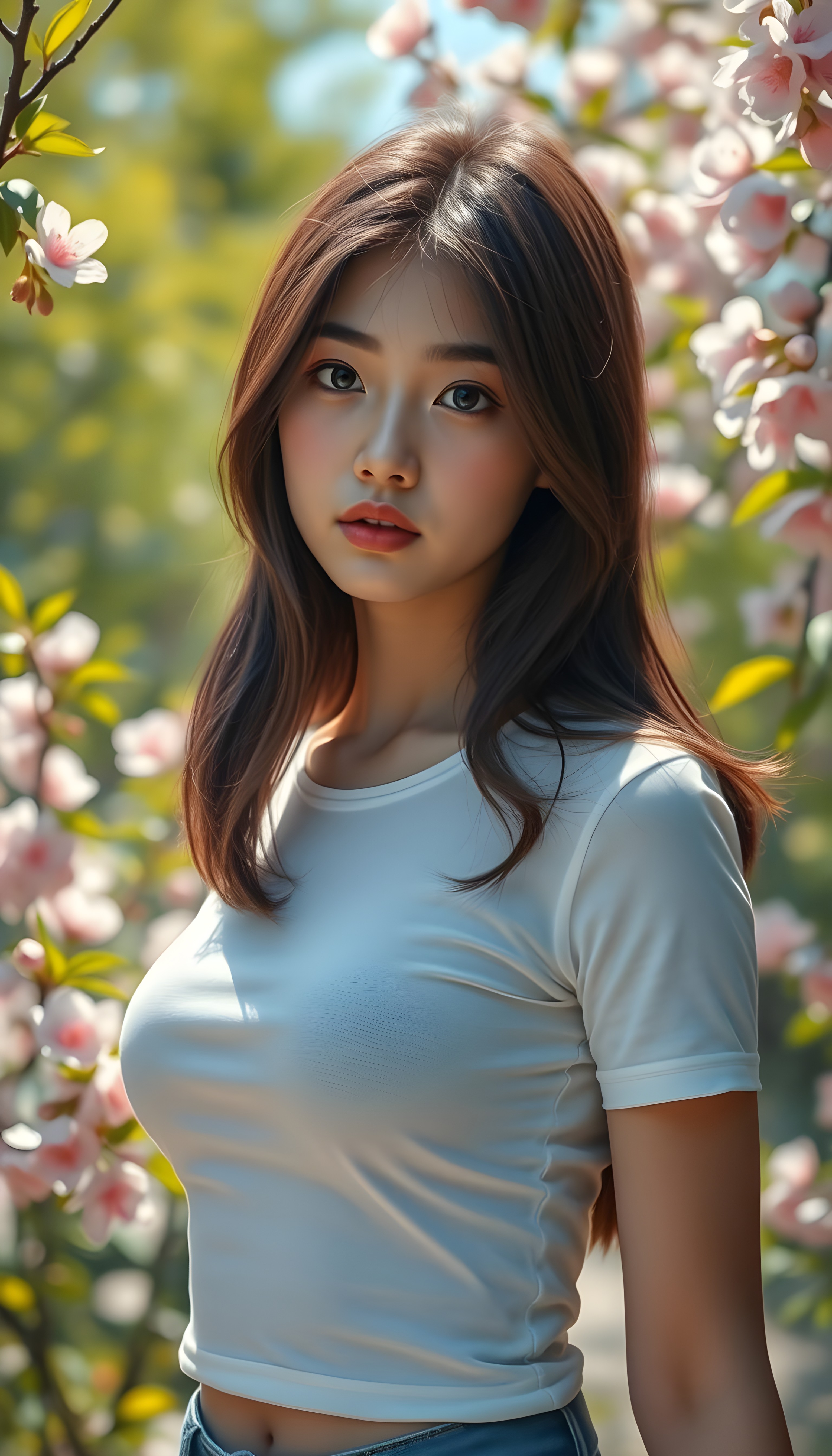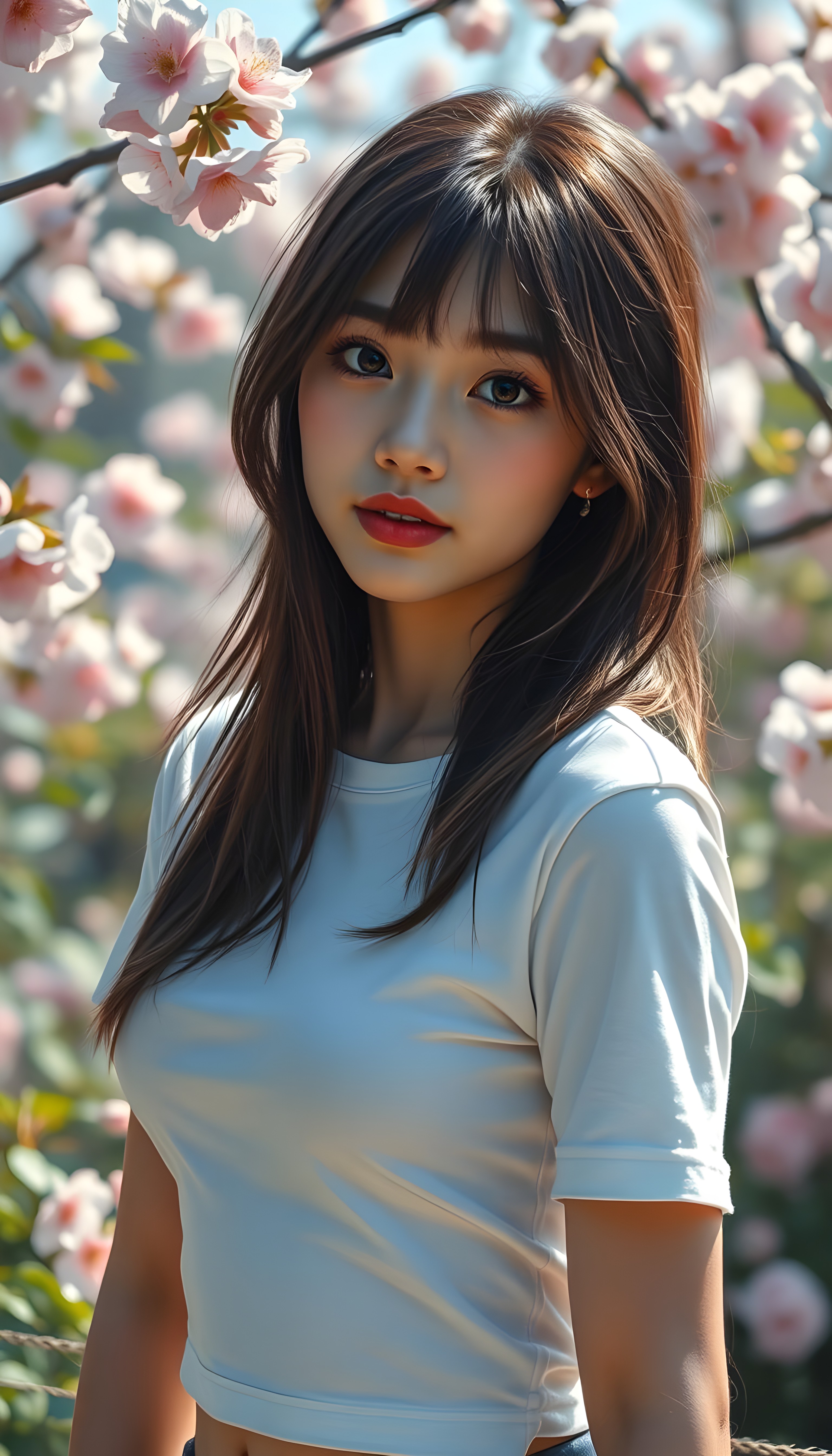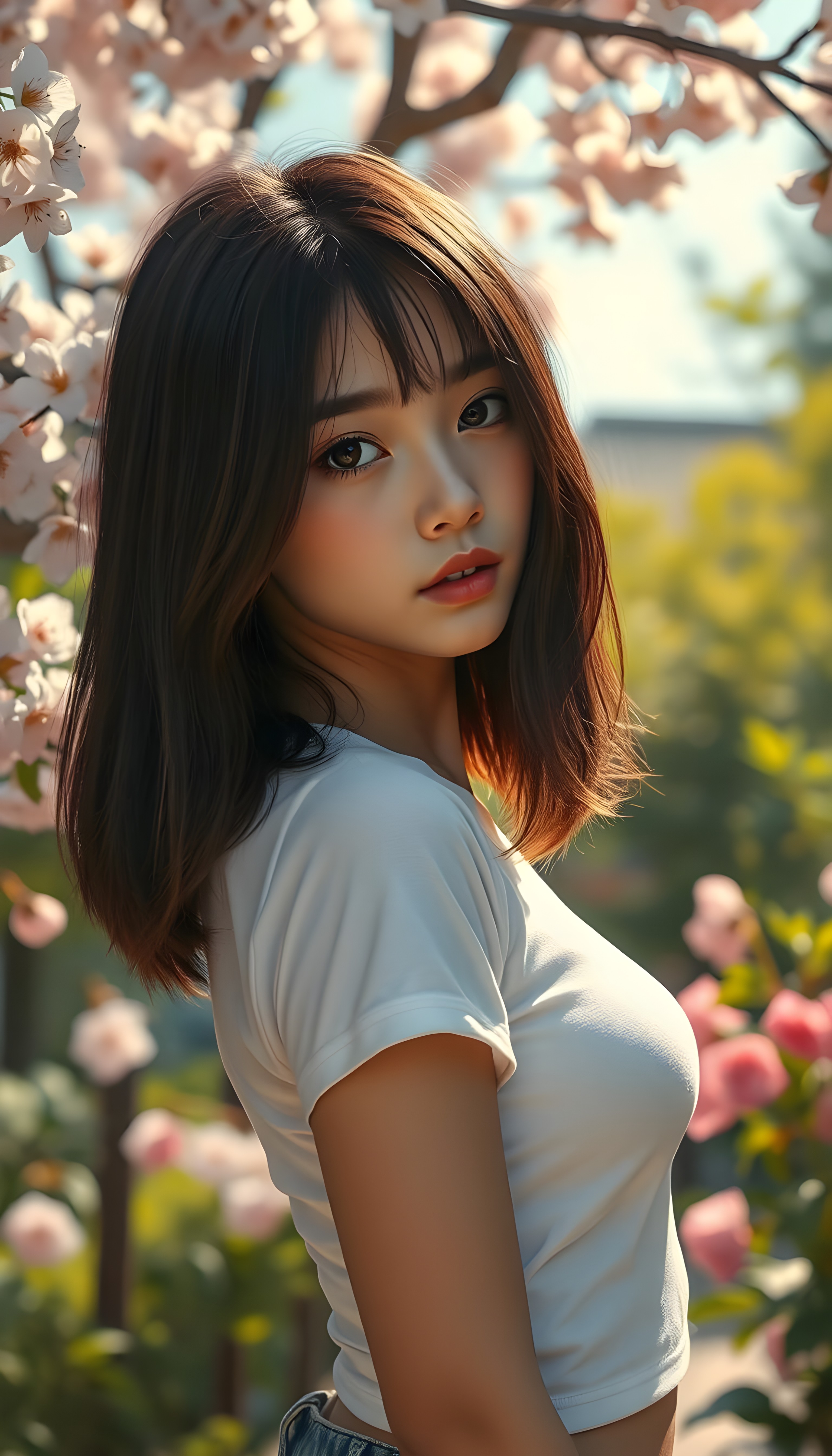 A stunningly elegant and cute Asian teenage girl with shoulder length, hazelnut full open hair and a round, angelic face gazes pensively at the camera. Her eyes are large and expressive, reflecting a mix of curiosity and introspection. She wears a super short, tight white t-shirt that accentuates her youthful figure. The background is a vibrant, sunlit garden with blooming cherry blossoms, adding a touch of serene beauty to the scene. The lighting is soft and natural, casting gentle shadows that highlight her features. She stands in a playful pose, with one hand resting on her hip, exuding confidence and charm. The image is imbued with a whimsical, dreamlike quality, blending realism with a touch of fantasy.