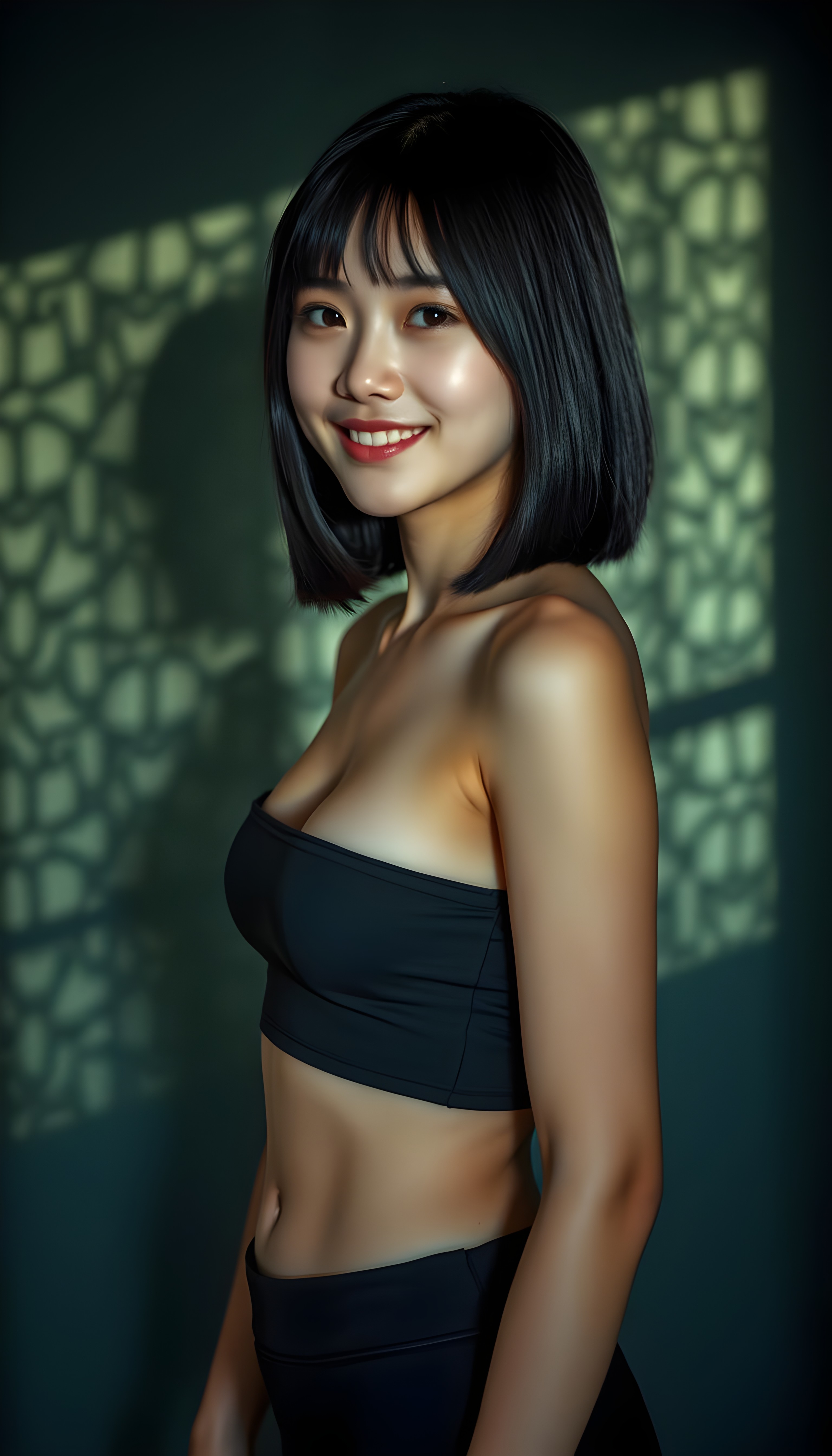 A young attractive girl, with softly black straight hair in a perfect shoulder-length bob cut and a perfectly curved body, wears a form-fitting, low-cut, sleek cropped tank top and a black short mini skirt. The vivid colors and high resolution make her look radiant, set against a deep, intricate shadow that highlights every detail. Her warm smile is captured in a side portrait shot, showcasing her stunning beauty and confidence. Side view. Round small belly button.