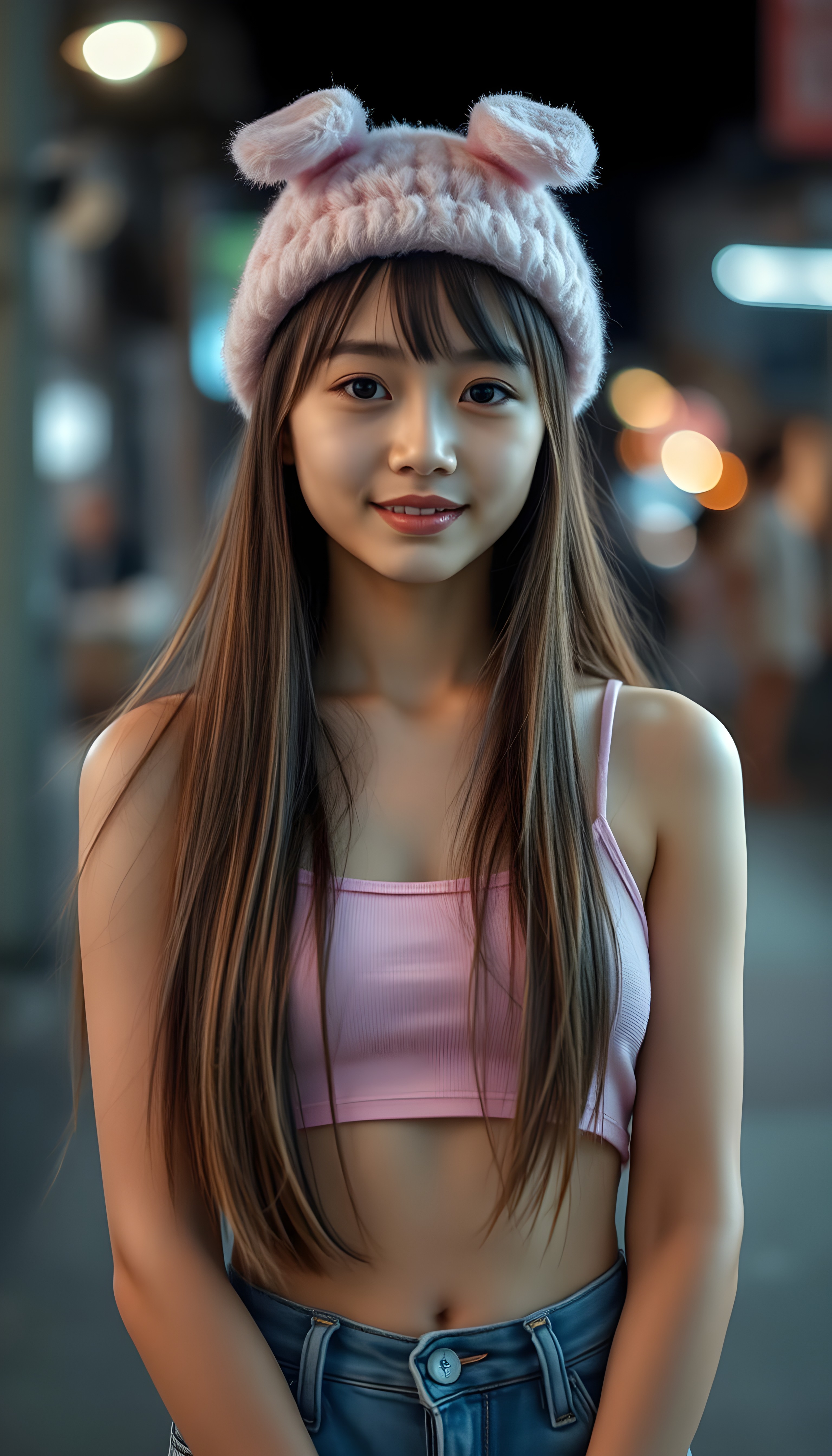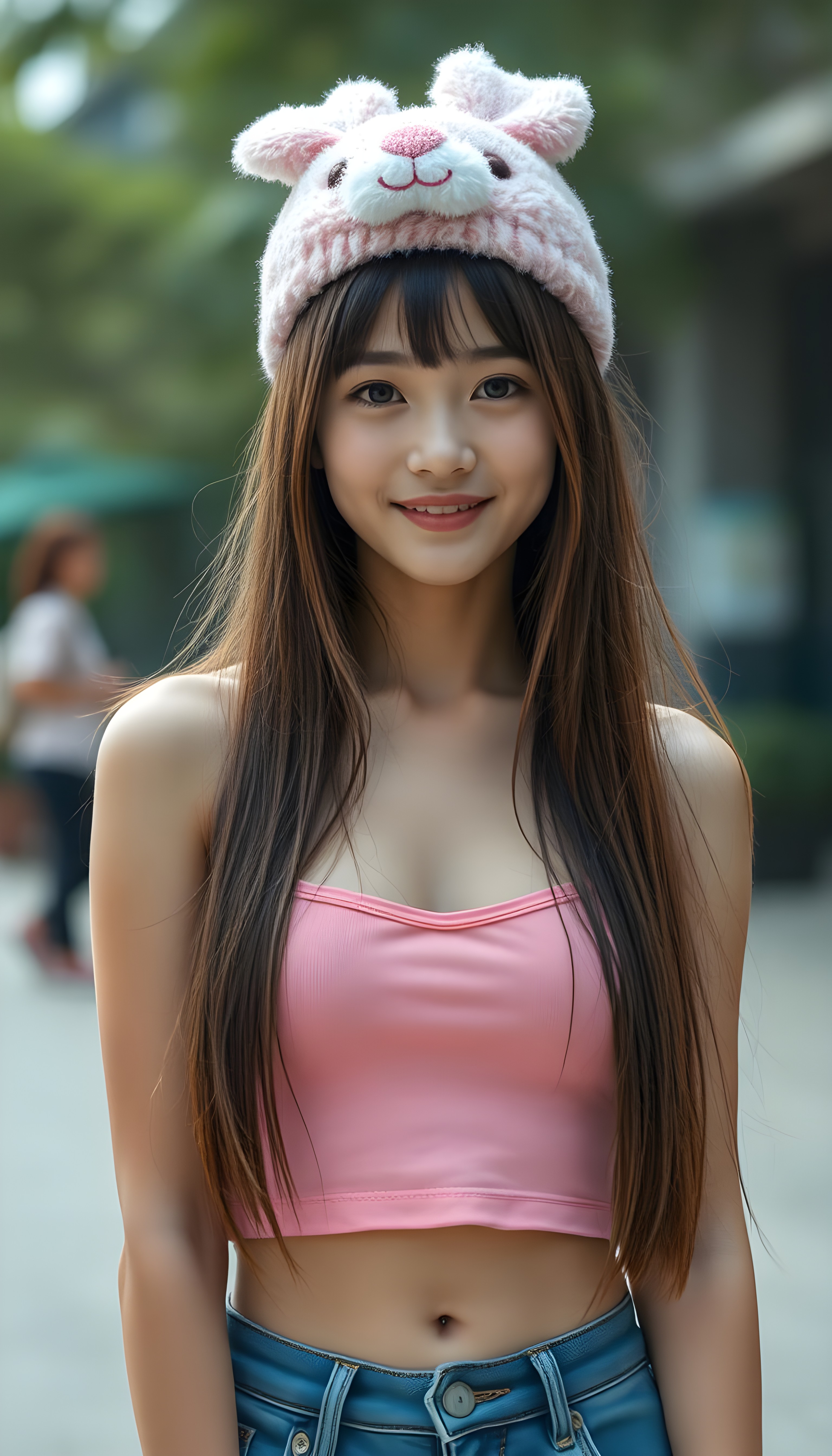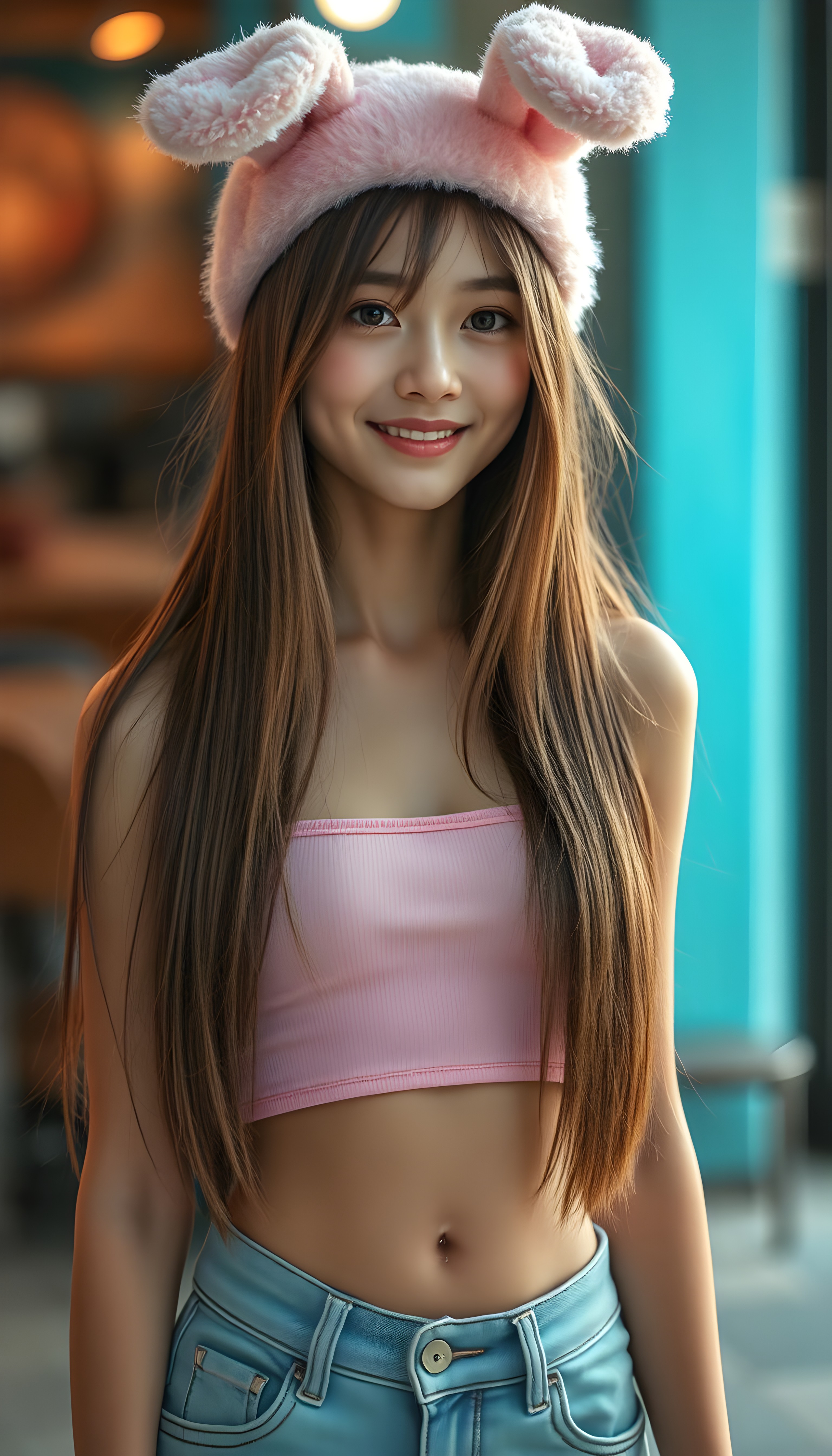 Full Body shot from a young Asian girl with long, straight open soft light brown hair and black highlights, wears fluffy small pink bunny ears cap and a pink spaghetti cropped tank top and pink jeans pants, shows her small belly button, sweat smile, dark eyes. Stunning, gorgeous. HDR and 4k.
