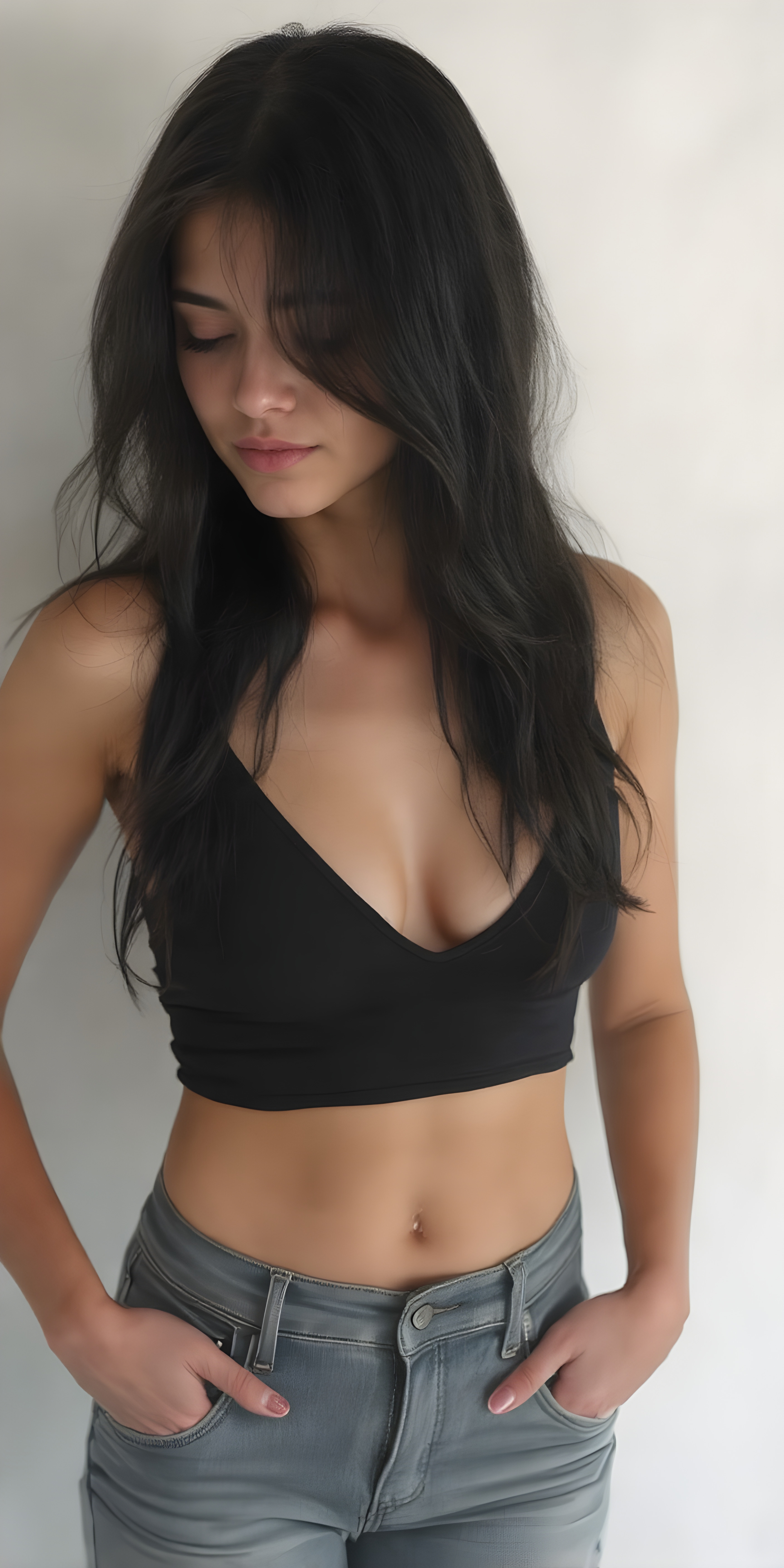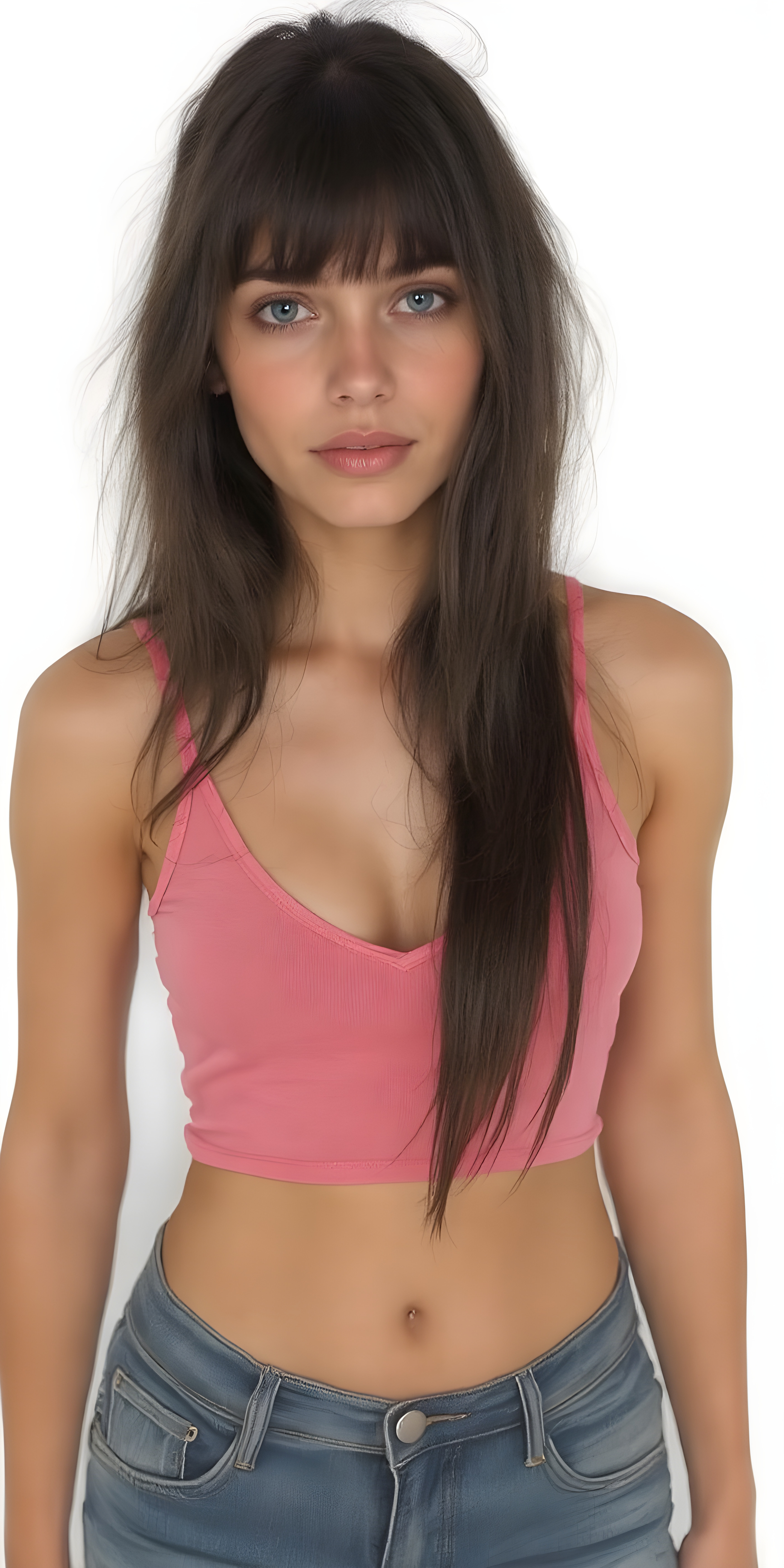 A (((full body image))) of a (((provocative dressed well busty teen girlie))), with (((long, flowing black hair))), (((blue eyes))), and (((perfectly proportioned features))), dressed in a (((pink thin tank top, deep v-neck))), (((short jeans pants))). The soft, natural lighting accentuates her youthful beauty and the intricate details of her feet and legs, stands in front of the viewer, white backdrop
