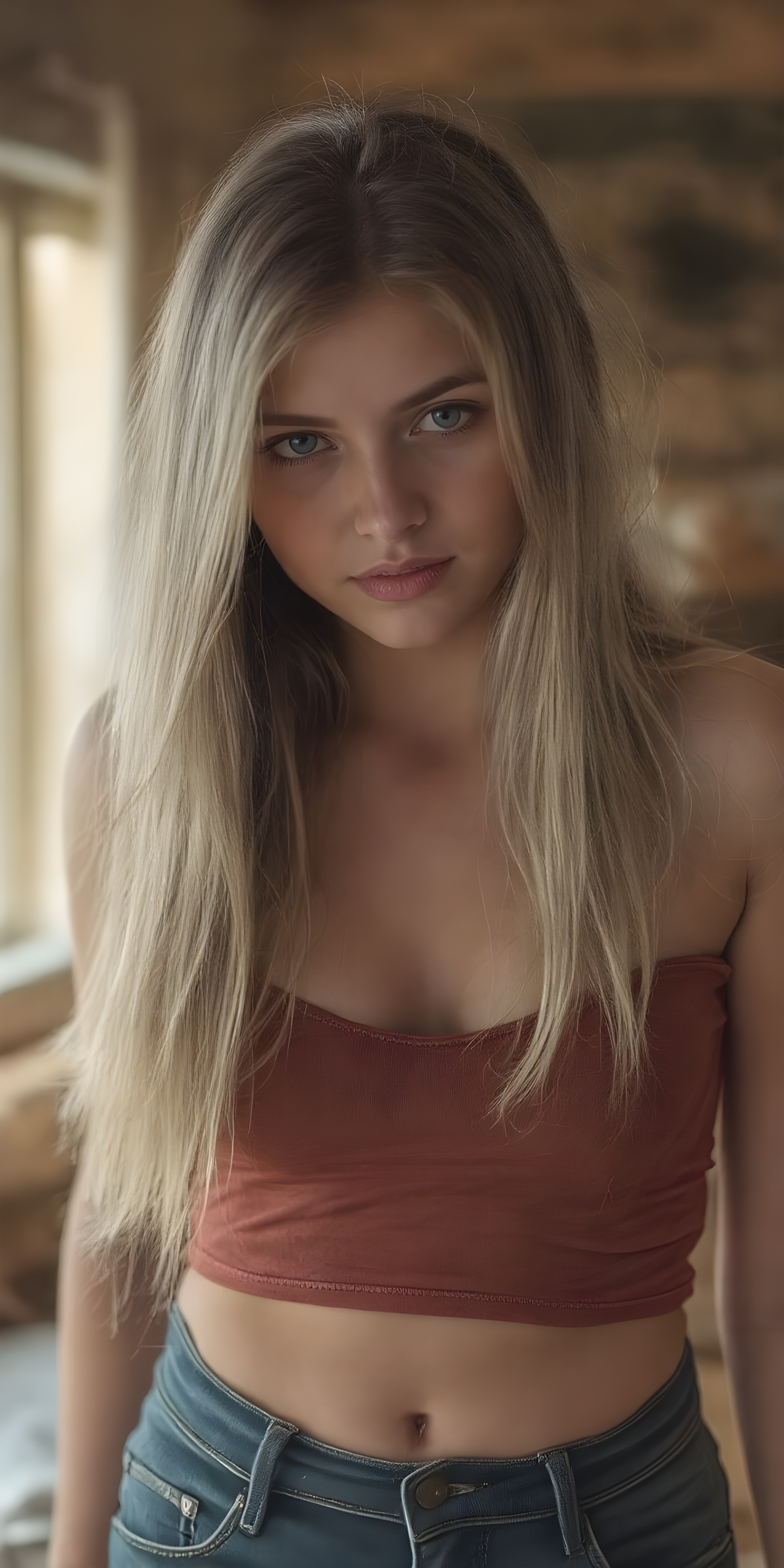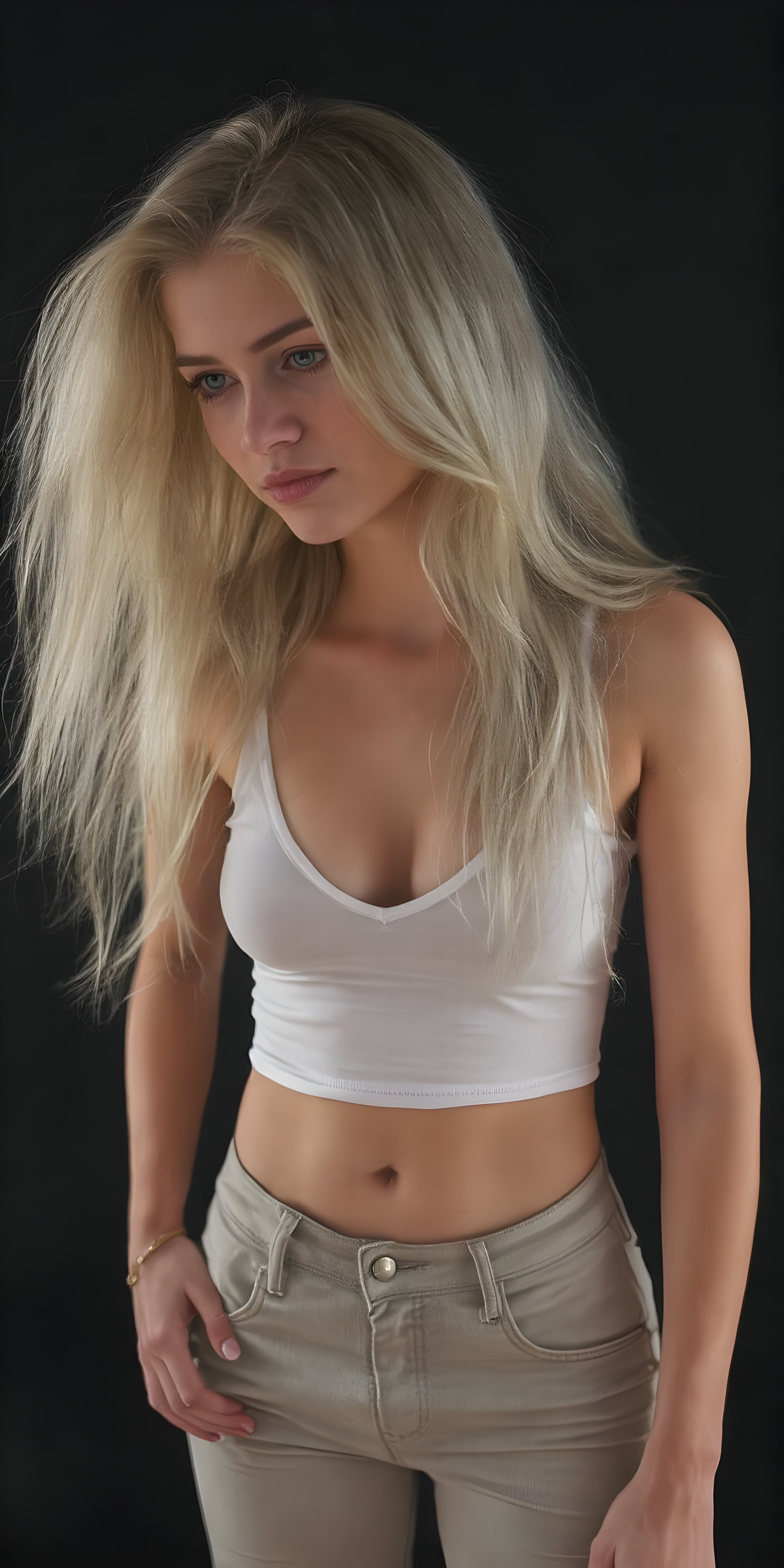 a young (((teen girl))), dressed in a mix of tightly-revealing (((cropped tank top))), jeans pants, with luxuriously long, straight soft blonde hair, perfect curved fit body, looks seductive, exposes her belly button
