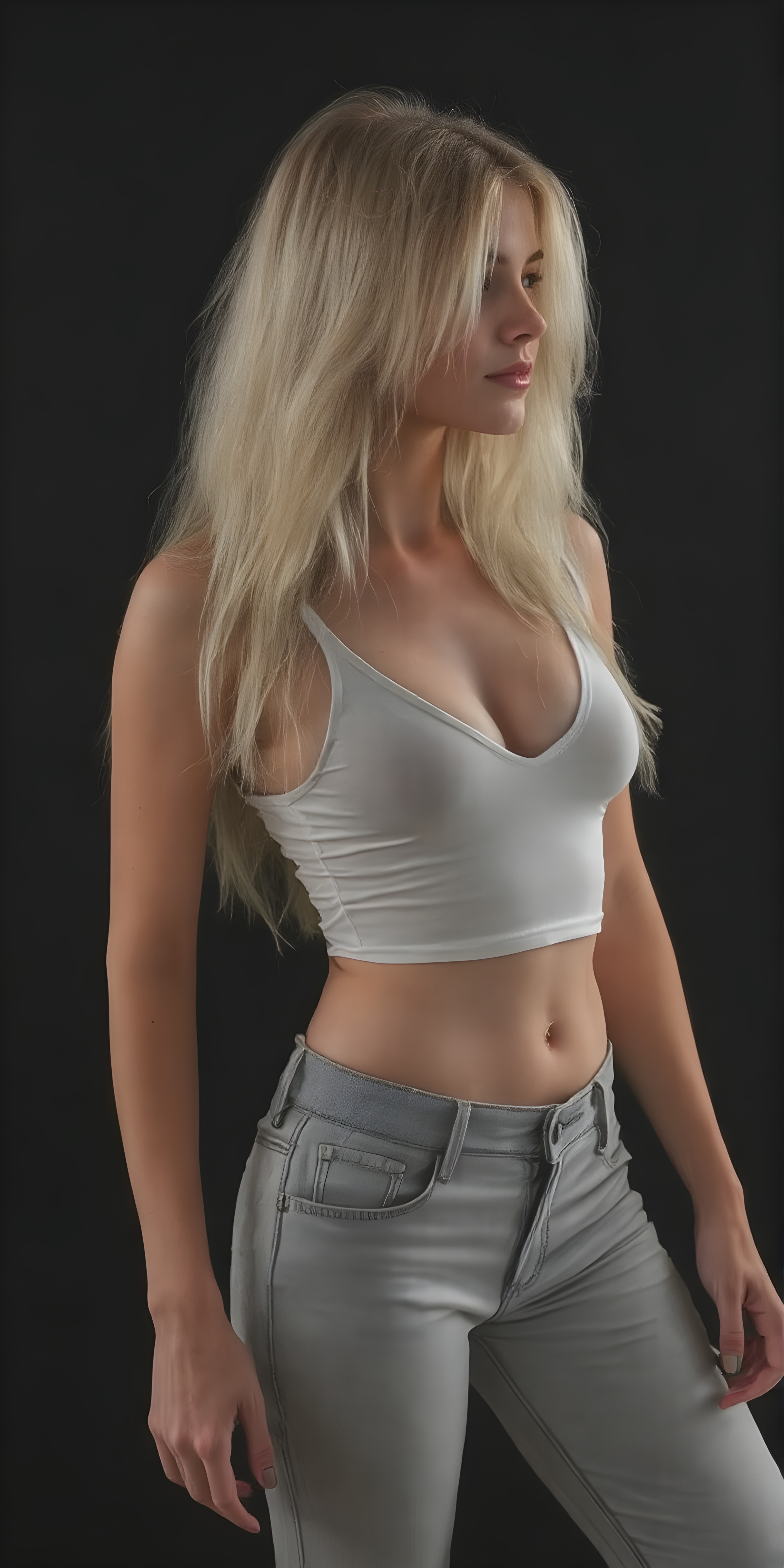 A (((full body image))) showcasing a beautifully busty (((teen girl with long, flowing black/white hair))), who exudes a sense of youthful vitality. Her legs and feet are exceptionally, with intricate details that match the high resolution and clarity of the overall image. She wears a (((a black/white thin tank top, deep v-neck, that emphasizes her slender and athletic form))). The low cut tank top provides a hint of a sculpted six pack and reveals her toned legs and toned feet. She wears the tank top with a matching pair of (((jeans pants))). The soft, natural lighting accentuates her youthful beauty. Standing in front of a white/black backdrop, side view