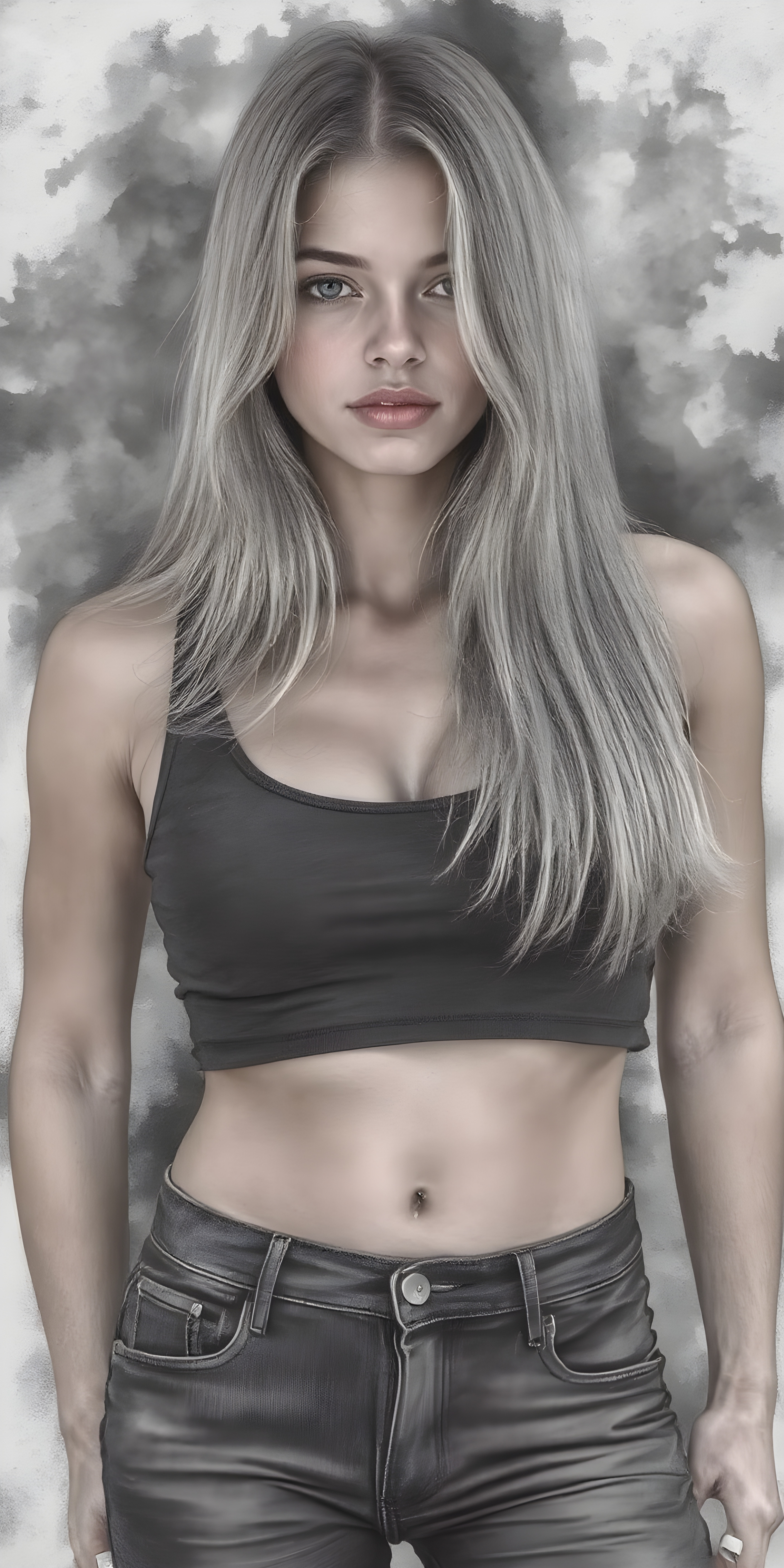 A (((professional full body hand charcoal drawing))) featuring a beautiful busty young teen girl, exuding seductive charm, in a mix of (((cropped tank top and tight jeans pants))), with luxuriously long, straight soft blonde hair flowing down to her waist, perfectly curved body, revealing her slender, yet beautifully proportioned belly button.