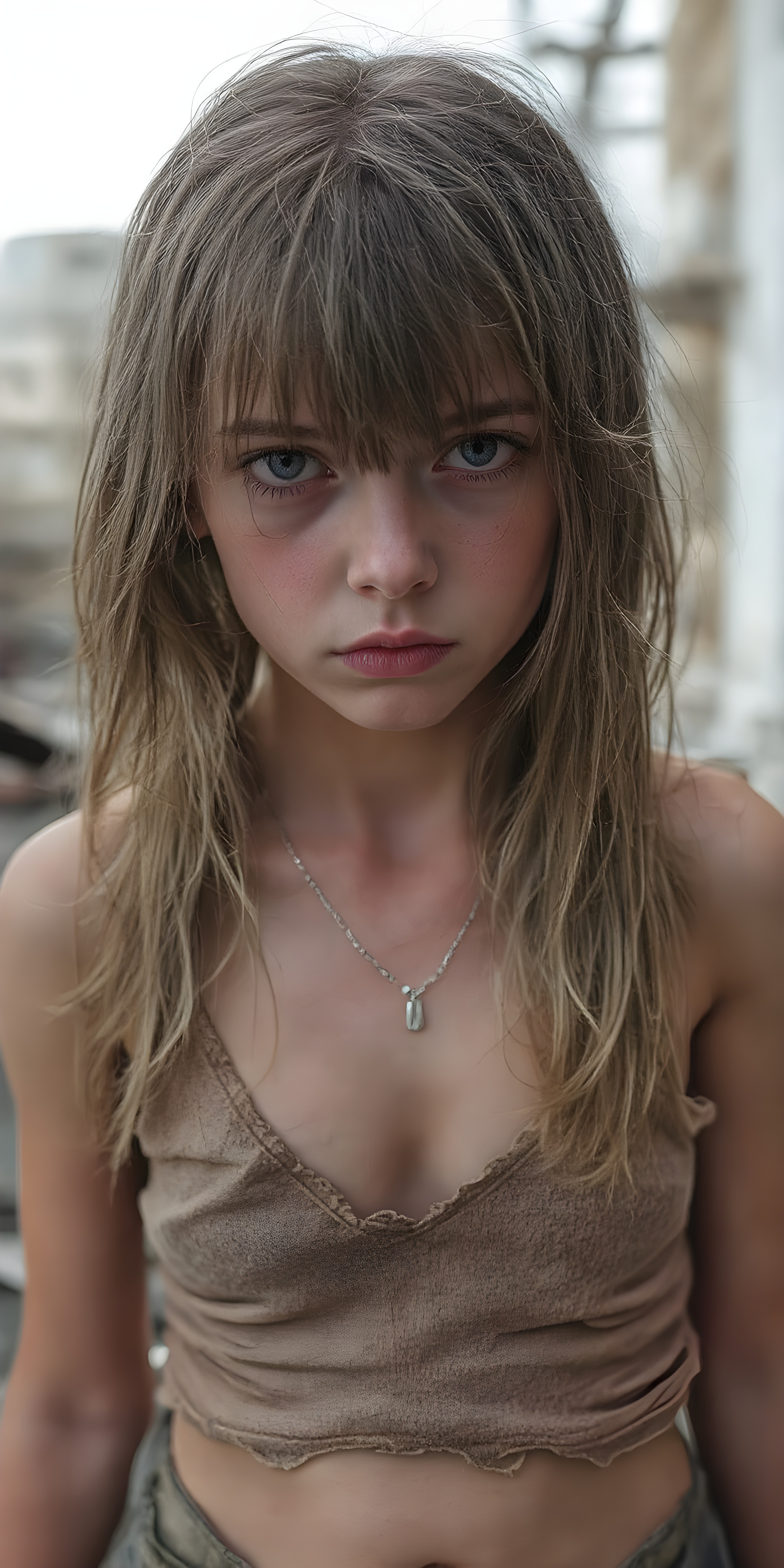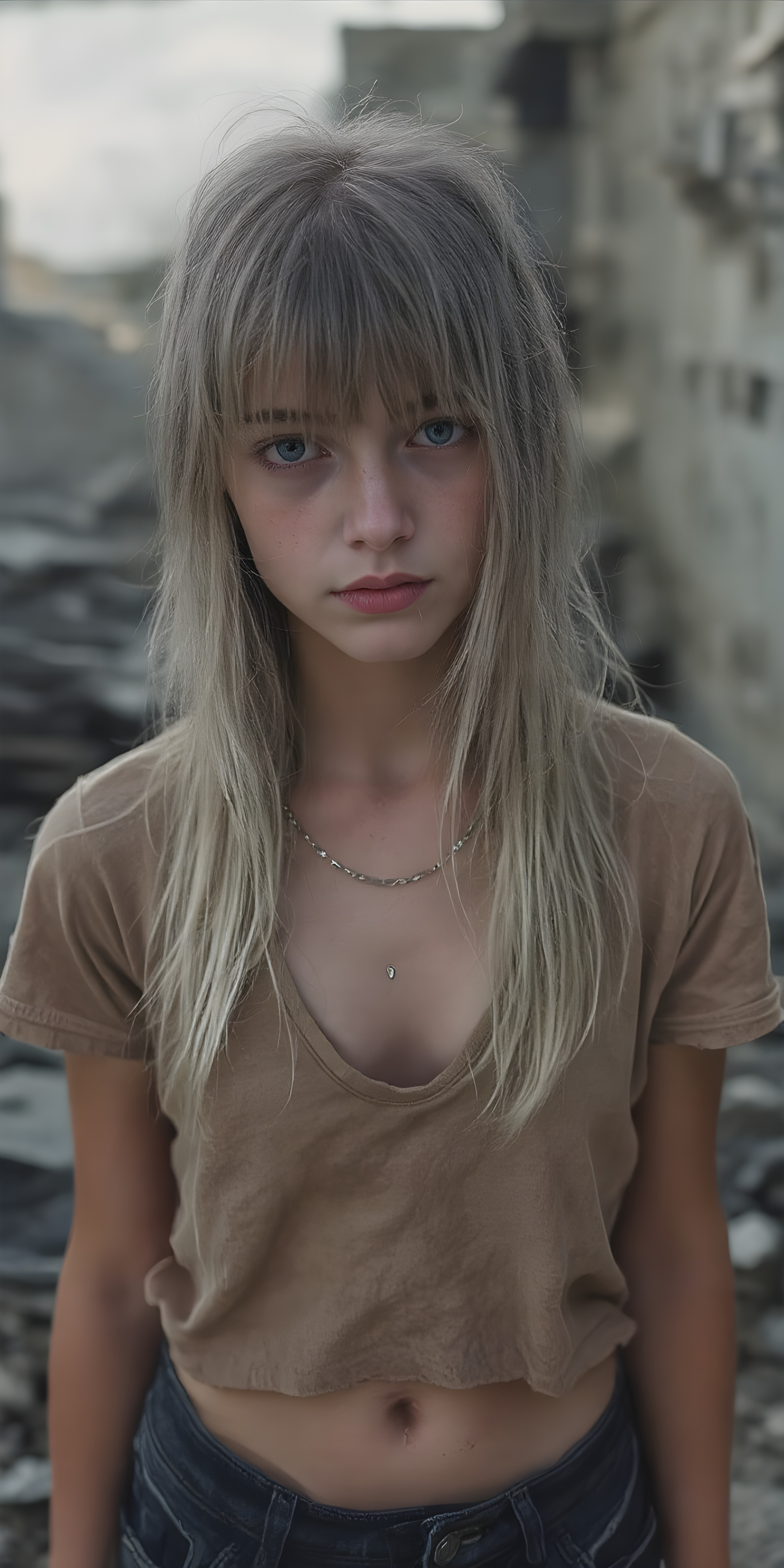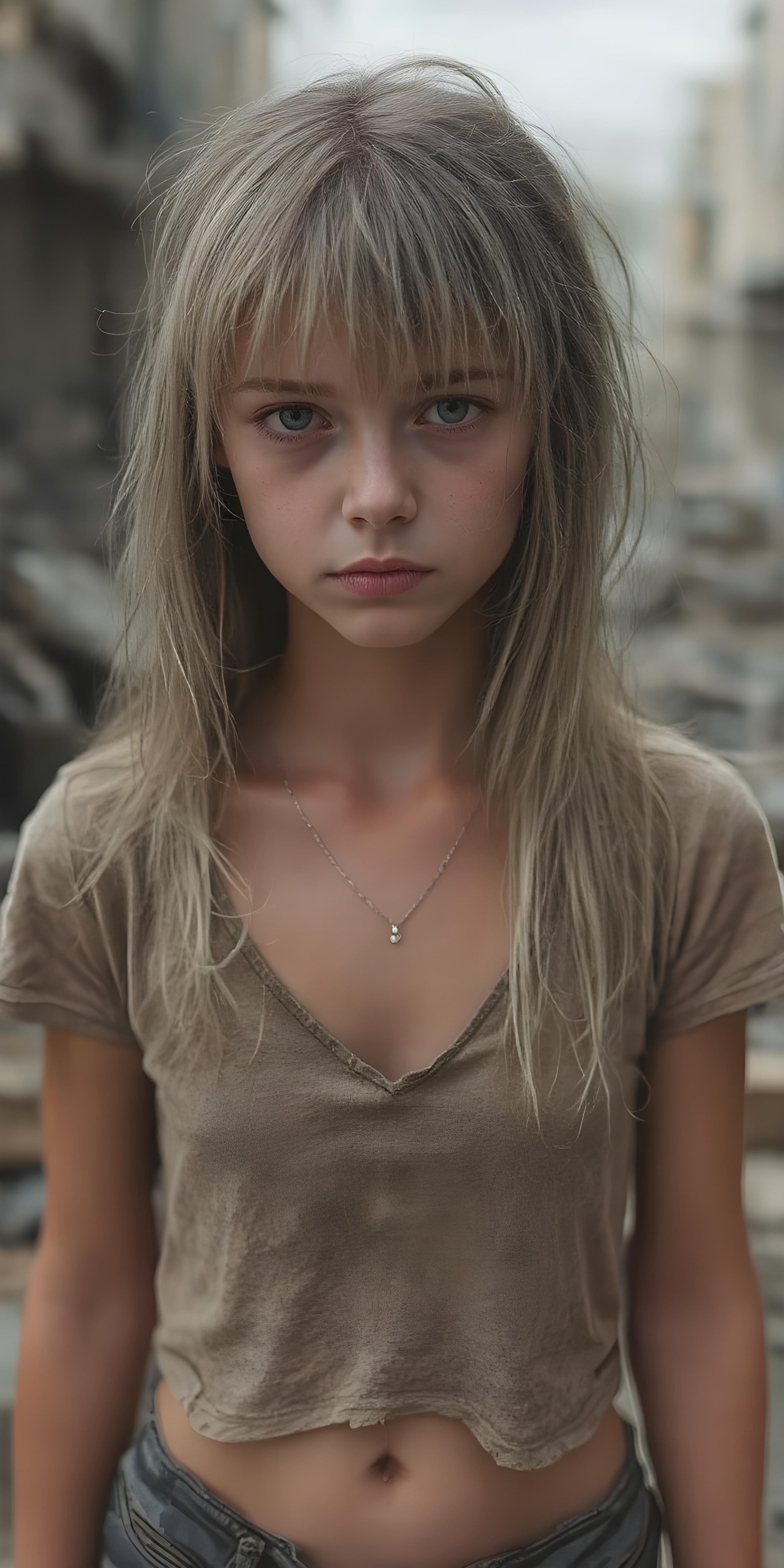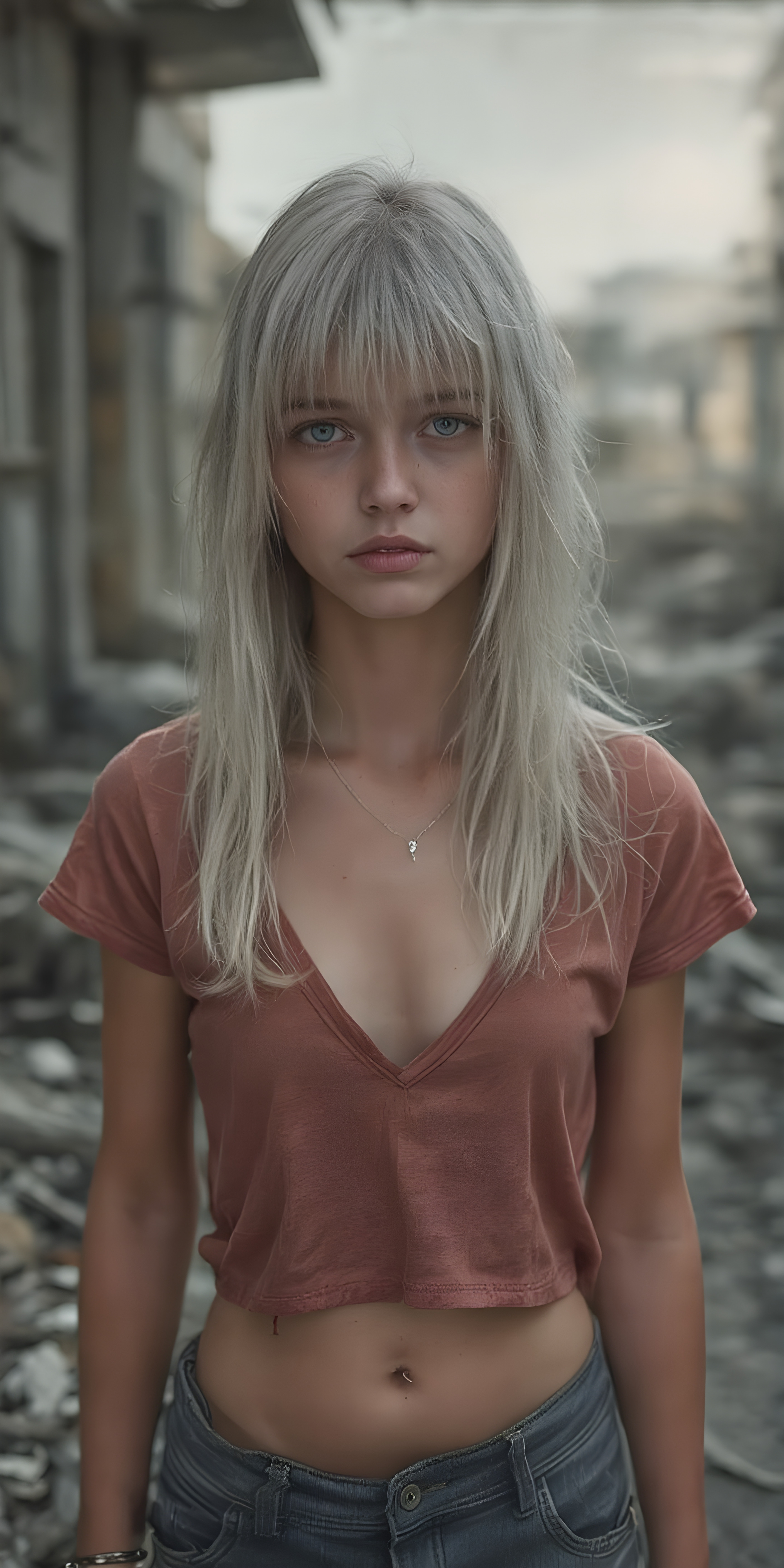 ((full body shot)) a poignant and emotionally resonant image portraying a young, abandoned, and destitute petite busty teen girl, clad in a tattered, short cropped t-shirt, deep v-neck, with very long, messy white wet straight hair, bangs frame her round face, showcasing her pale, emaciated, and slightly skeletal features. She stands in front, looking mournfully at the viewer, she stands in a destroyed and devastated city in the street, photo-realistic, high-resolution image, capturing the essence of a teenager’s psychological and emotional state, she has a perfect curved female body, realistic colors, perfect light and shadows, wears a fine silver necklace, shows her perfect belly button