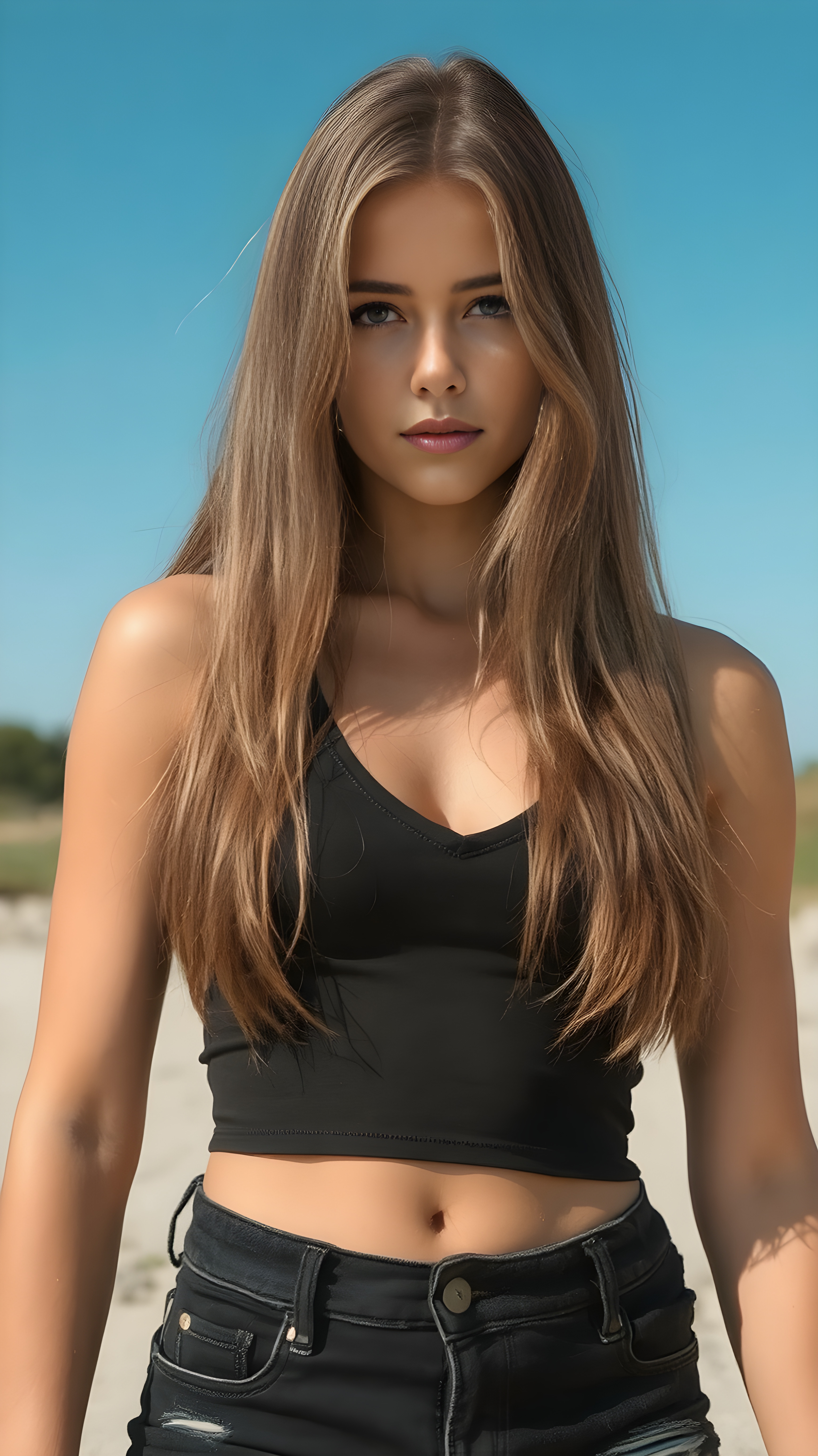 a (((extremely detailed and realistic full body photograph))), featuring a (((cute well-busty teen girl))) with (((long, straight soft brown-blond hair))), luxurious and glossy lips, clad in a (((deep v-neck cropped tank top))), ((letting her shoulders and abs show through her hair)), paired with (((black tattered denim shorts, you can see her belly button)), posed casually in a (warm sunny day) under a clear blue sky