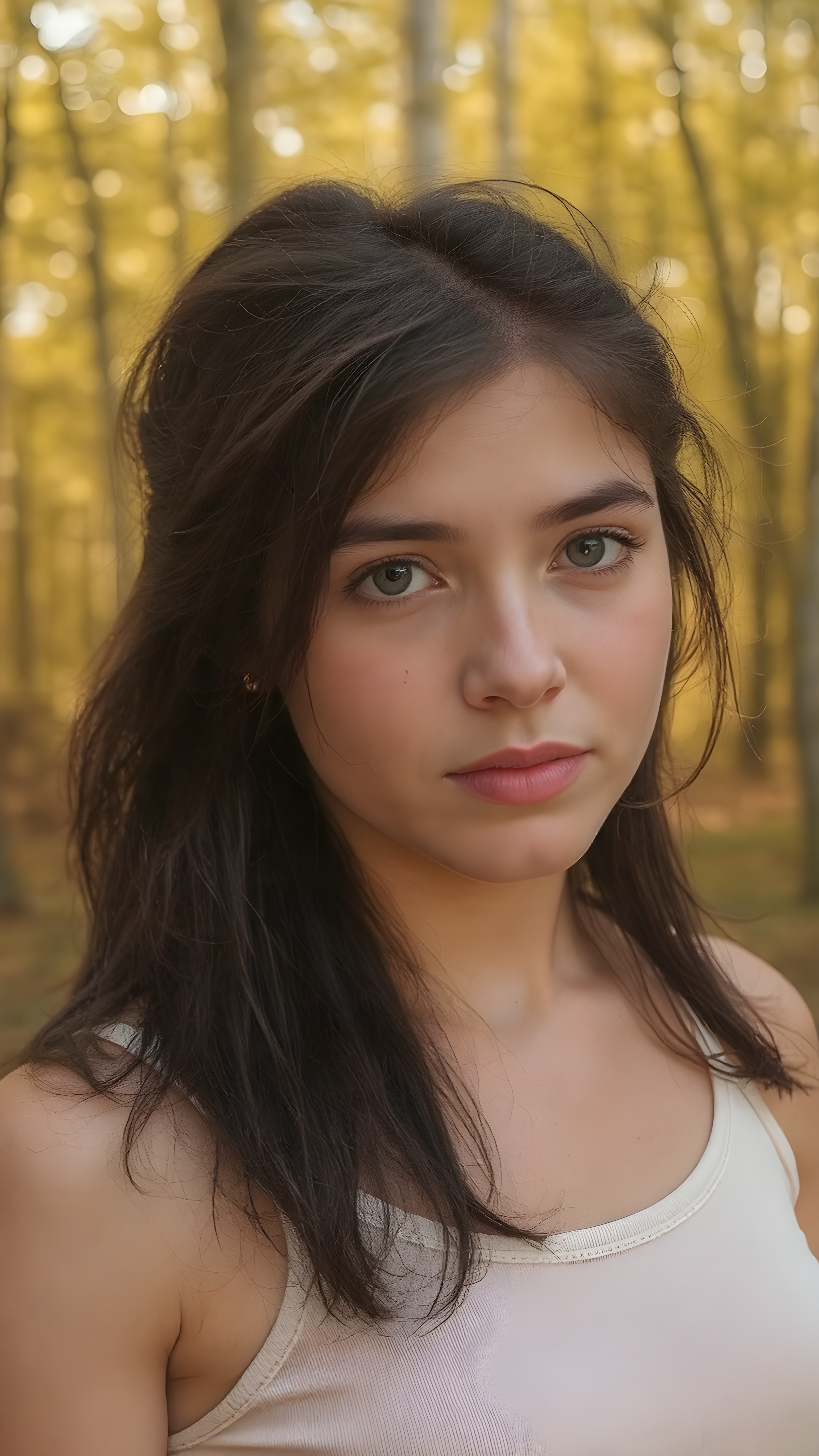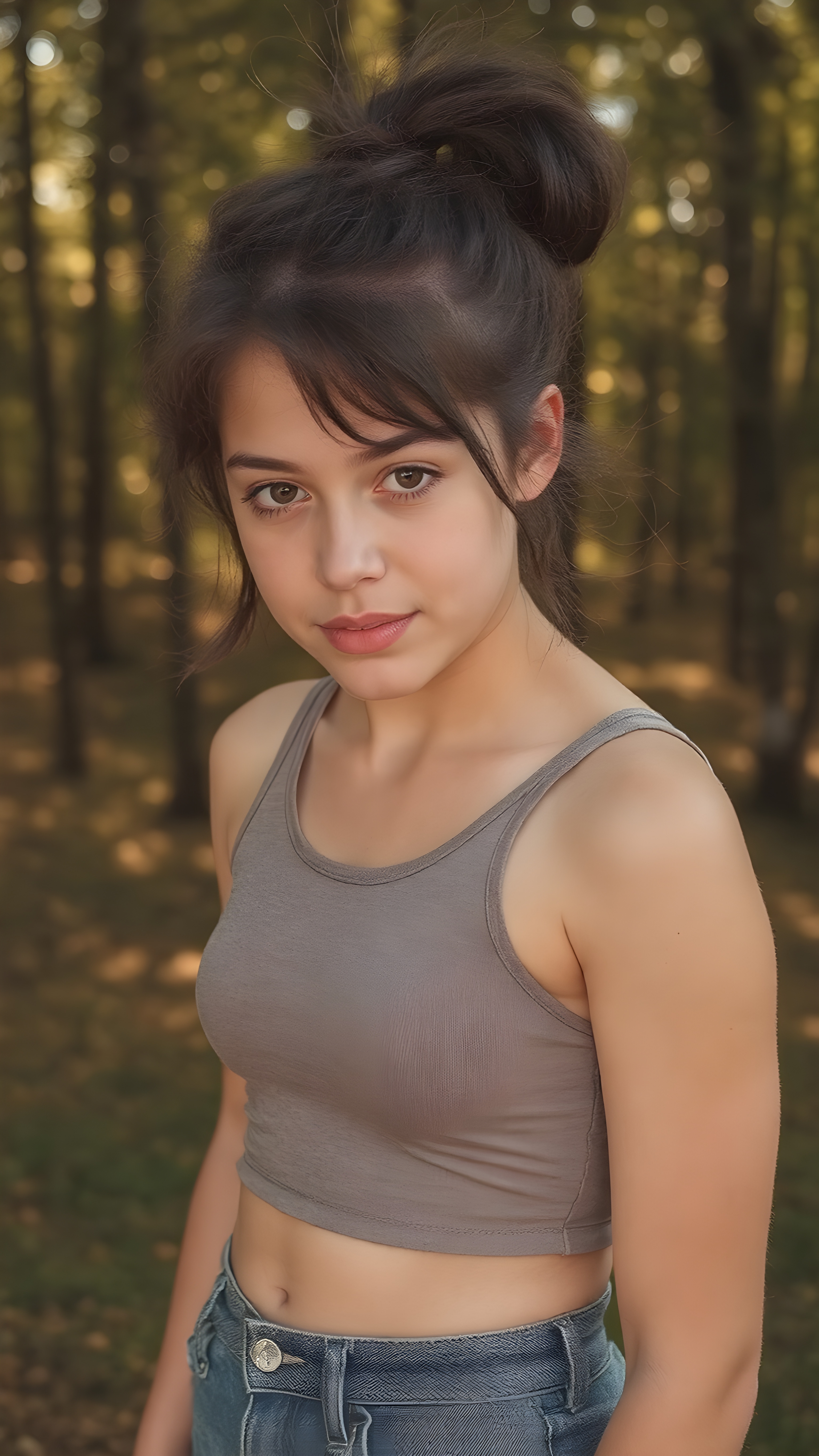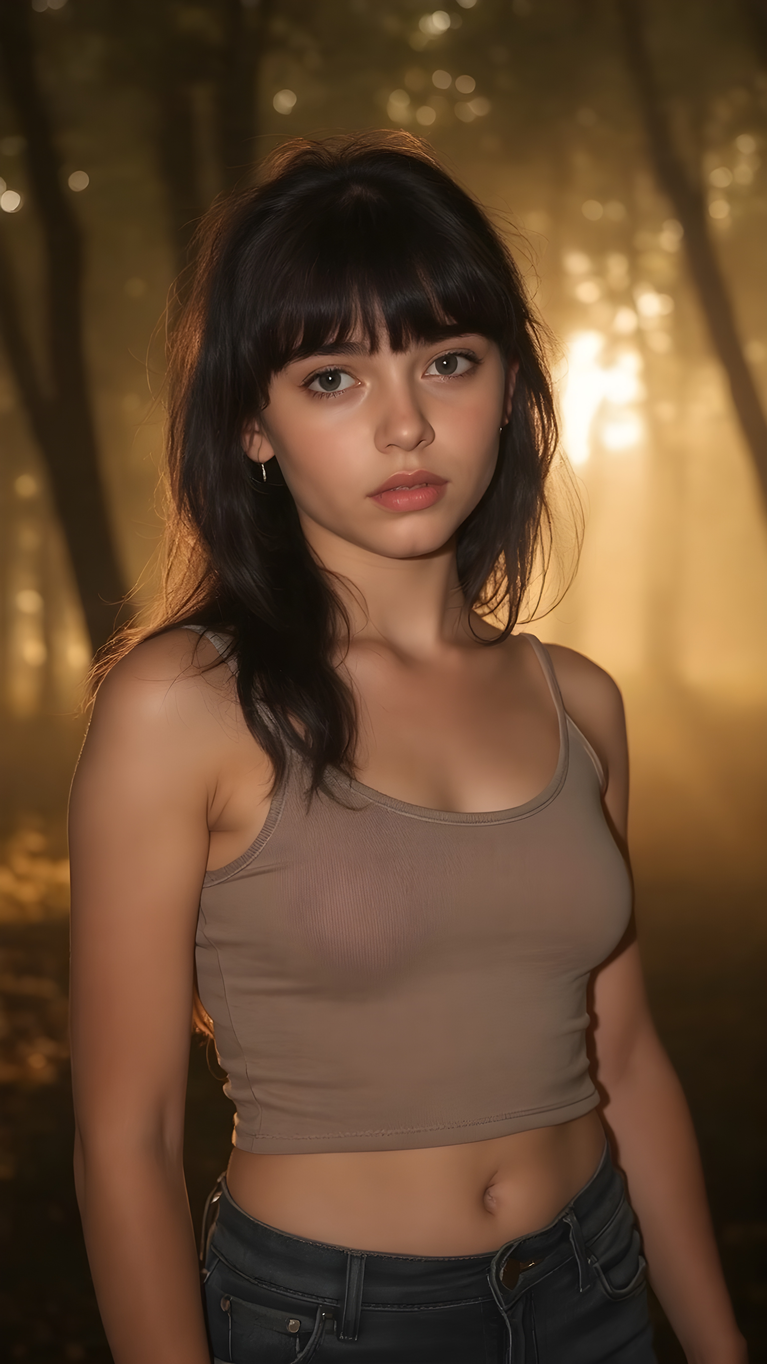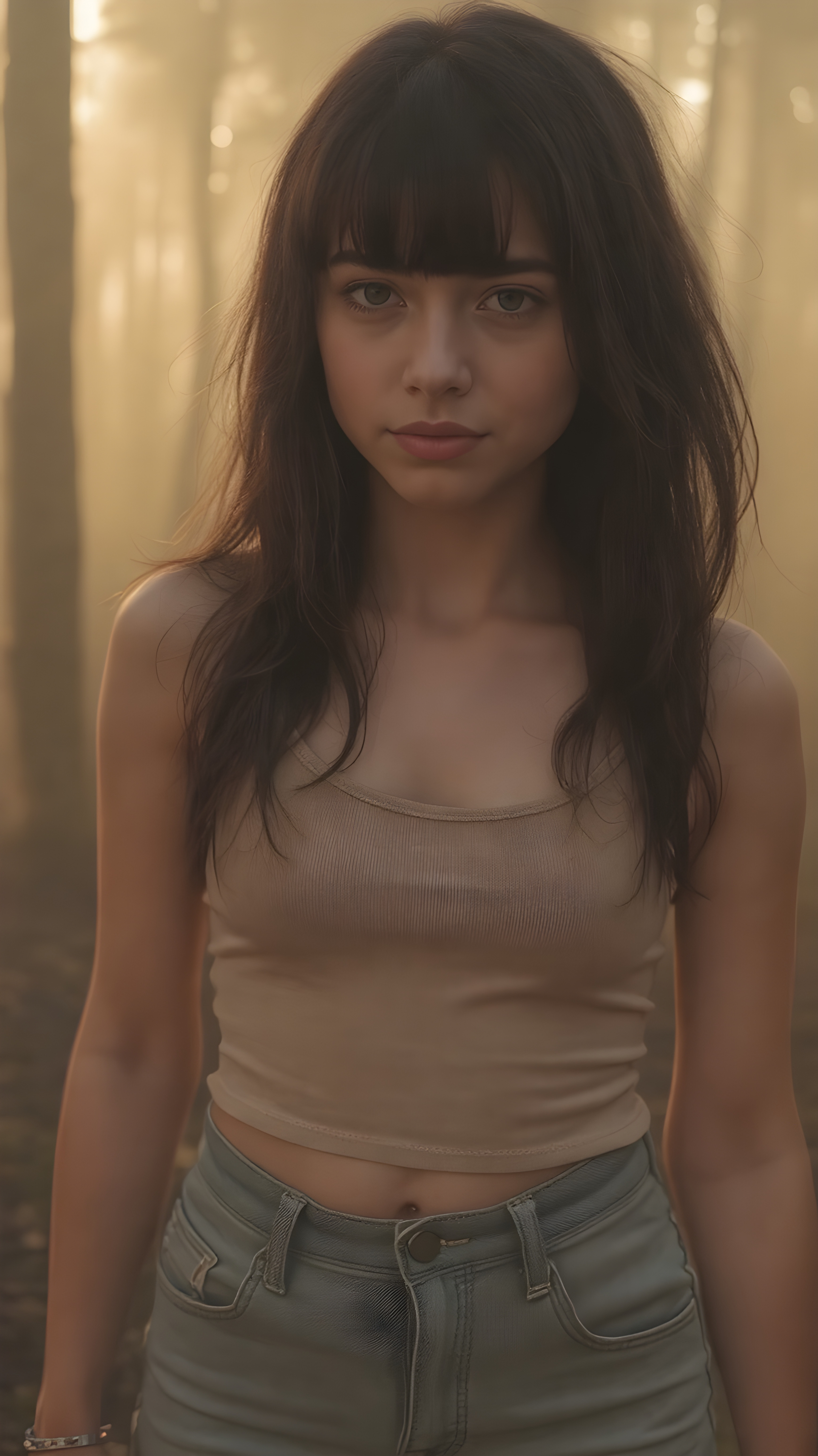 eine (((Ganzkörper-Silhouette-Aufnahme))) eines (((Teenager-Mädchens))) mit leicht (((dünnem, aber athletischem Körperbau))), obsidianschwarzem Haar, das über ihre Schultern reicht und zu lockeren Ponyfrisuren gestylt ist Sie hat schmollende Lippen und einen gelassenen Gesichtsausdruck, trägt ein naturfarbenes, kurzes Tanktop und eine enge Jeans, die ihrer Figur schmeichelt, ihre Augen haben einen sanften Ausdruck, der Hintergrund ist ein nebliger Wald mit goldenen Reflexen, der einen warmen und einladenden Eindruck vermittelt Glanz auf ihrem Gesicht und Haut und schafft eine ruhige und einladende Atmosphäre