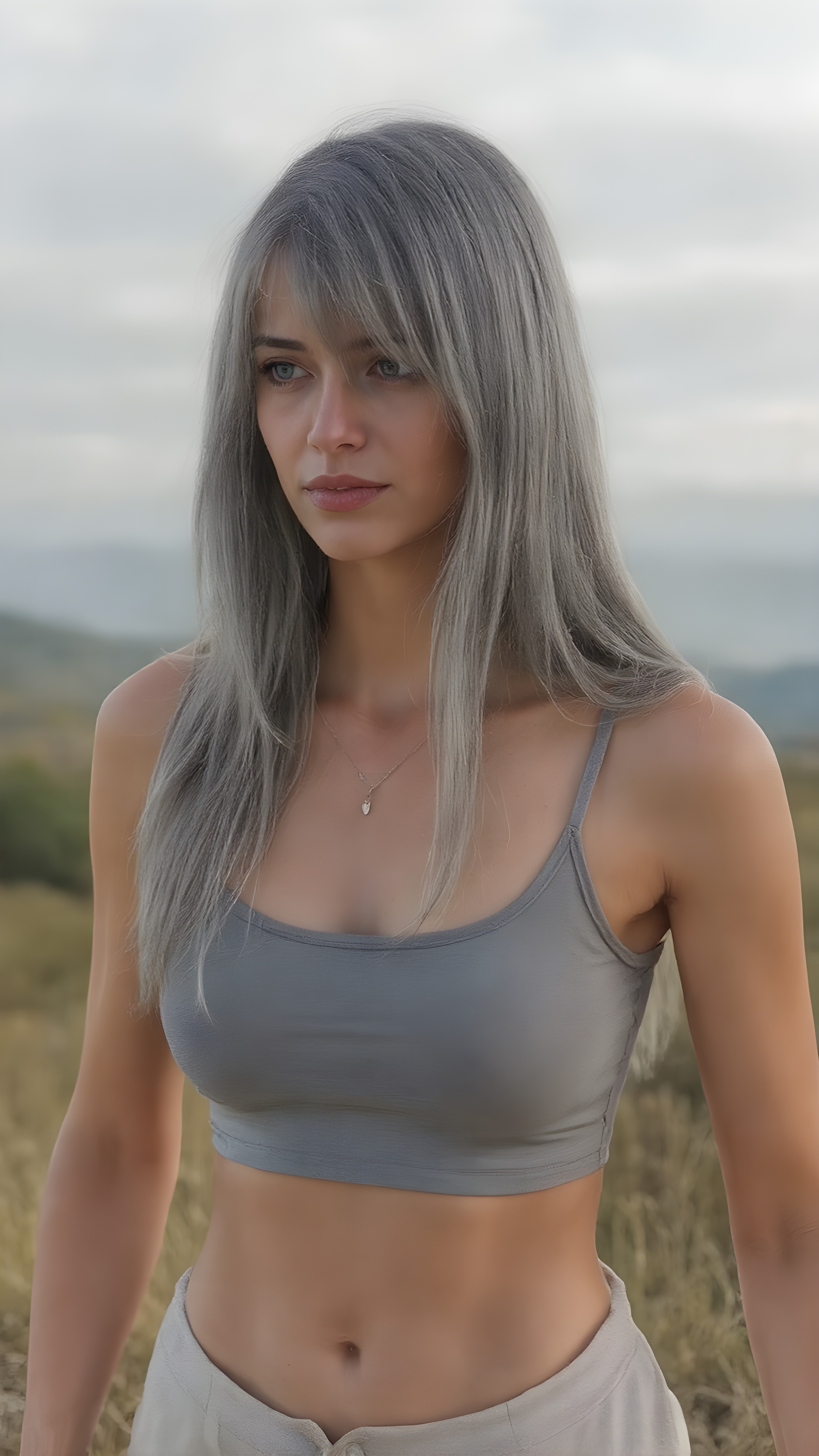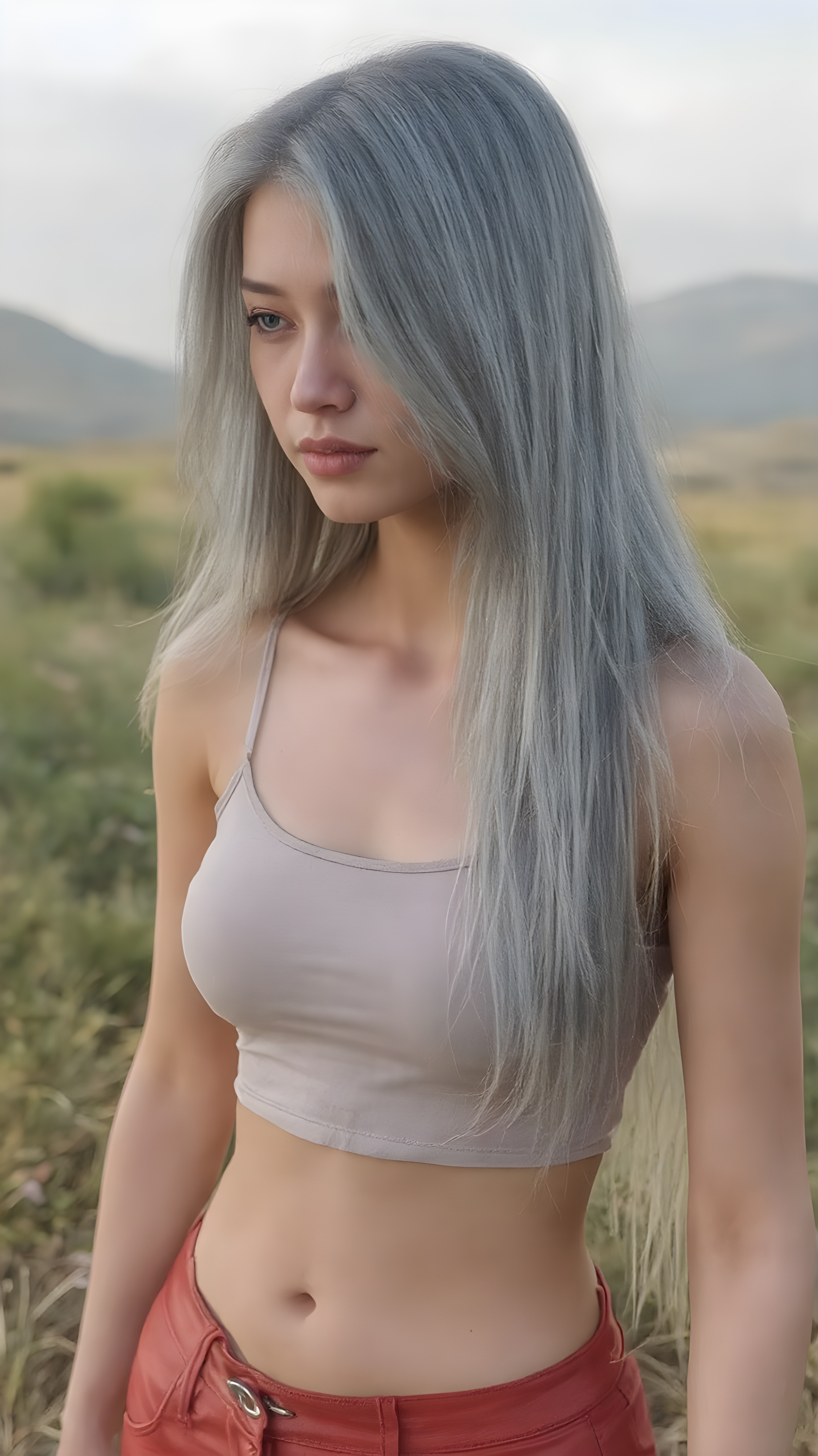 a (((realistic and detailed portrait))) of a silver-skinned girl, a perfect curves-fitting body, (((short pants))) and ((super short crop tank top)), an angelic (((round face))), (((soft long straight grey hair, her hair reaches down to her waist))), and an (((natural landscape))) as a (side view)
