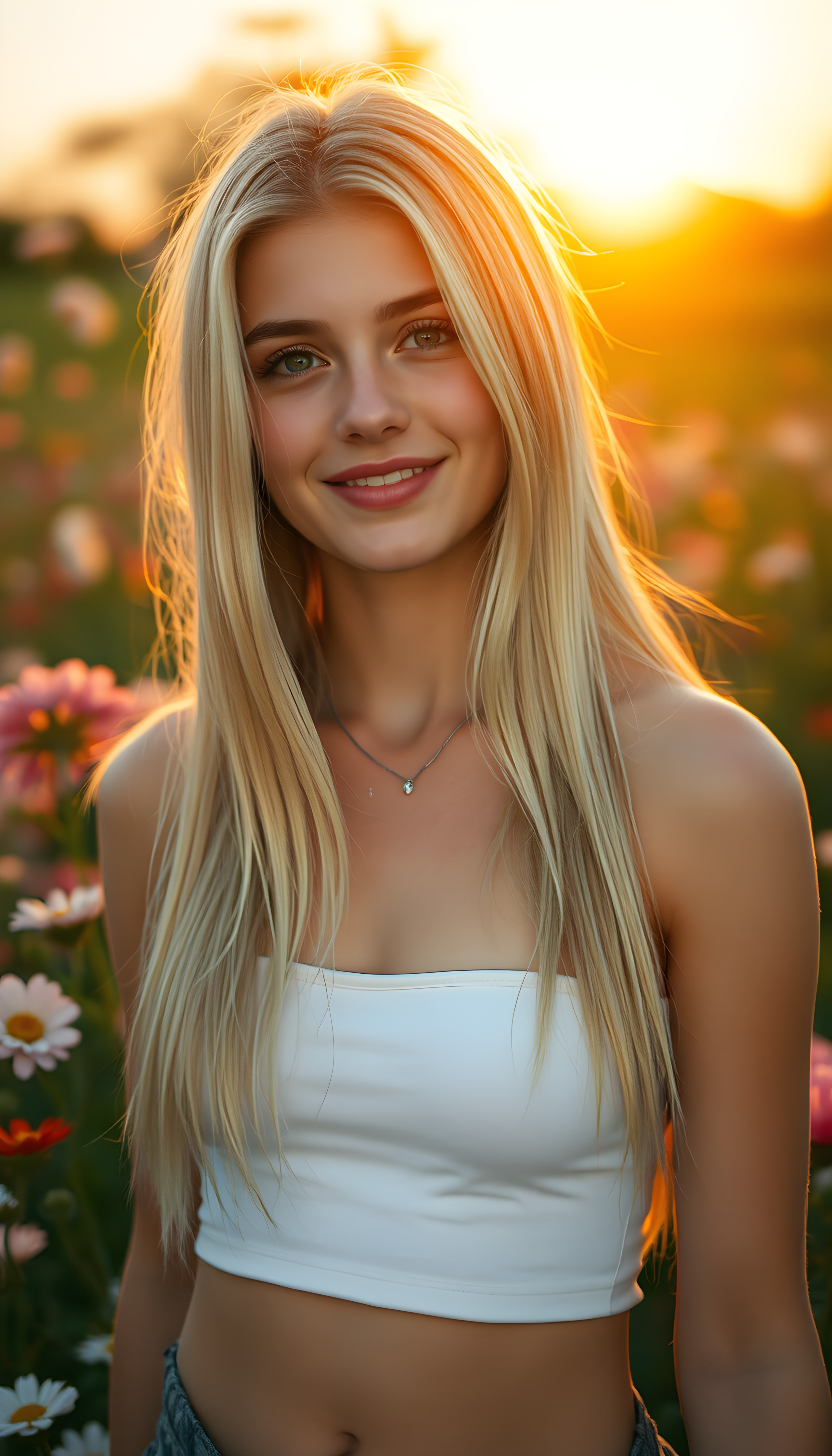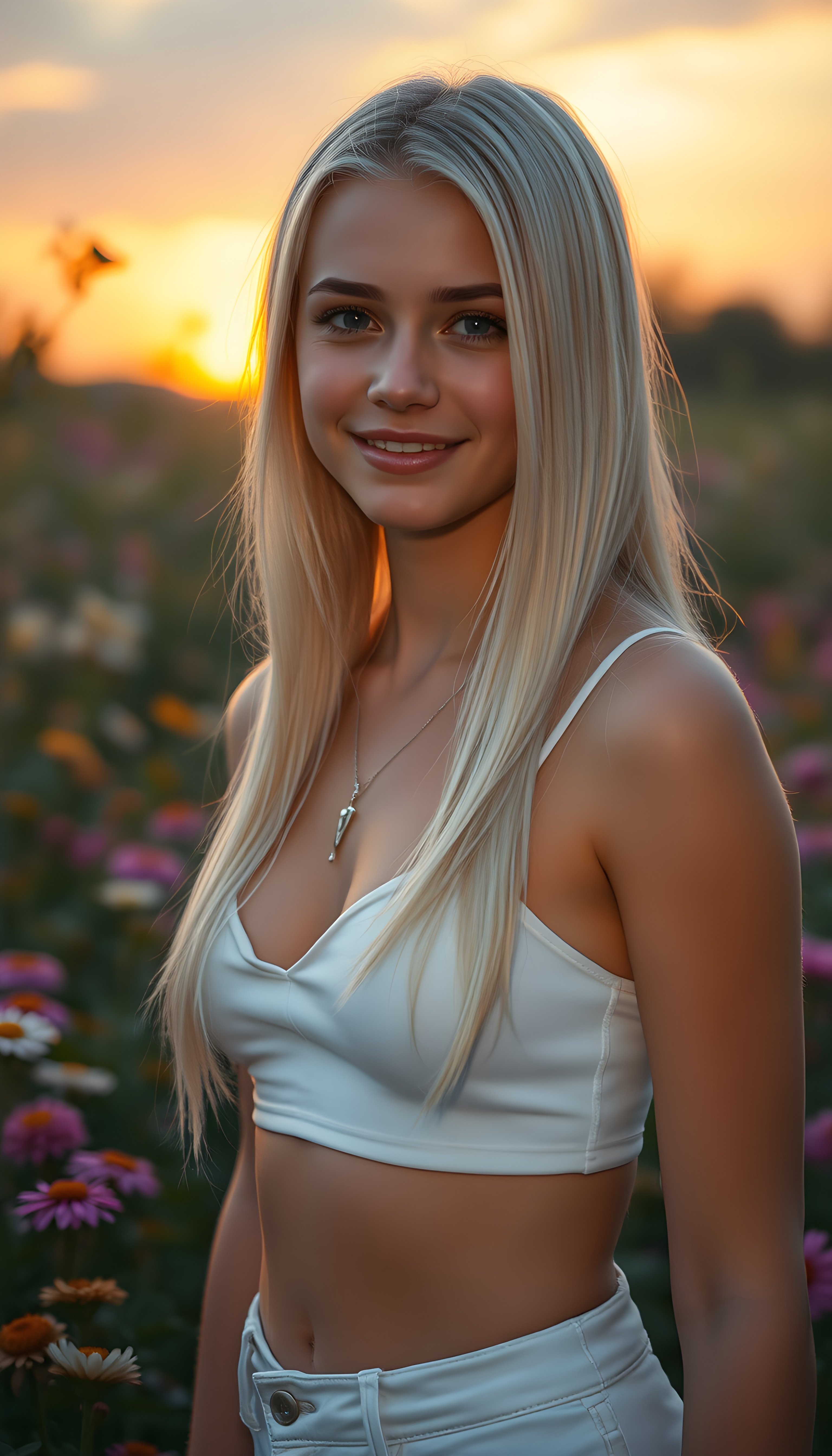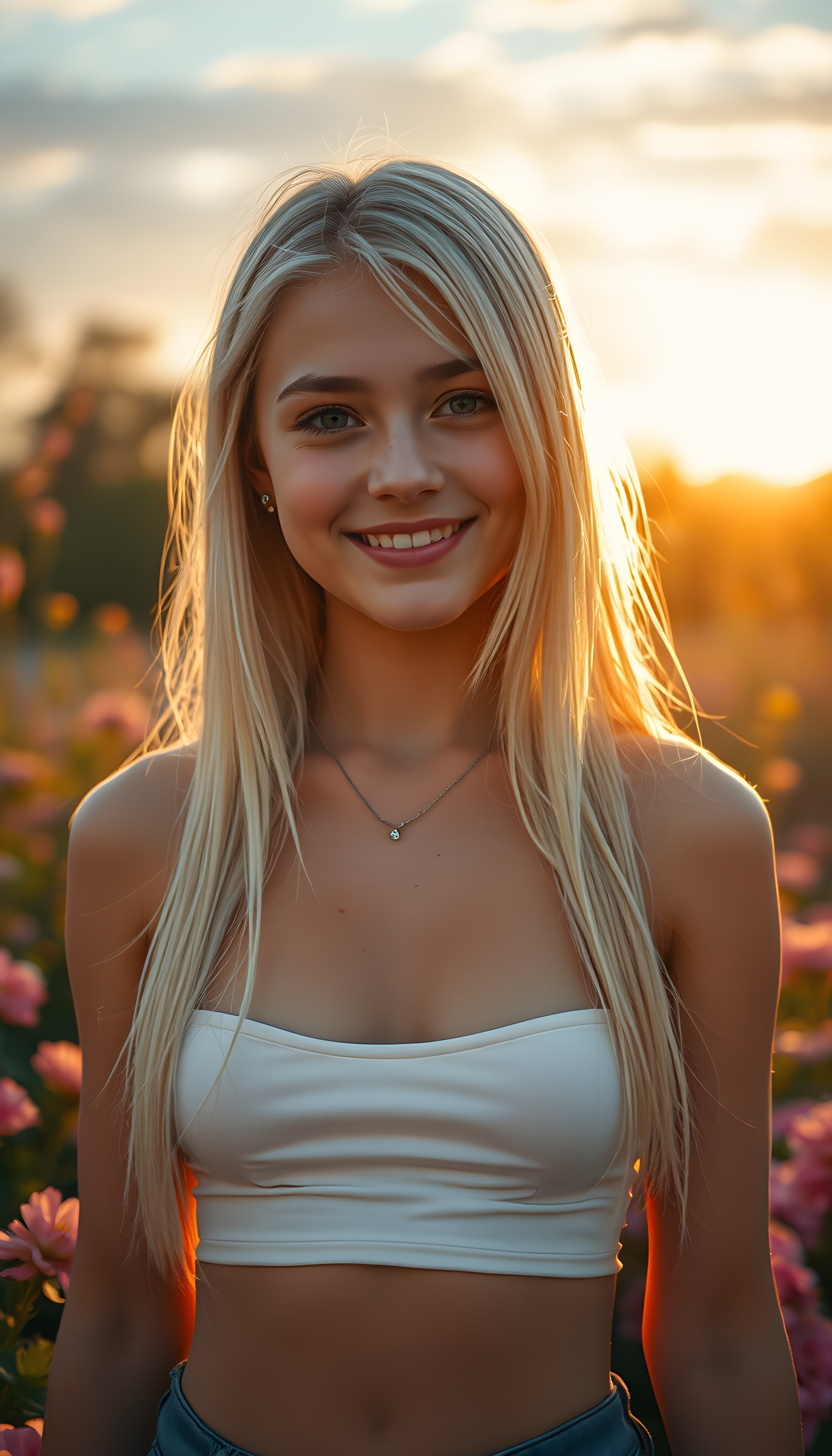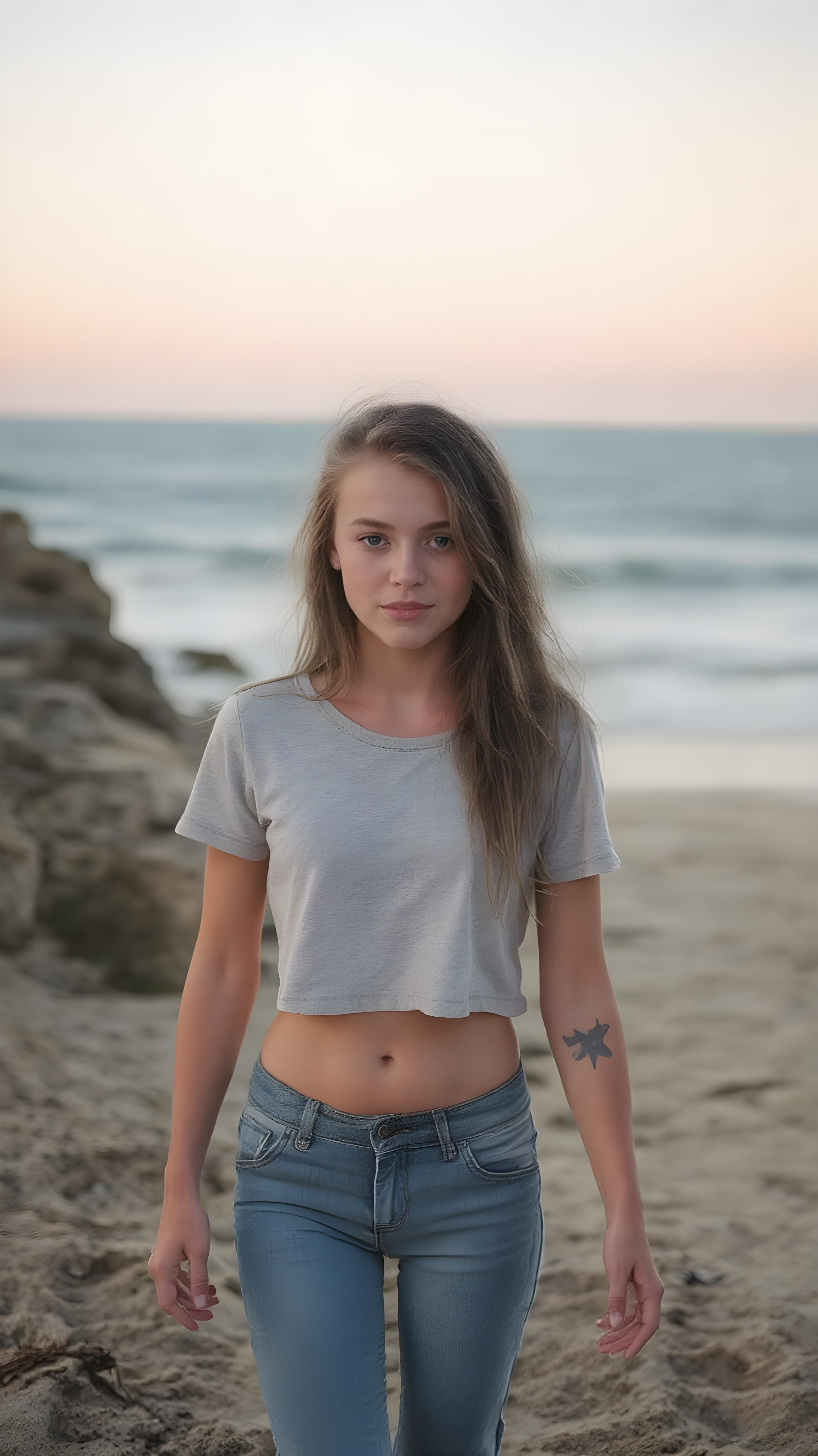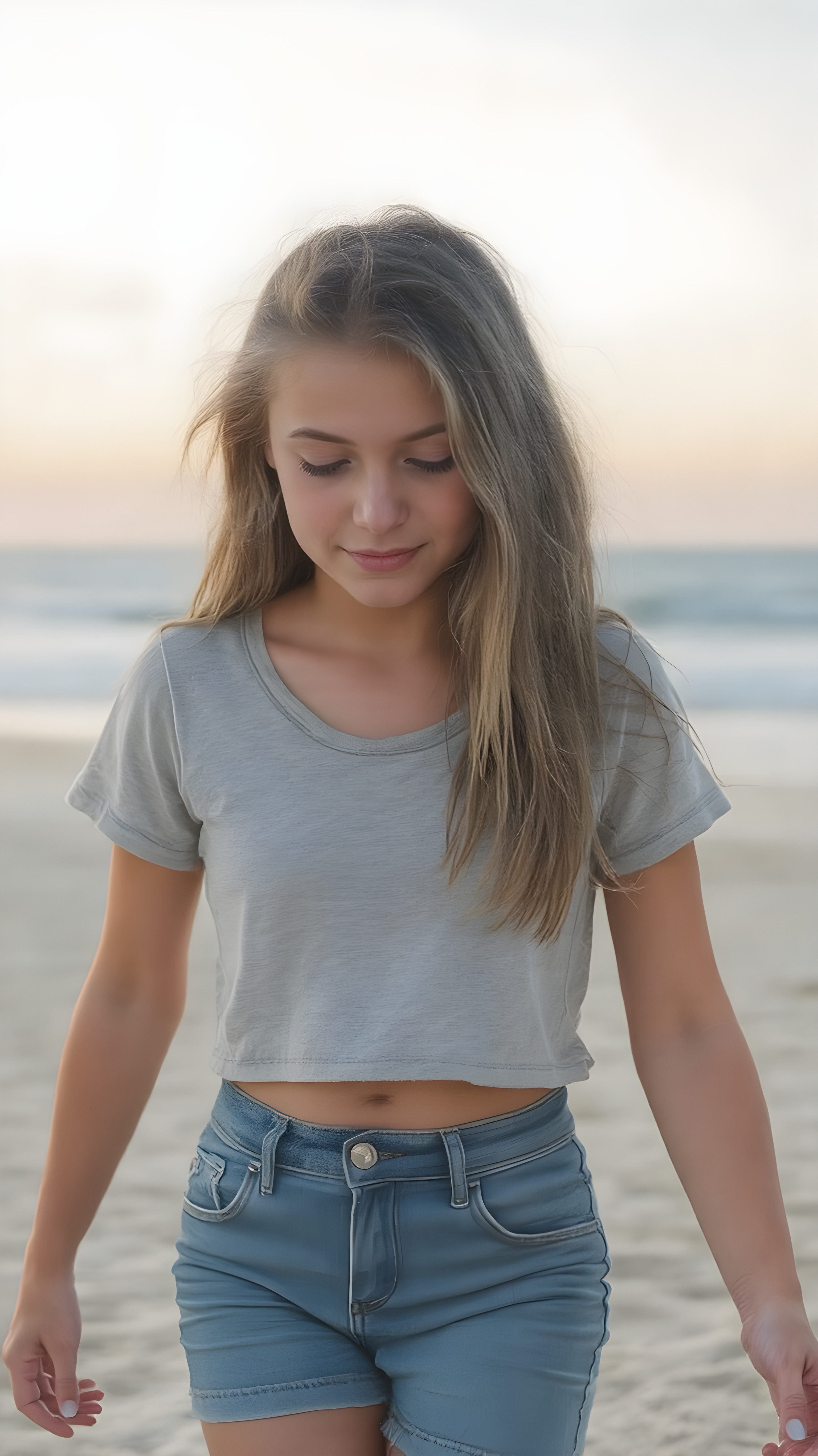 A young, beautiful teen girl with light short cropped light grey t-shirt and short blue denim jeans pants, walks through a sandy beach during a sunset, ocean in backdrop. She is gentle, enchanting and has a beautiful, feminine body. Her long hair falls gently and softly over her body.