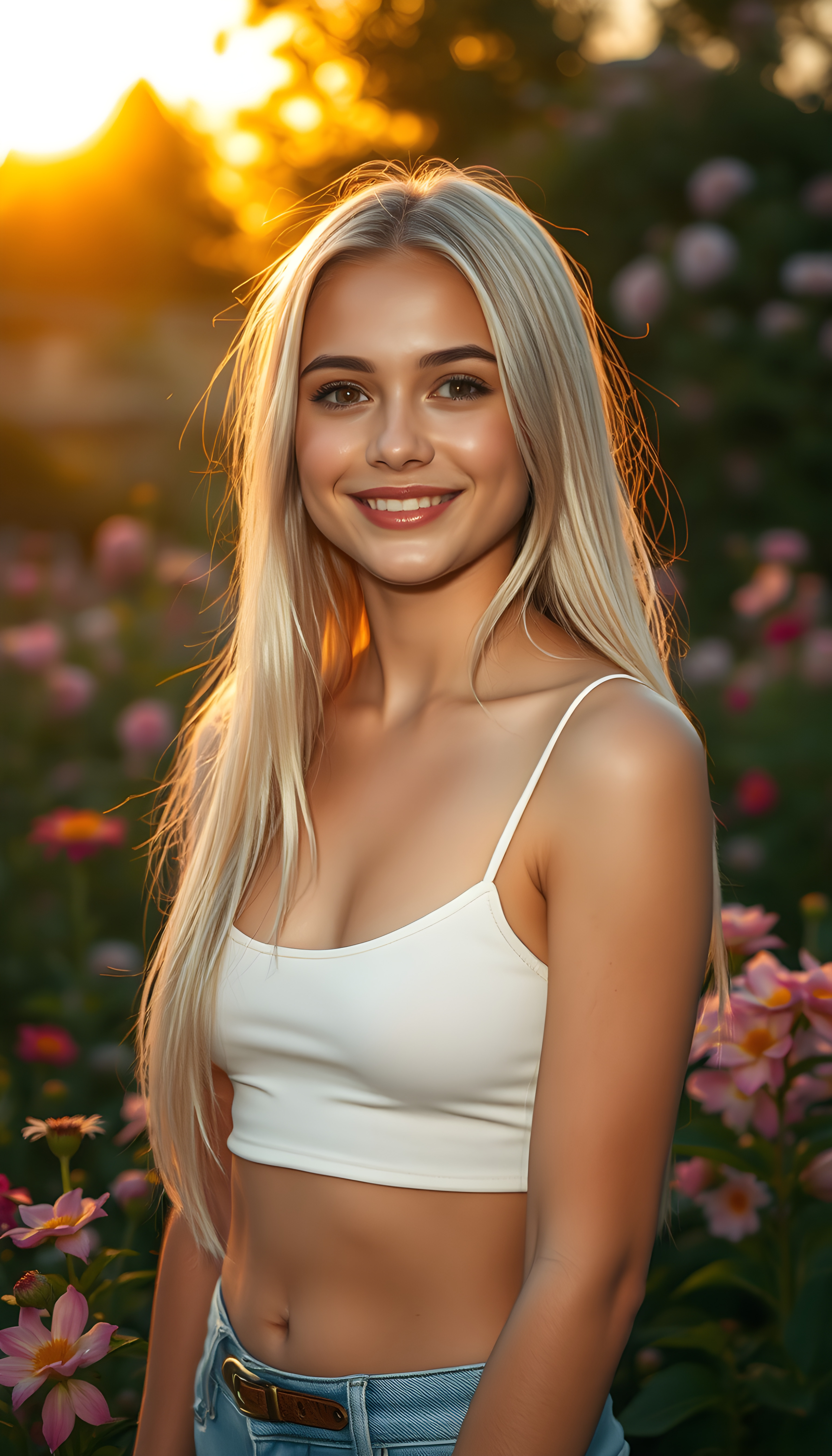 a beautifully drawn (((super realistic Japanese teen girl))), with a curvy figure and intricate details, dressed in a (((super short, tight tank top))), paired with a (((round, short mini skirt))), poised in a playfully confident pose, with long, flowing hair and striking, perfectly detailed eyes