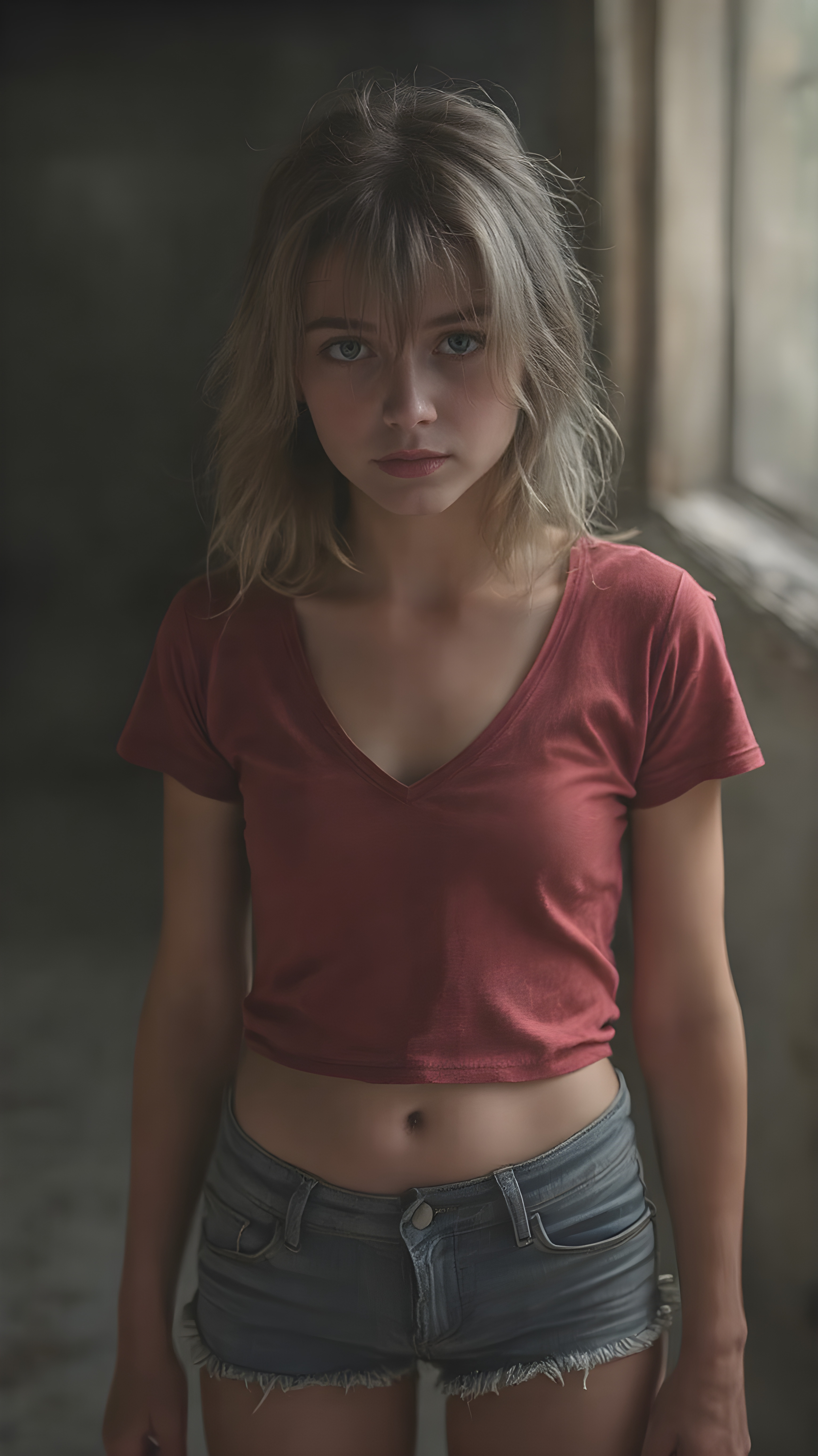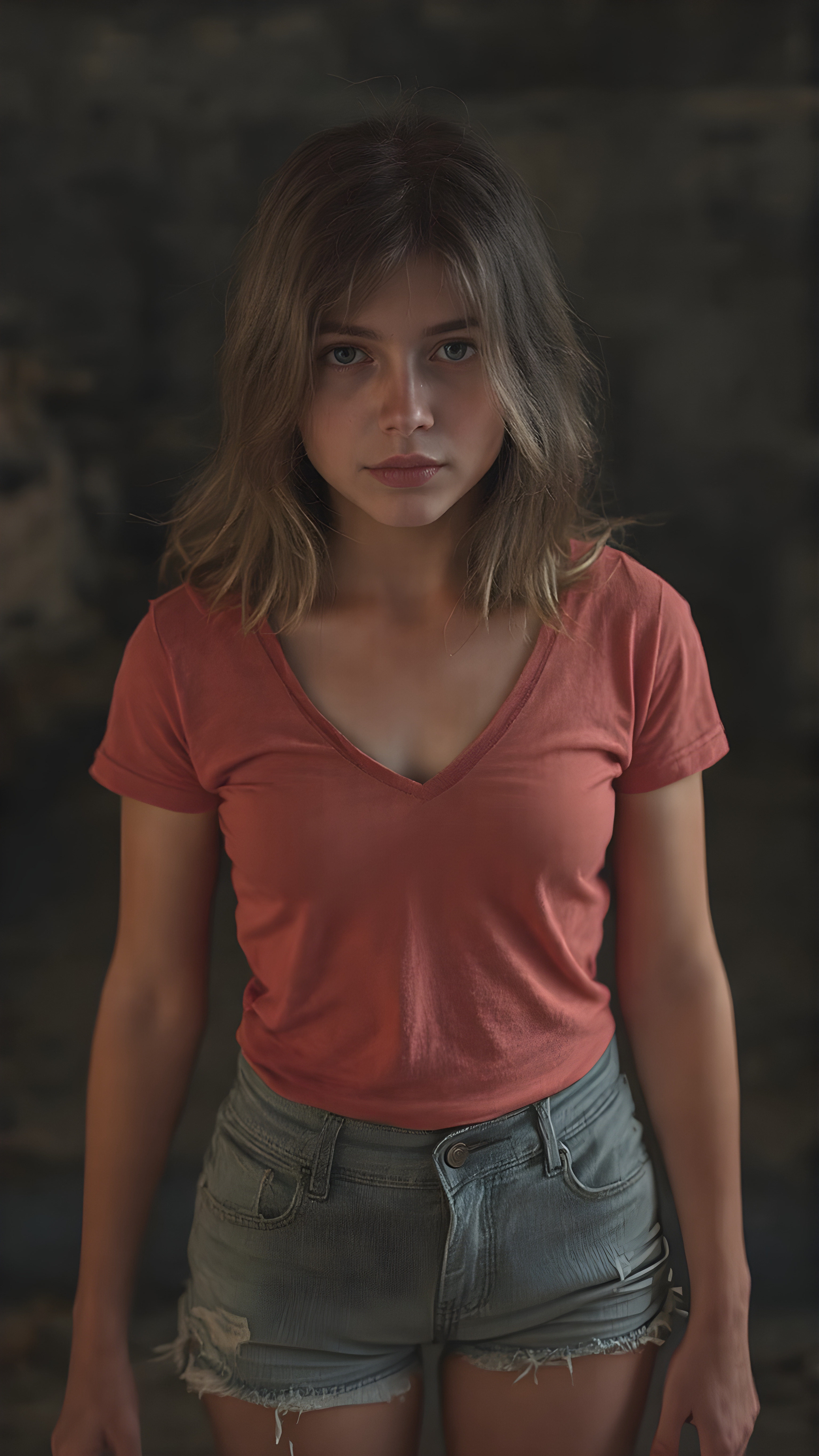 A (((full body view))) of a (((petite teen girl))), with a (((thin, yet shapely figure))), dressed in a ((short, tight, thin, V-neck cotton tee)) and ((tattered shorts)), standing in a (dimly lit space) where her seductive gaze meets the viewer’s eye, exuding a sense of (extreme realism). Her focus on the viewer’s face captures the essence of a perfect female body, with intricate details that make her look truly breathtaking