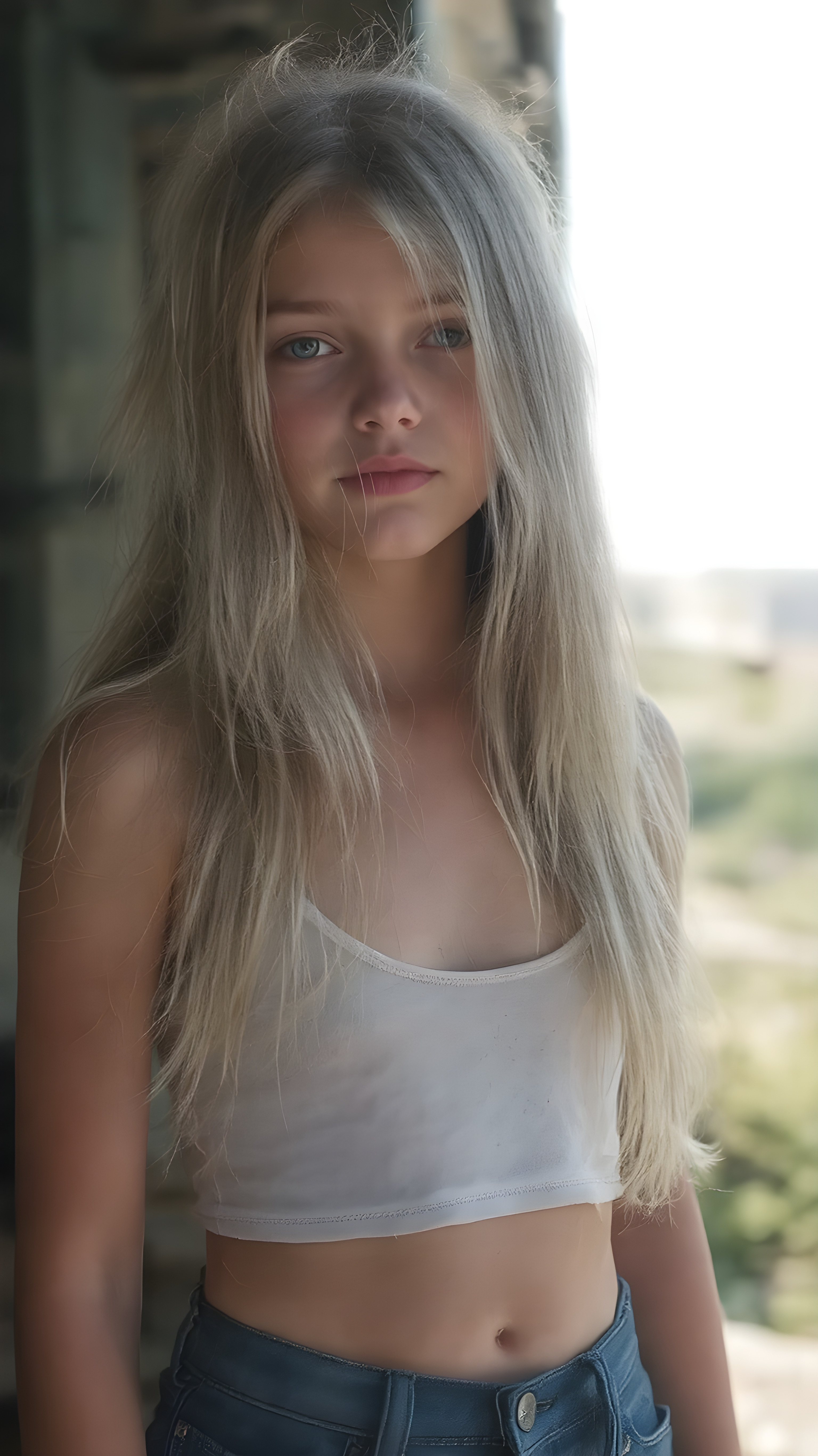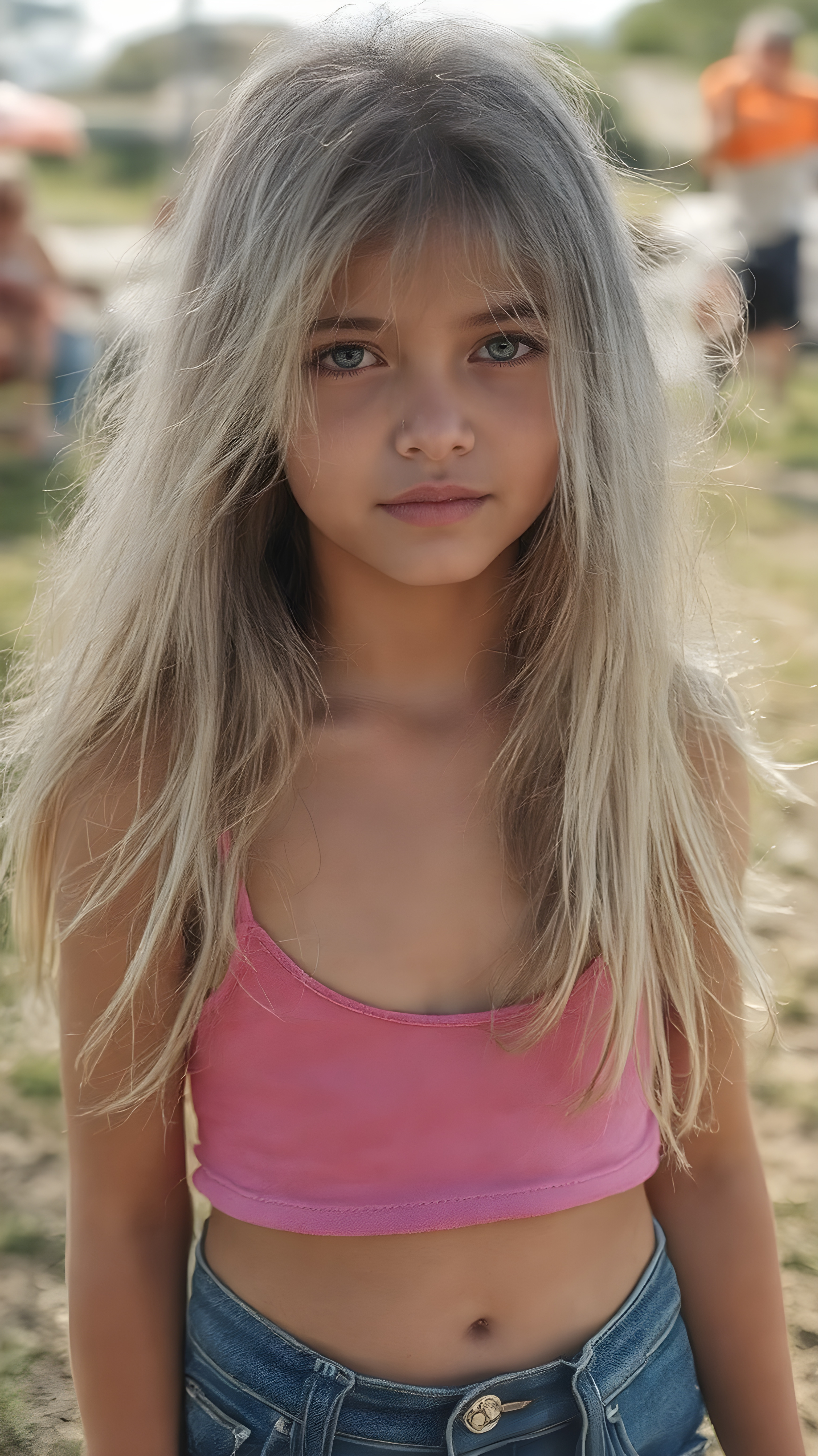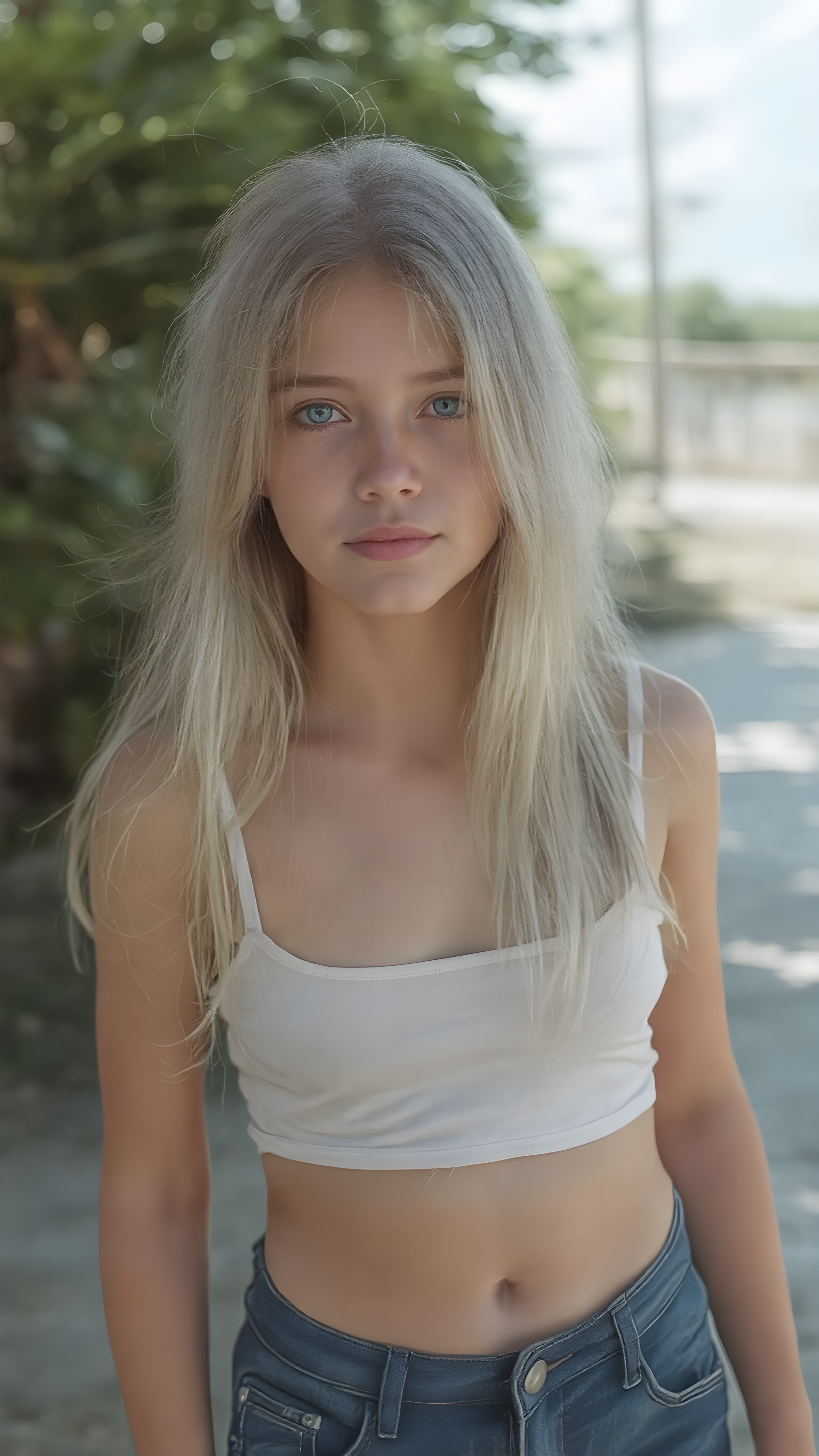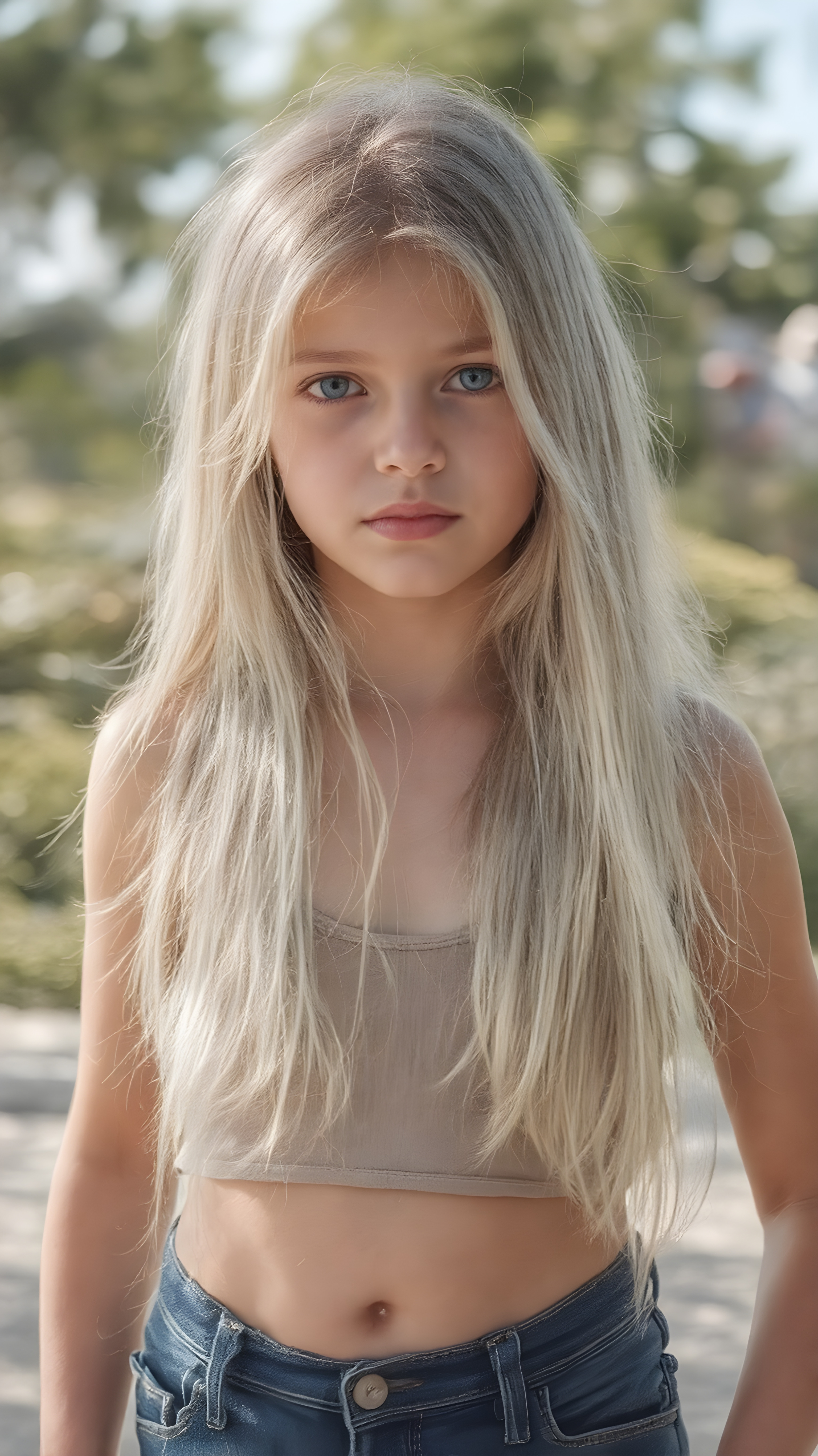 A (((detailed and realistic full-body photo))), capturing a (((very young girl))) with long, straight jet white hair and a gentle smile, dressed in a (((cropped spaghetti tank top))), which accentuates her (flawlessly proportioned figure), with (white skin tight blue jeans) that convey a sense of comfort and style. Her eyes are (((brown))) and exude a sense of youthful vitality. The backdrop is (perfectly clear and sunny day) with (golden brown skin) and (softly rolling hills) that enhance the natural beauty of the scene, you can see her perfect cute round belly button