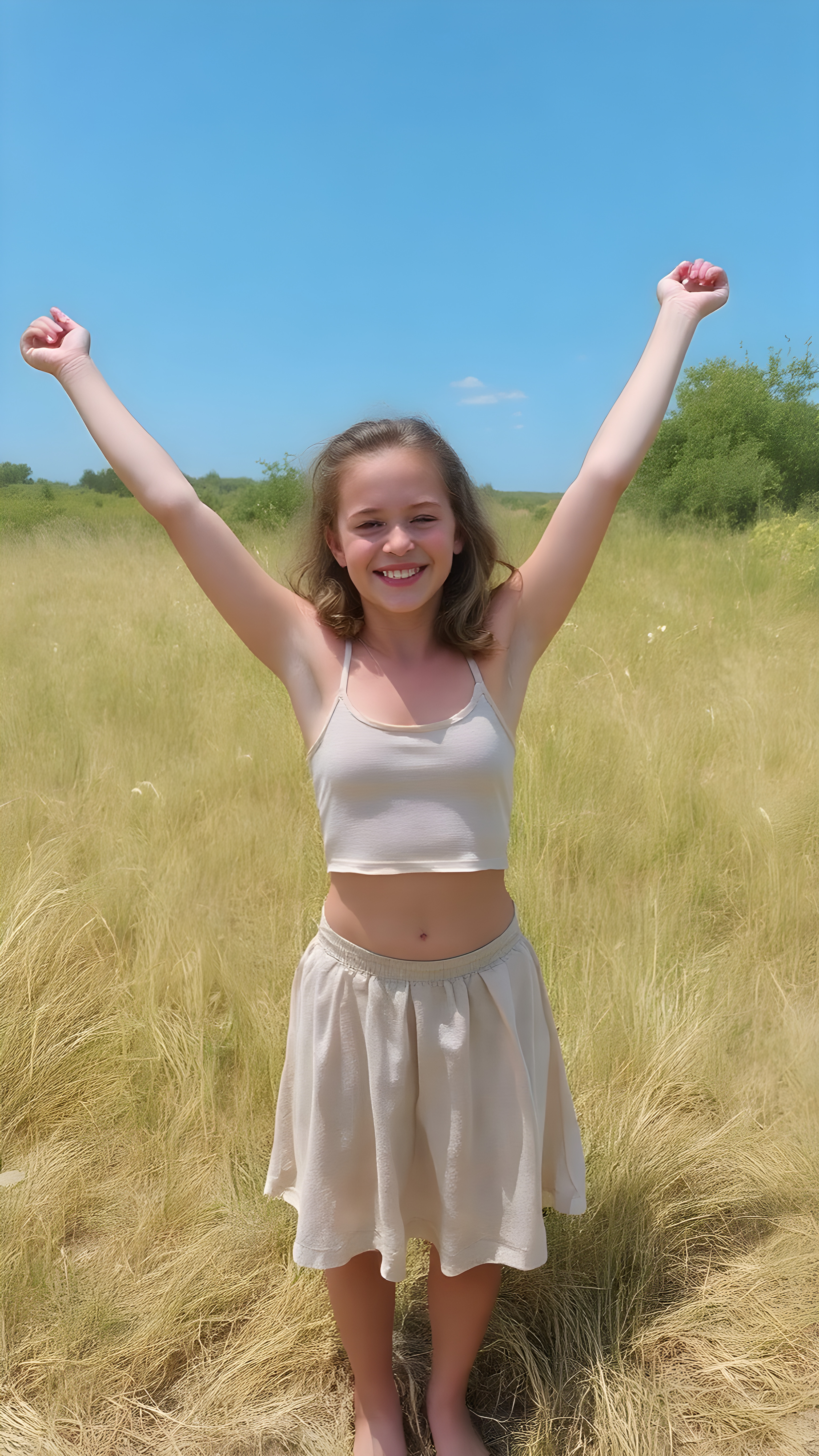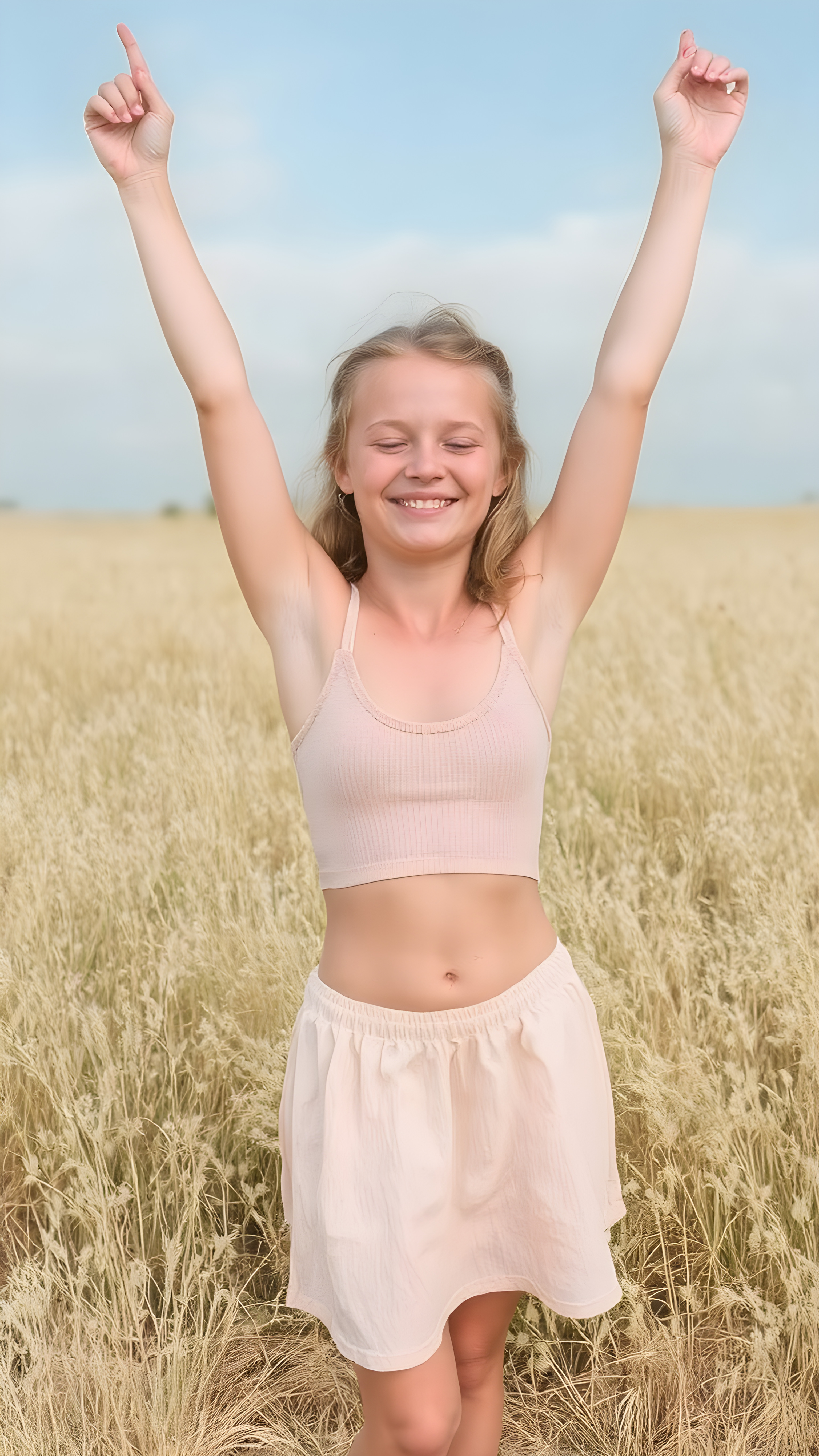 A beautiful, happy girl, 18 years old, perfect curved fit and female body, stands in a summer meadow. She is wearing a thin, short tank top and holding her arms up in the air. She is smiling and has her eyes slightly closed. She is wearing a summer skirt that reaches down to her knees. She is barefoot and enjoying life. Sunny