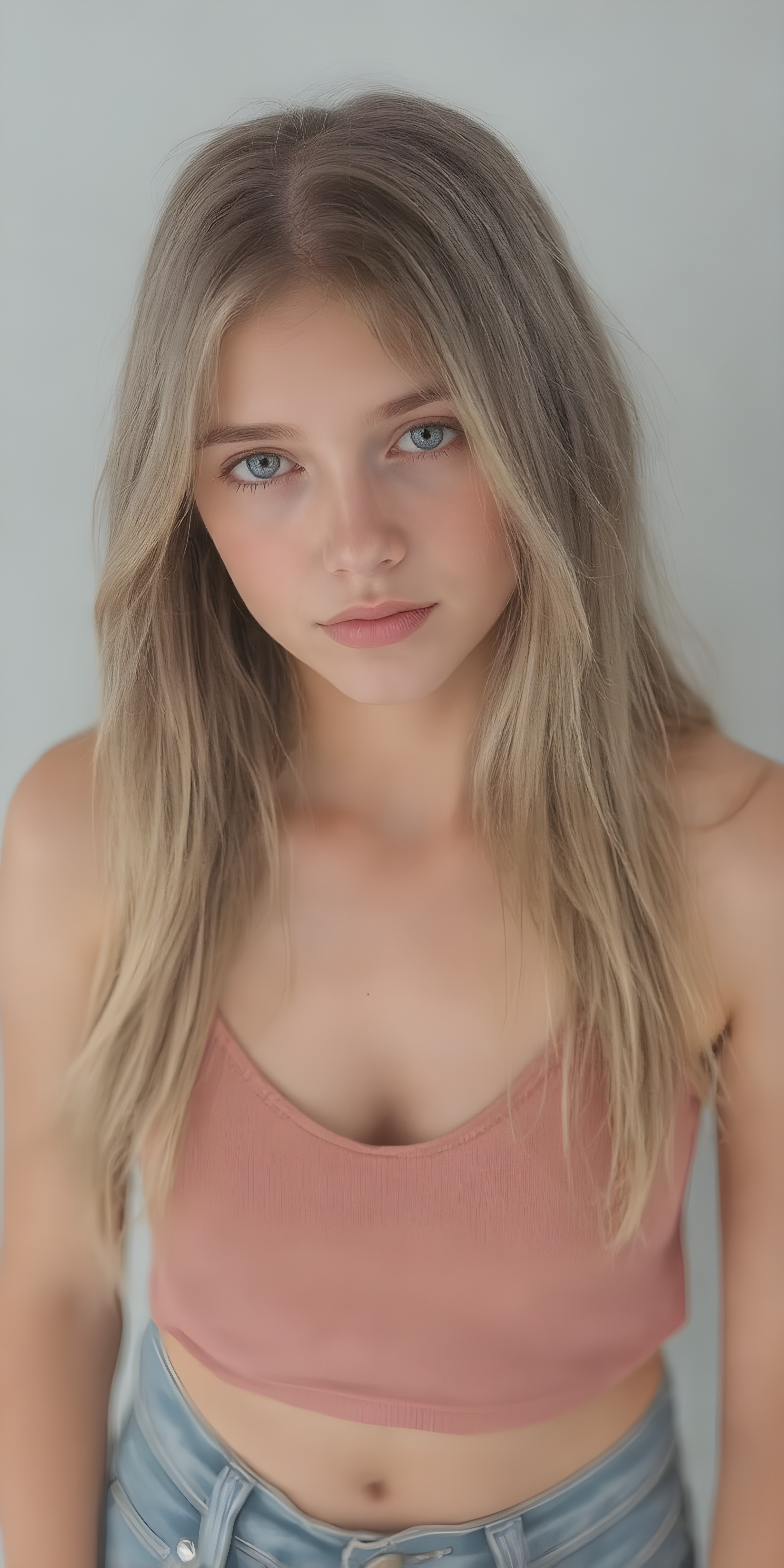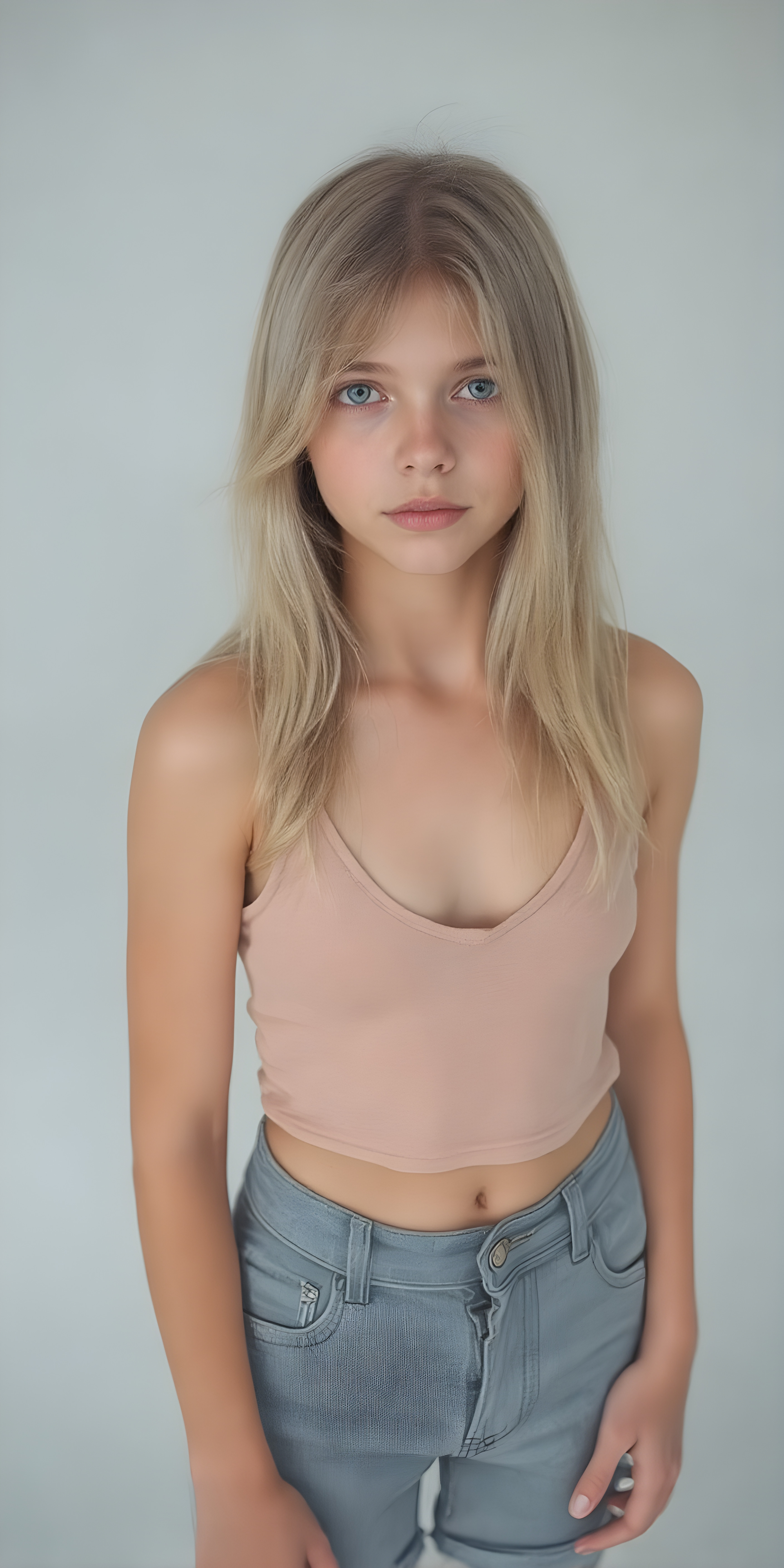 ((a full body shot from head to toe)) from a (((realistic cute young teen girl))), with straight soft long light blond hair, (full lips), and ((big amber eyes, round face)) that exude innocence, paired with a (short cropped tank top, deep v-neck) that emphasizes her perfect body, (perfect skin), her figure is so perfectly proportioned that it defies reality, she wears short jeans pants and white shoes, cute belly button, (((against a light grey backdrop)), view from the side