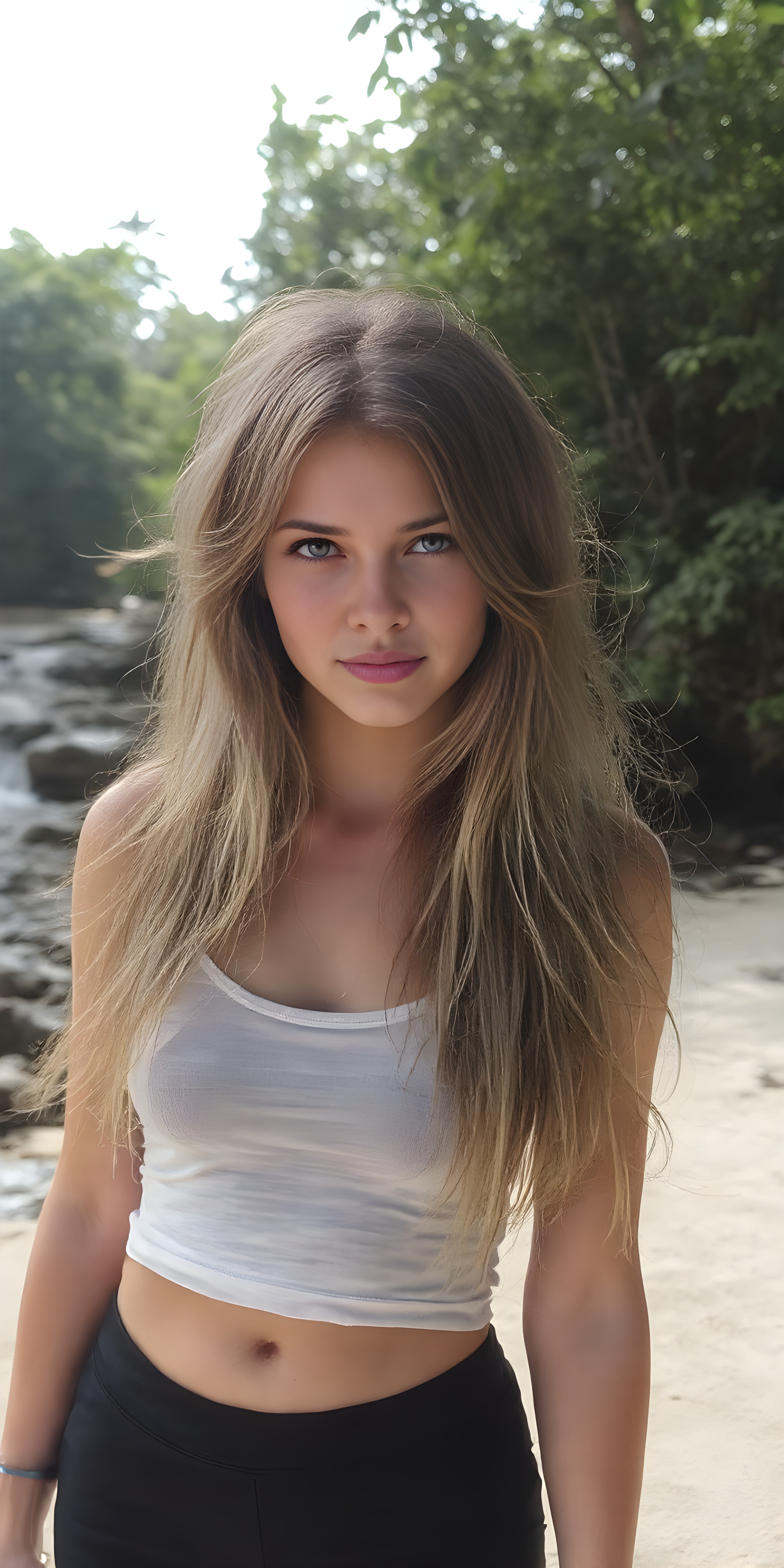 a (((realistic and detailed photo))) of a (((beautiful well busty teen girl))) with long, flowing (((sandy soft brown straight hair))), green eyes, and a sleekly defined figure, dressed in a tight (((white graphic short tank top, deep neck))) featuring a (((heart))), paired with a (((black round mini skirt))). She poses confidently on a sunny sandy beach.