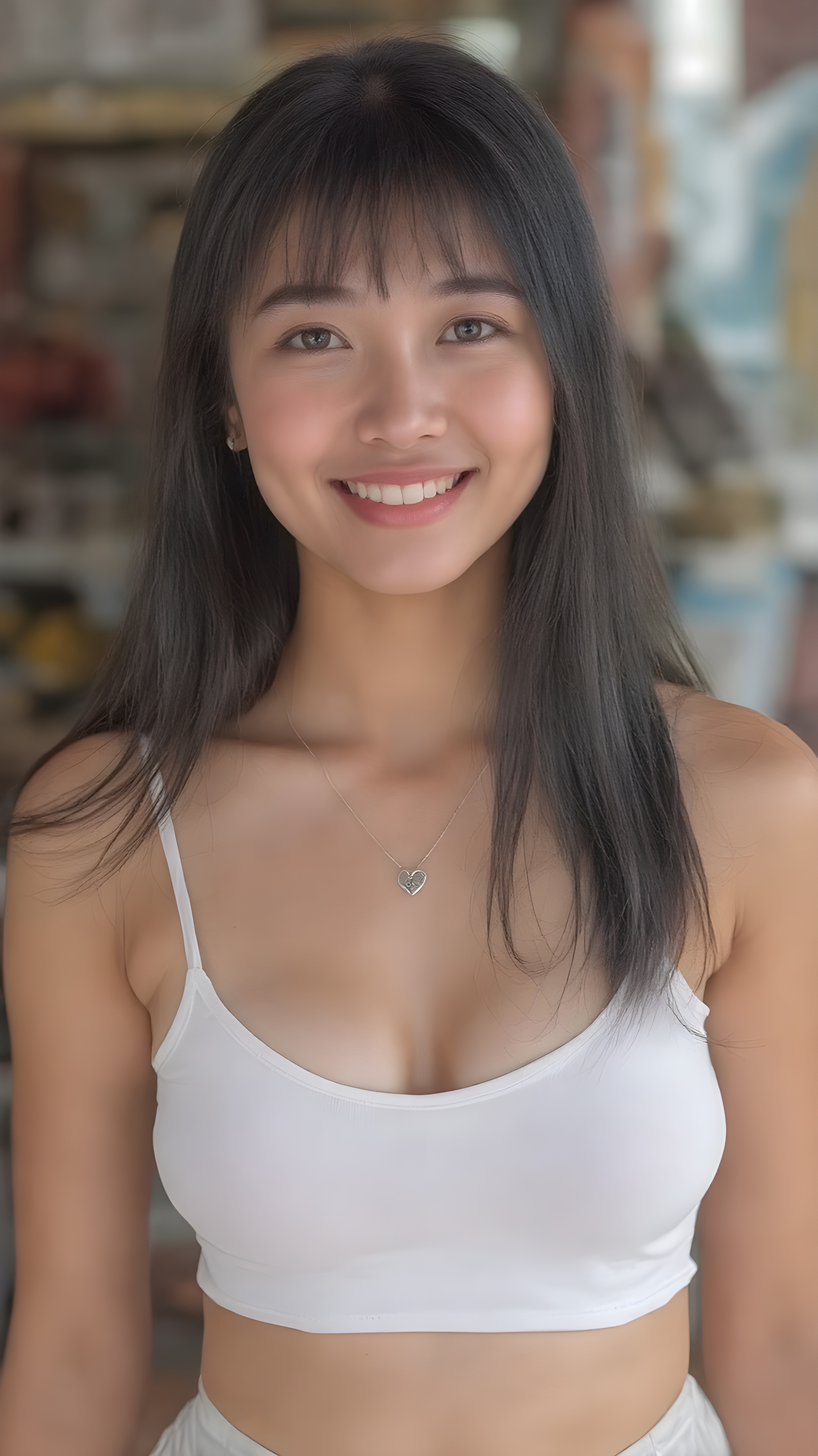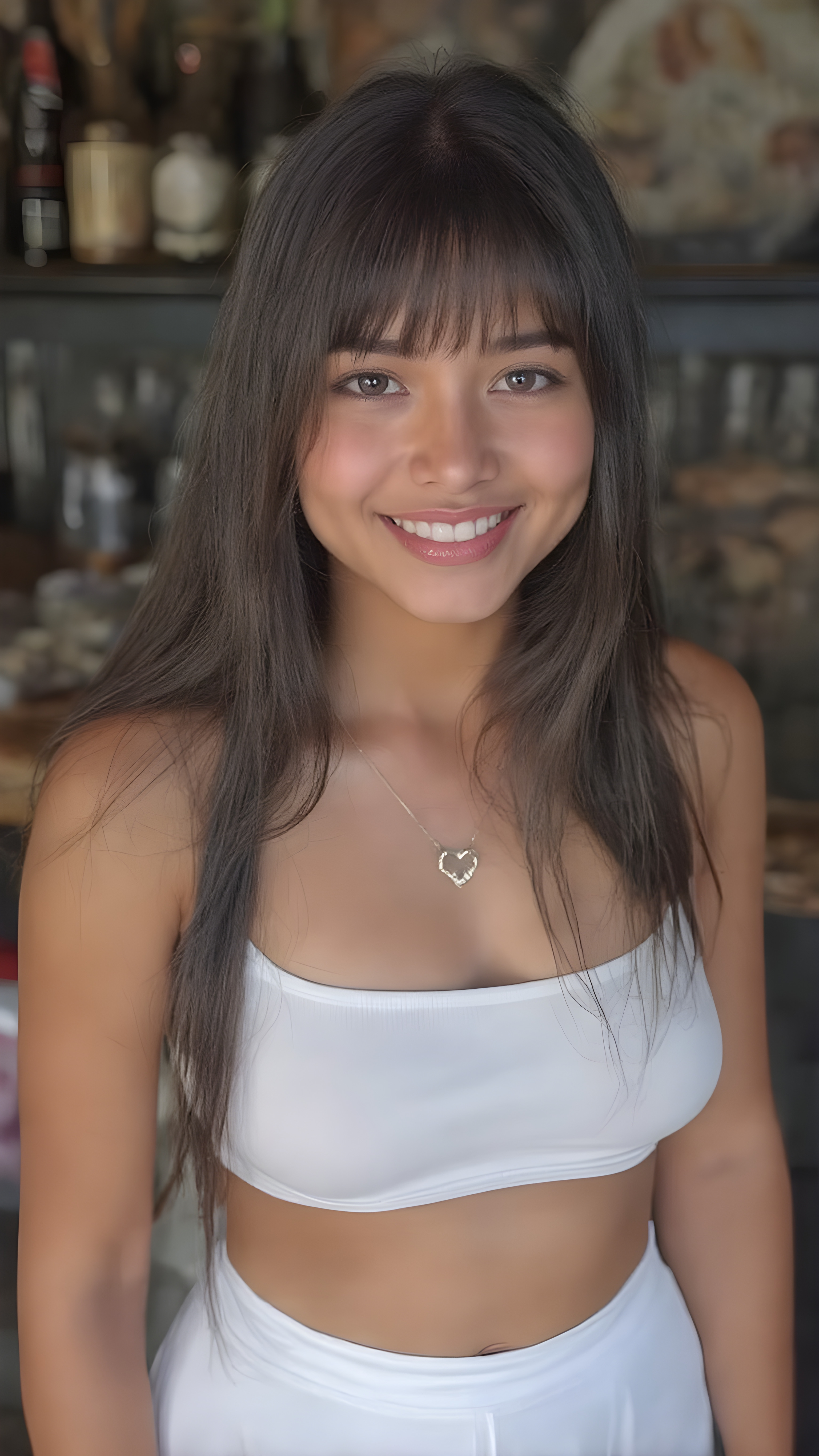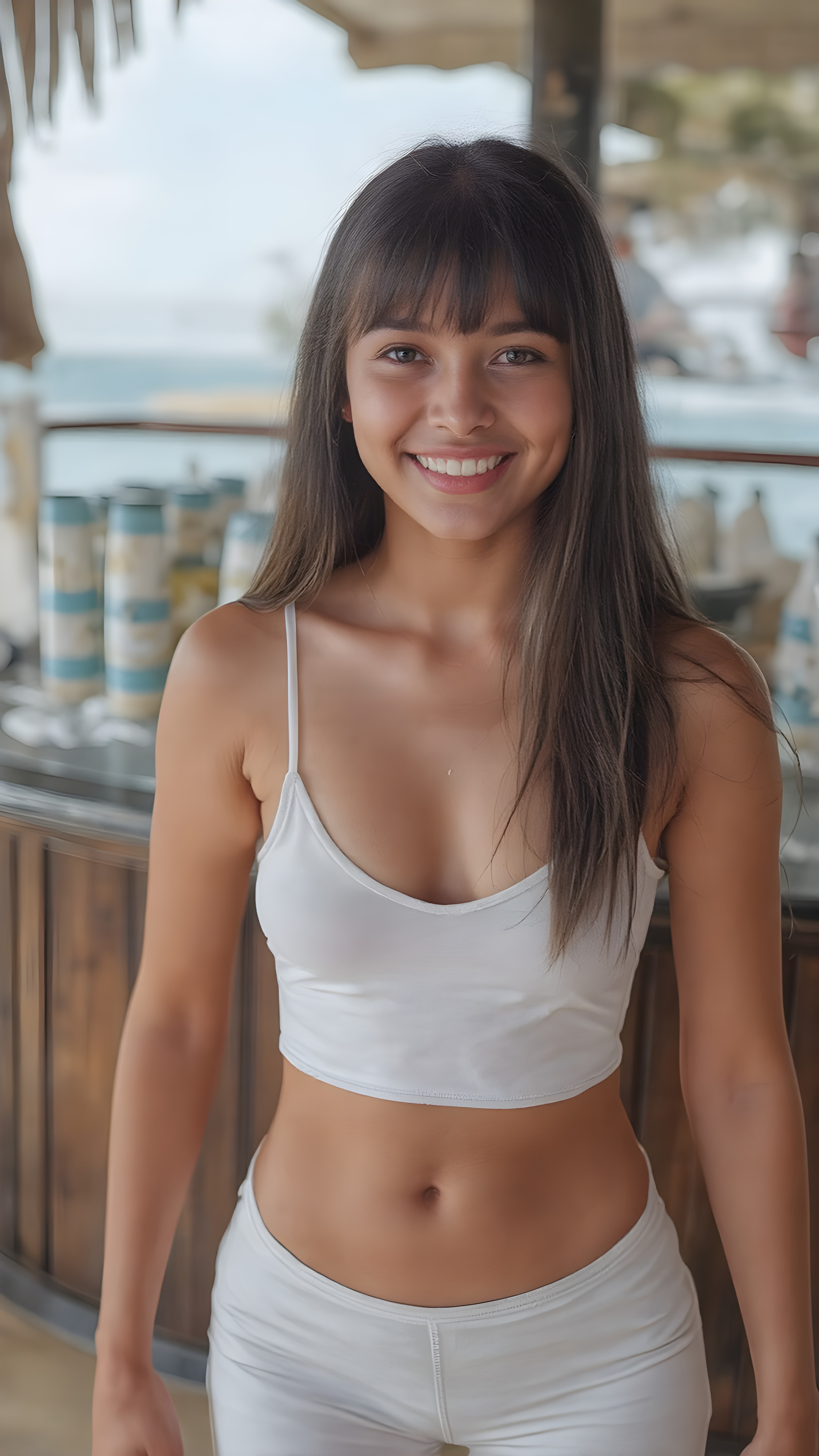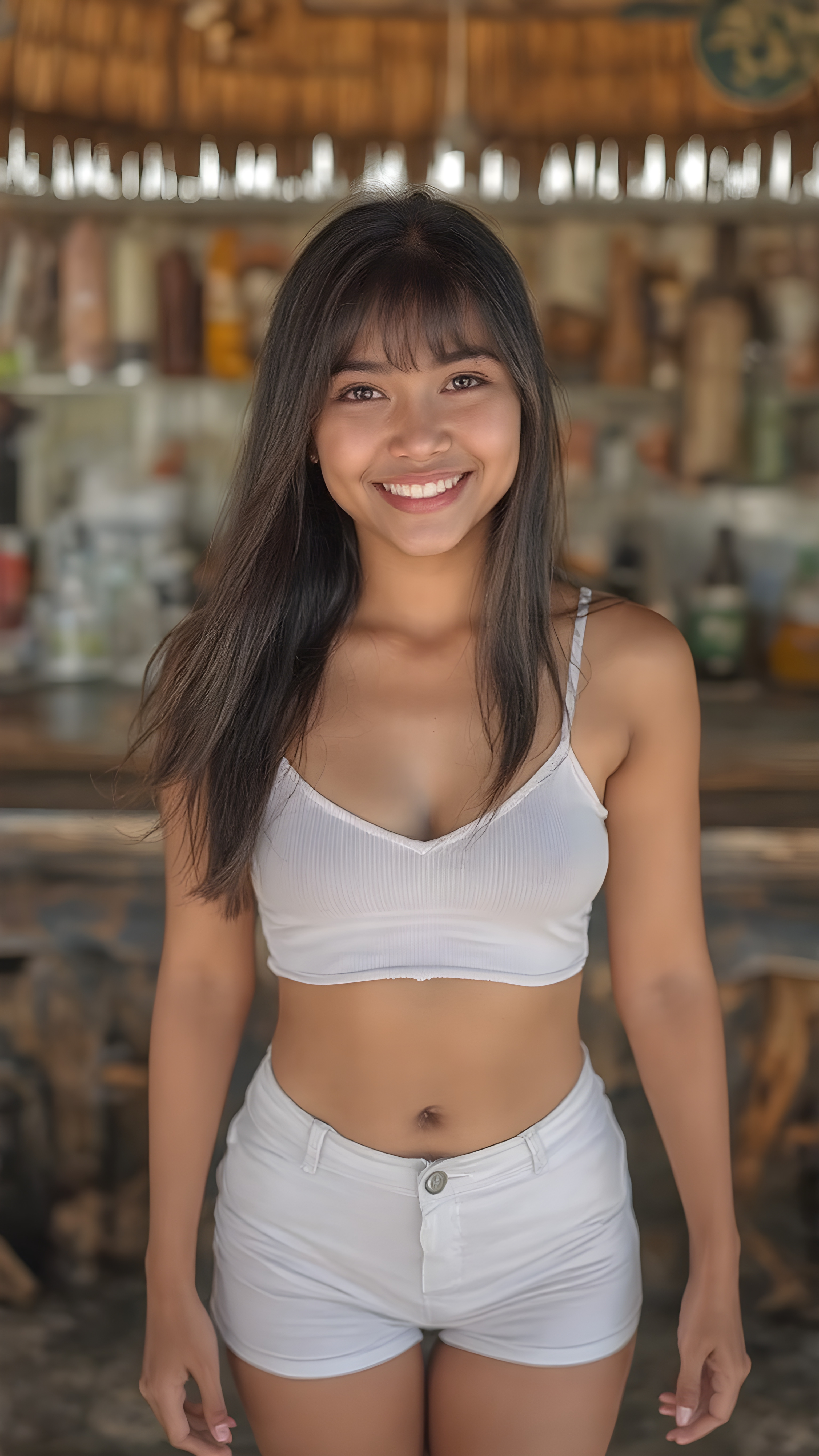realistic and detailed vacation photo capturing a very happy barefoot and well busty Asian girl, 18 years old, she wears a thin white short cropped spaghetti tank top pared with a short round white mini skirt, very long straight jet soft brown and black hair in bangs cut, deep neck, she stands in front of a stand bar, she exposes her belly button