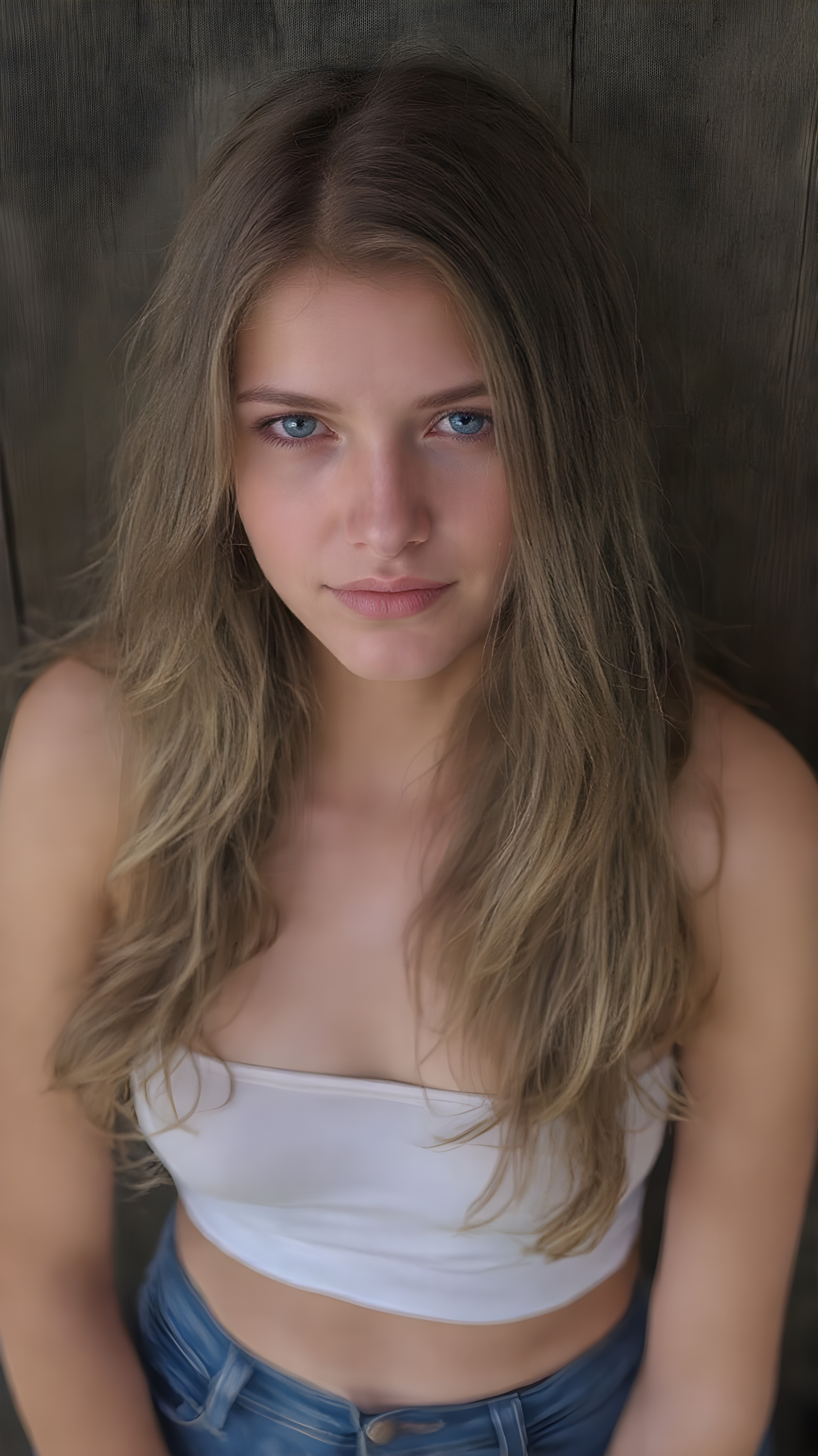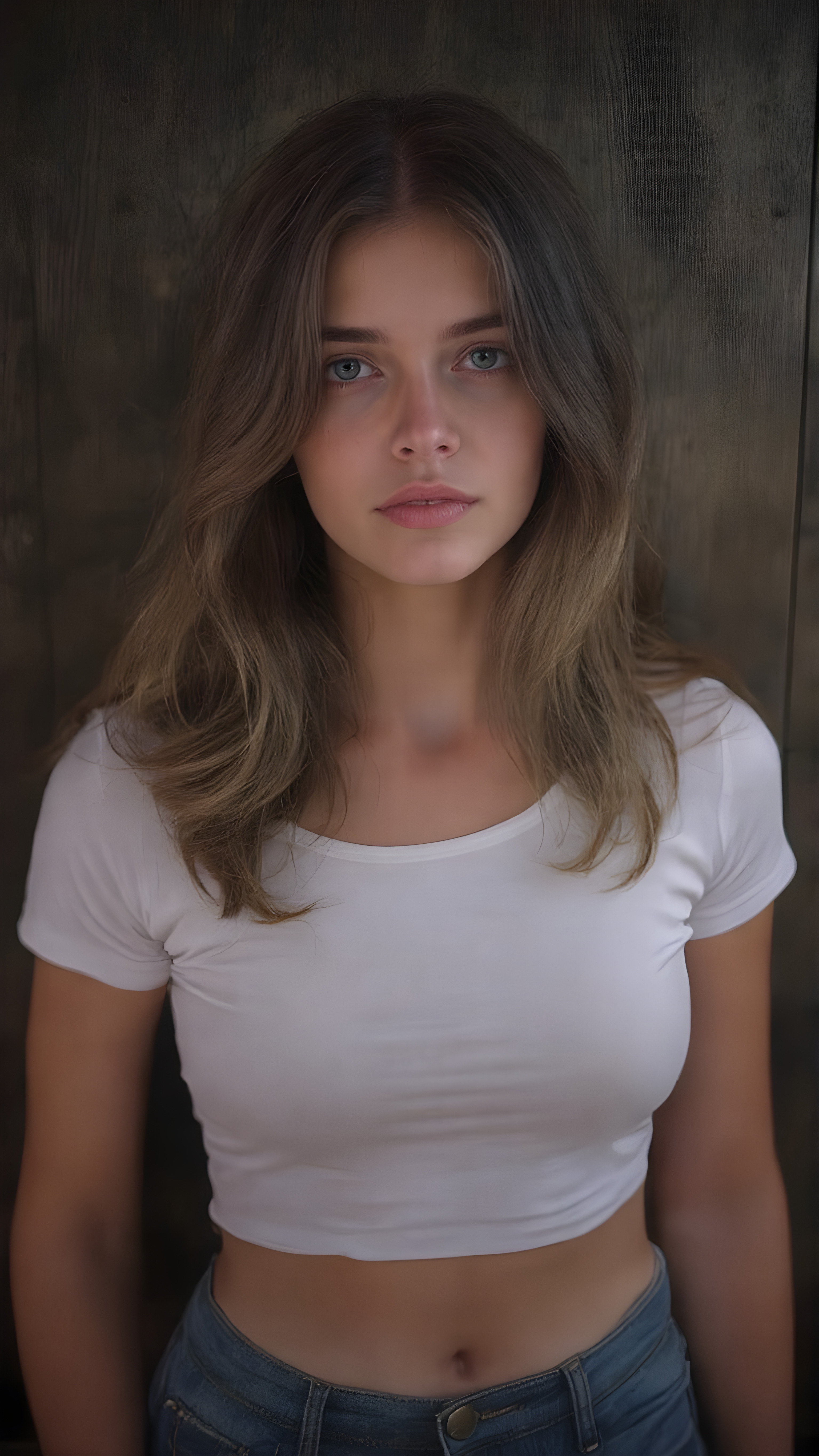 a beautiful, young, charming, alluring and sensual busty teen girl, with straight, thick and shiny hair with beautiful curly wavy locks that frame her face perfectly. Her lips are full, plump and very sensual. She has a slight smile on her face that sends shivers down the spine of any man who watches her. Her eyes are dark brown and exude an irresistible allure. She wears a short tight white cropped tube top that clings to her curves in all the right places. Her jeans are tight and flatter her thighs in all the right places. She stands with her shoulders against a dark wooden wall.