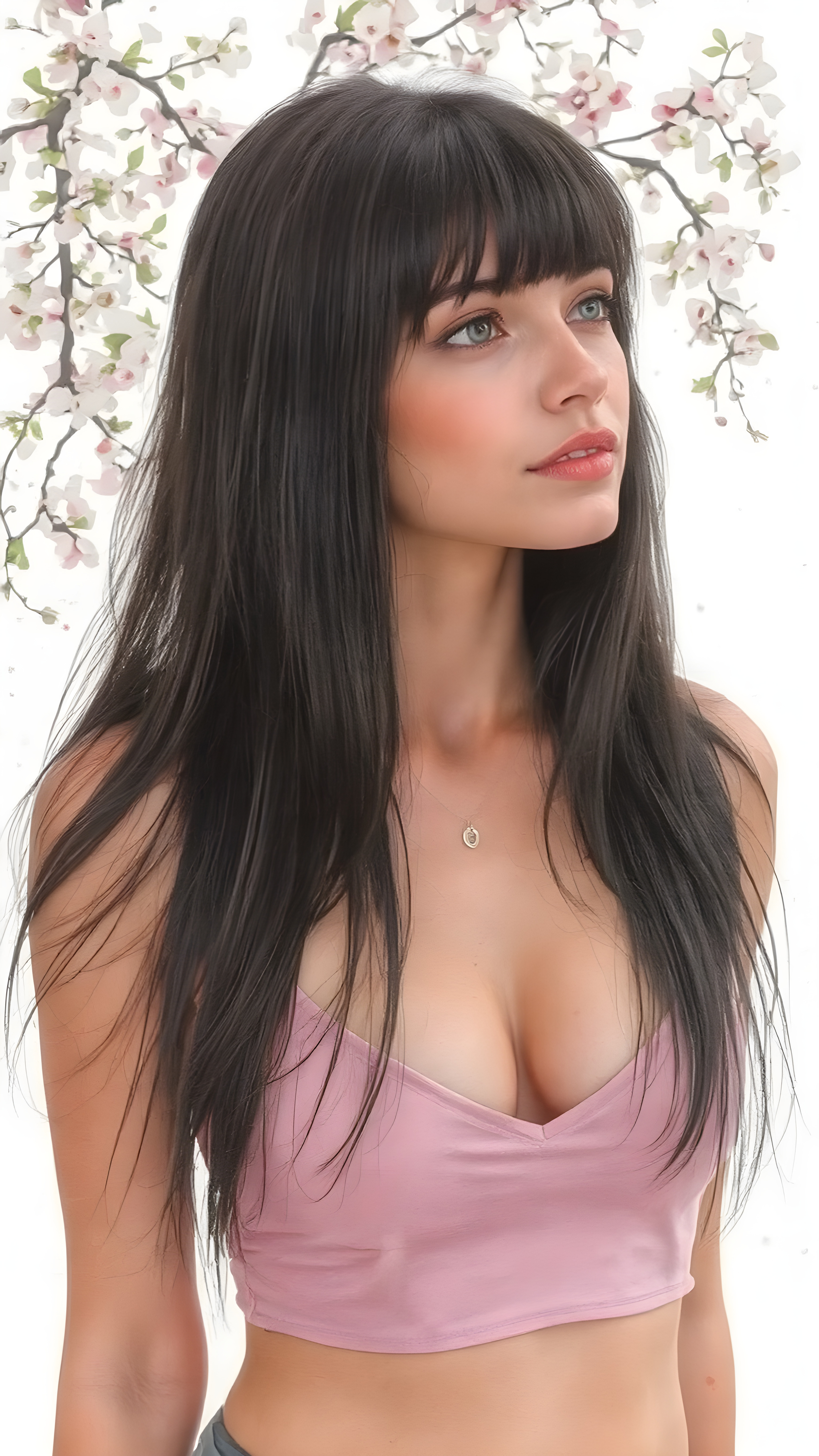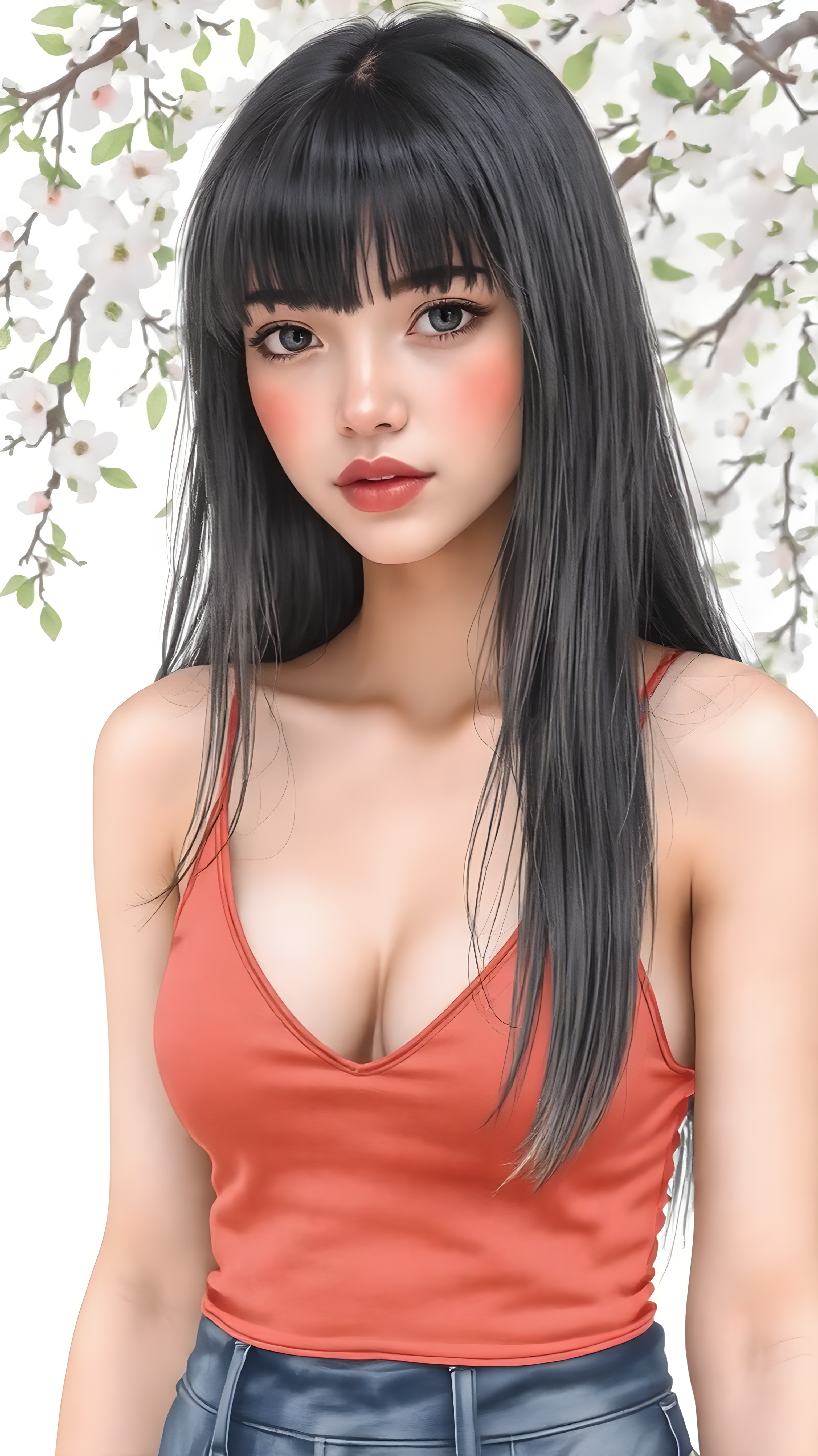 a (((young busty adult girl))), with long, straight, thick, jet, shiny black hair, bangs cut frame her face, wearing a (((high cut, tight, spaghetti tank top))), posing perfect, ((accentuating her ((navel)) and (soft, youthful thighs))), (((full body side view))) ((natural spring backdrop))