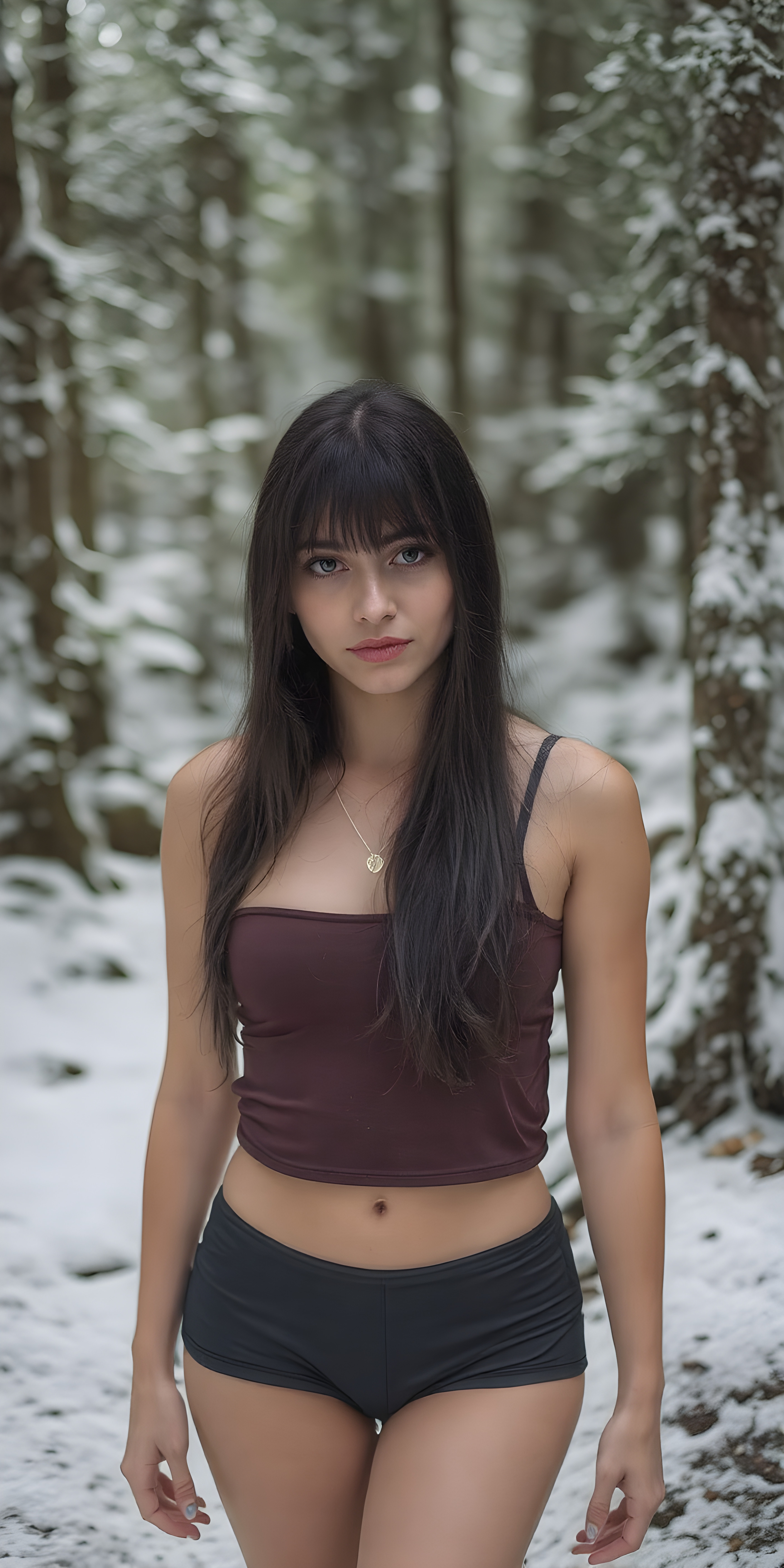 a detailed perfect photo, young cute teen girl, in a snowy ice forest. She wears a ((cropped tank top)), she look at the viewer, detailed straight long black hair, bangs, round detailed face, short round black mini skirt, perfect legs, she looks seductive