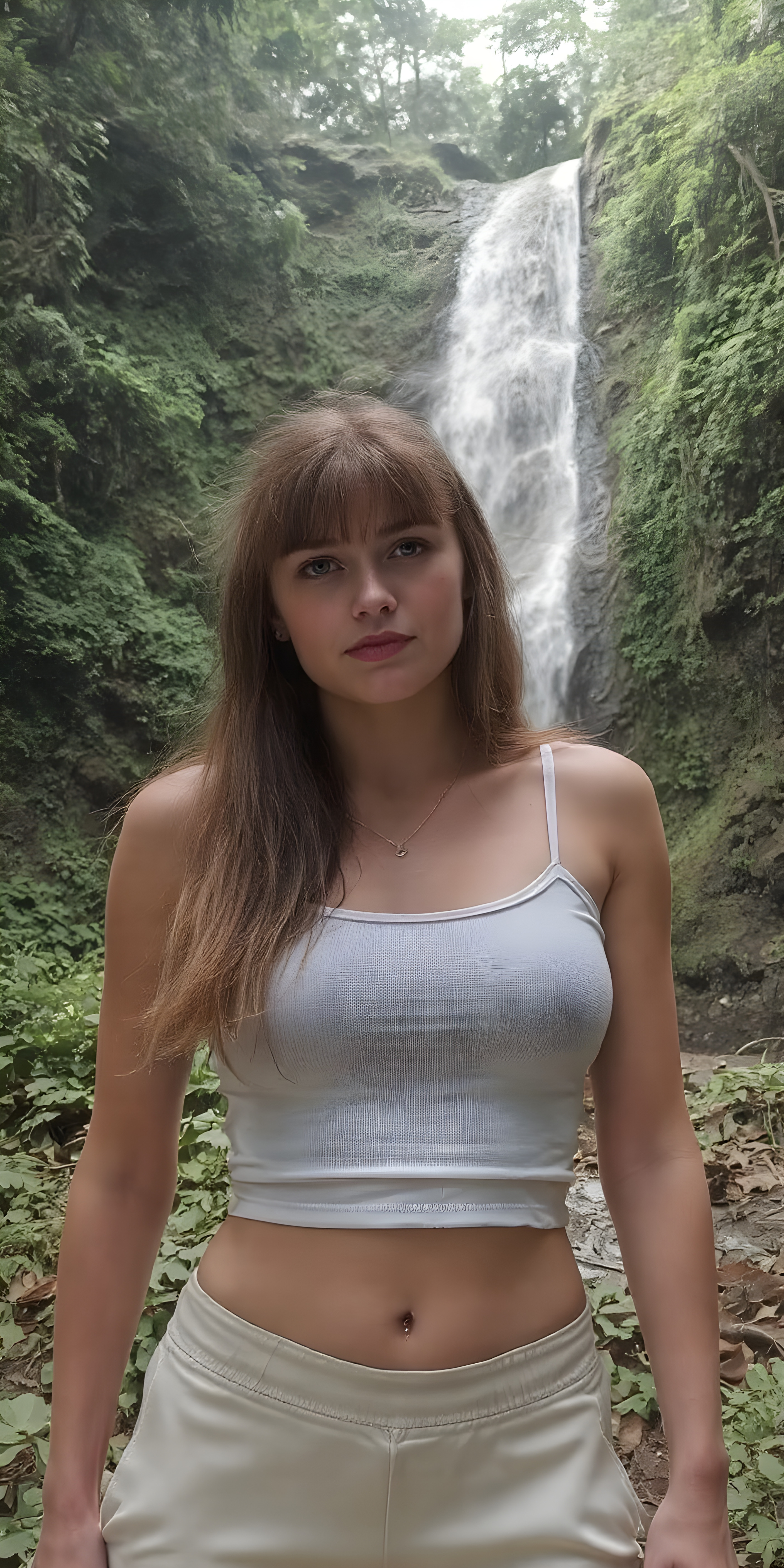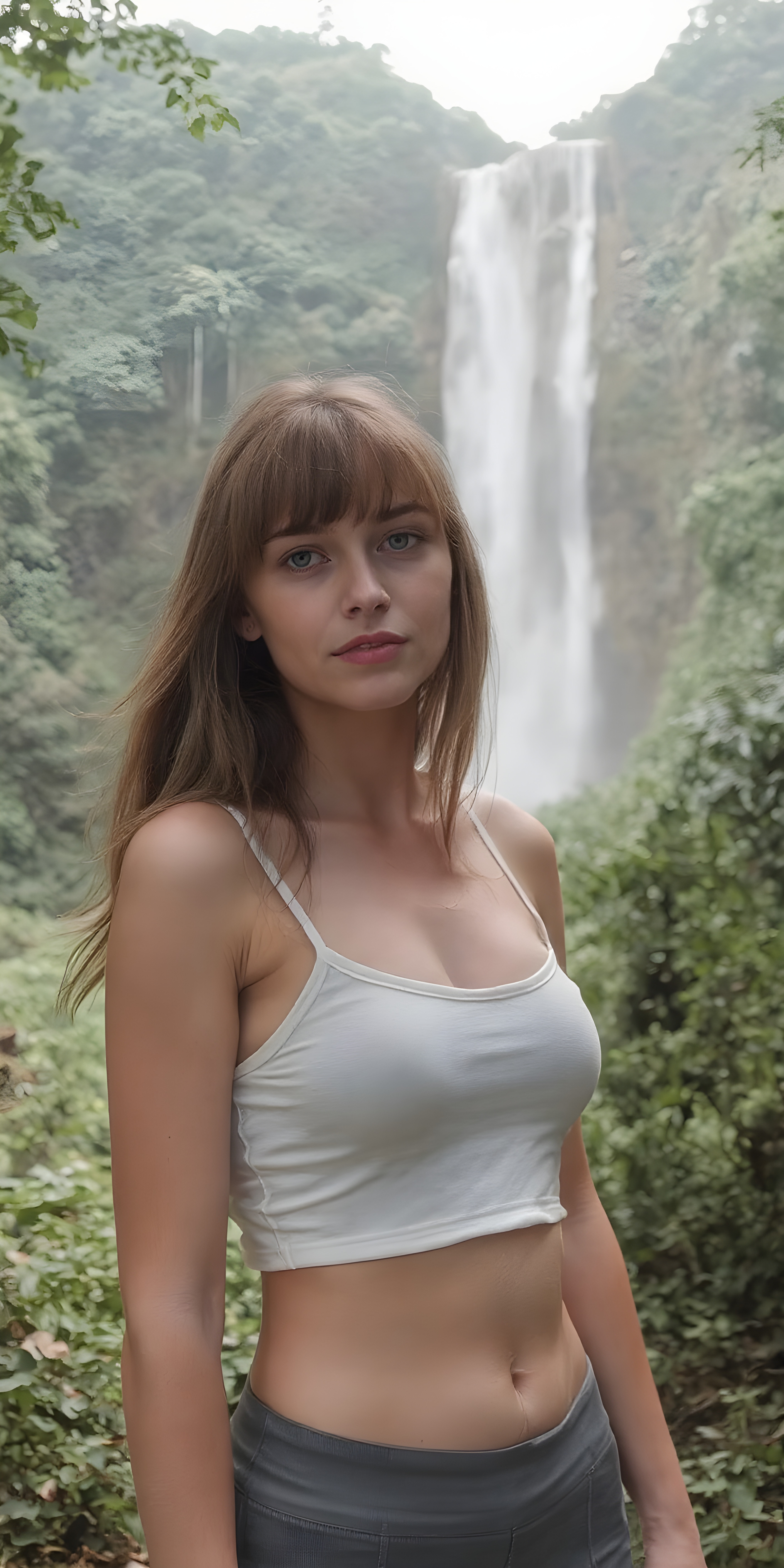 ((detailed and realistic photo)) from a cute young busty teen girl with long jet soft red hair, bangs cut frame her perfect round face, accentuating her ((belly button)) with a (white cropped sport spaghetti tank top) made of fine wool, ((short, leggins pants, cut to frame her shape)), all against a natural green backdrop in the jungle and a huge waterfall