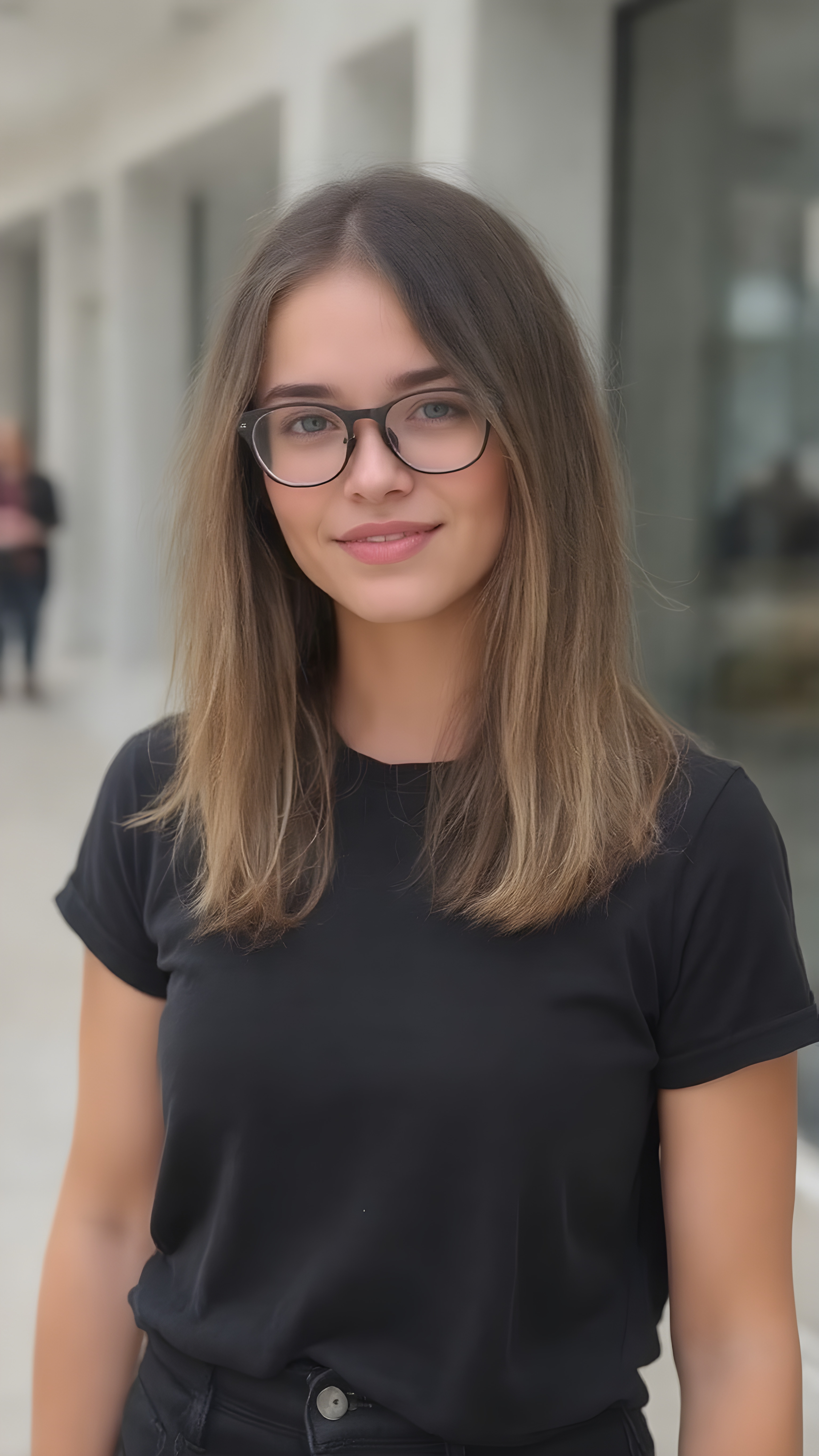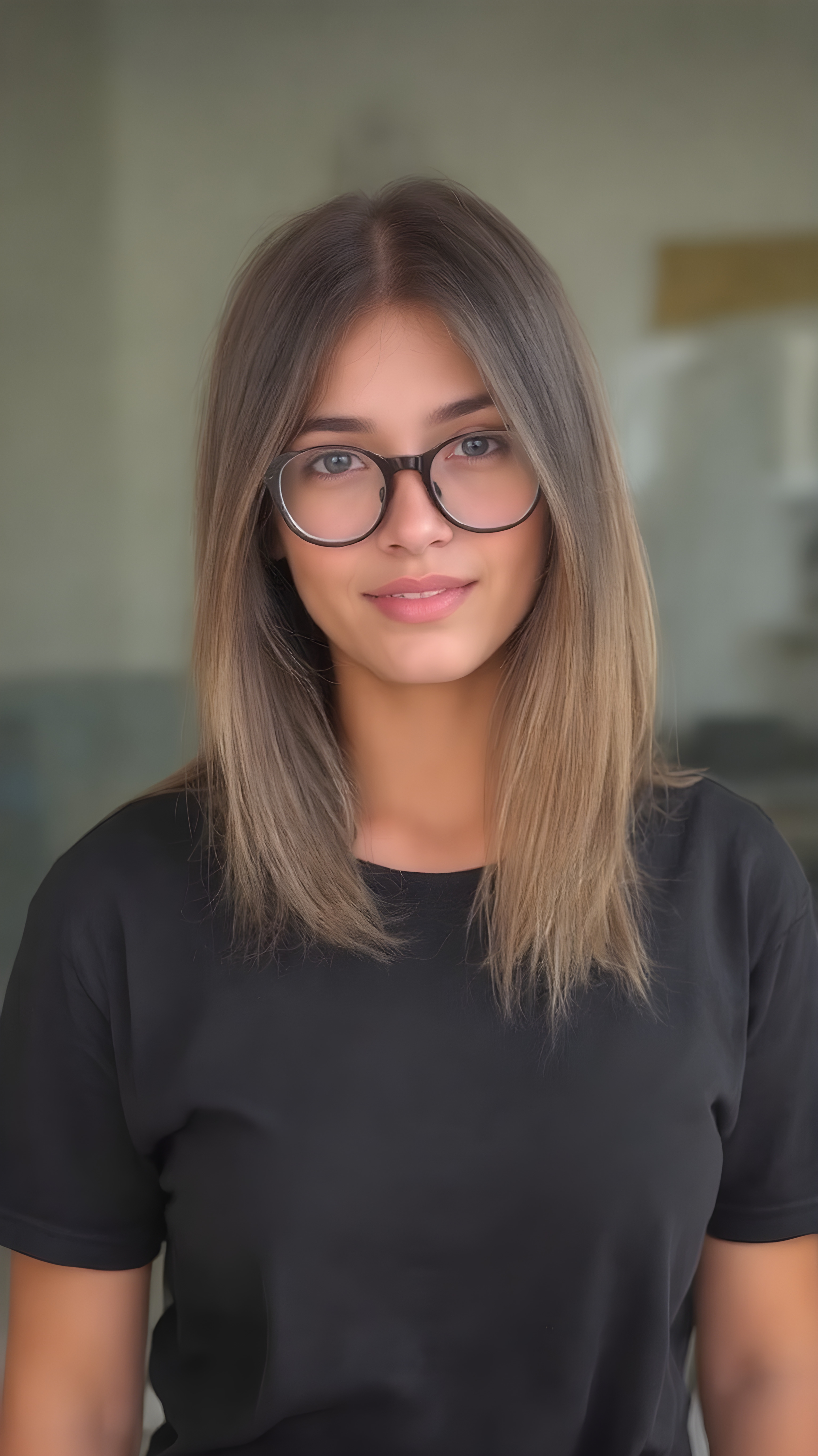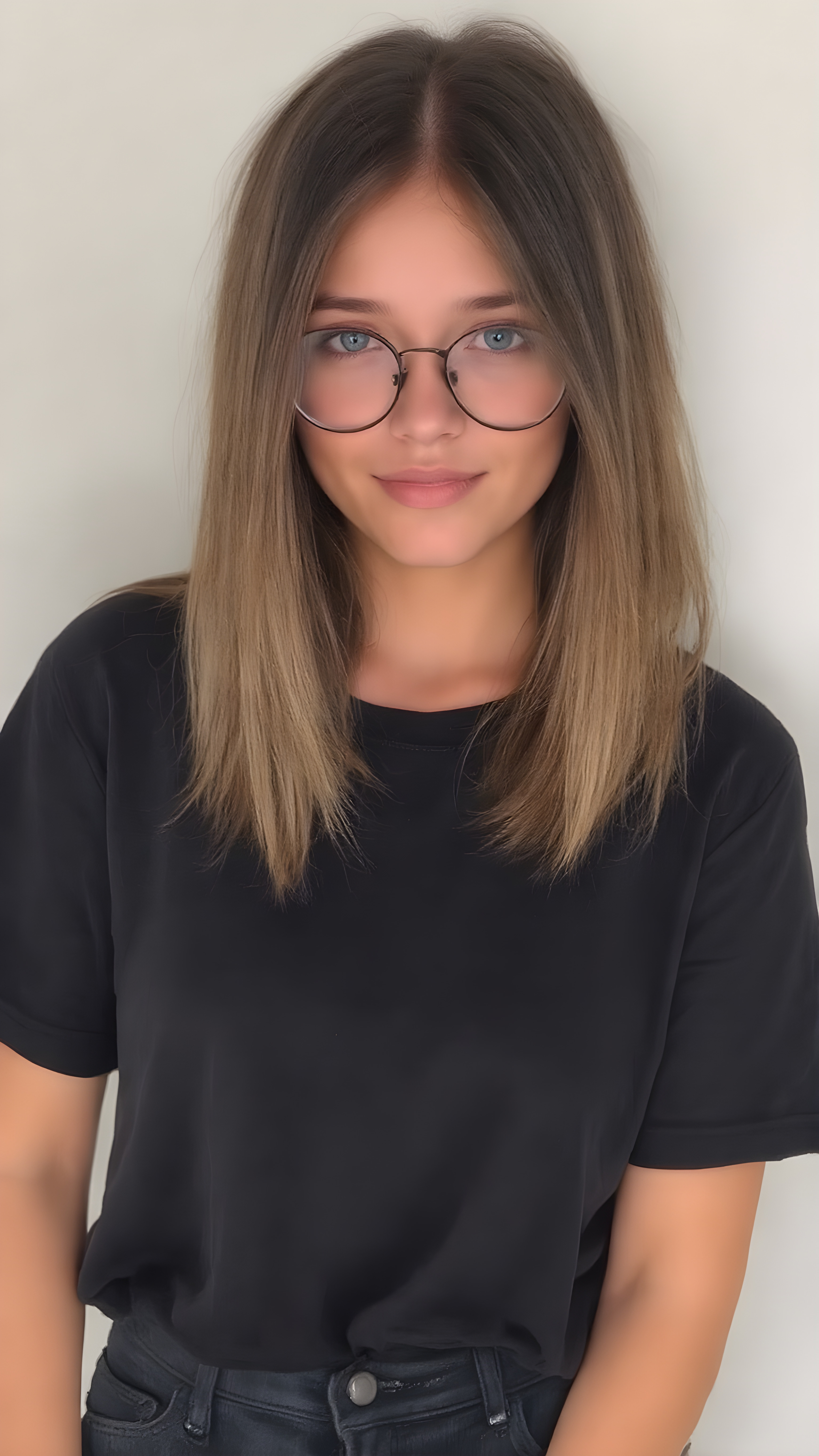 she’s a stunning young woman, around 19 years old. She’s incredibly beautiful and cute. She’s wearing a gorgeous dark black t-shirt and stylish black baggy jeans. Her medium-length hair is absolutely lovely, straight and perfectly framed for her face. Her hair color is a beautiful blend of light brown and dark black tones. She complements her outfit with a pair of beautiful glasses, adding a touch of elegance to her overall look.
