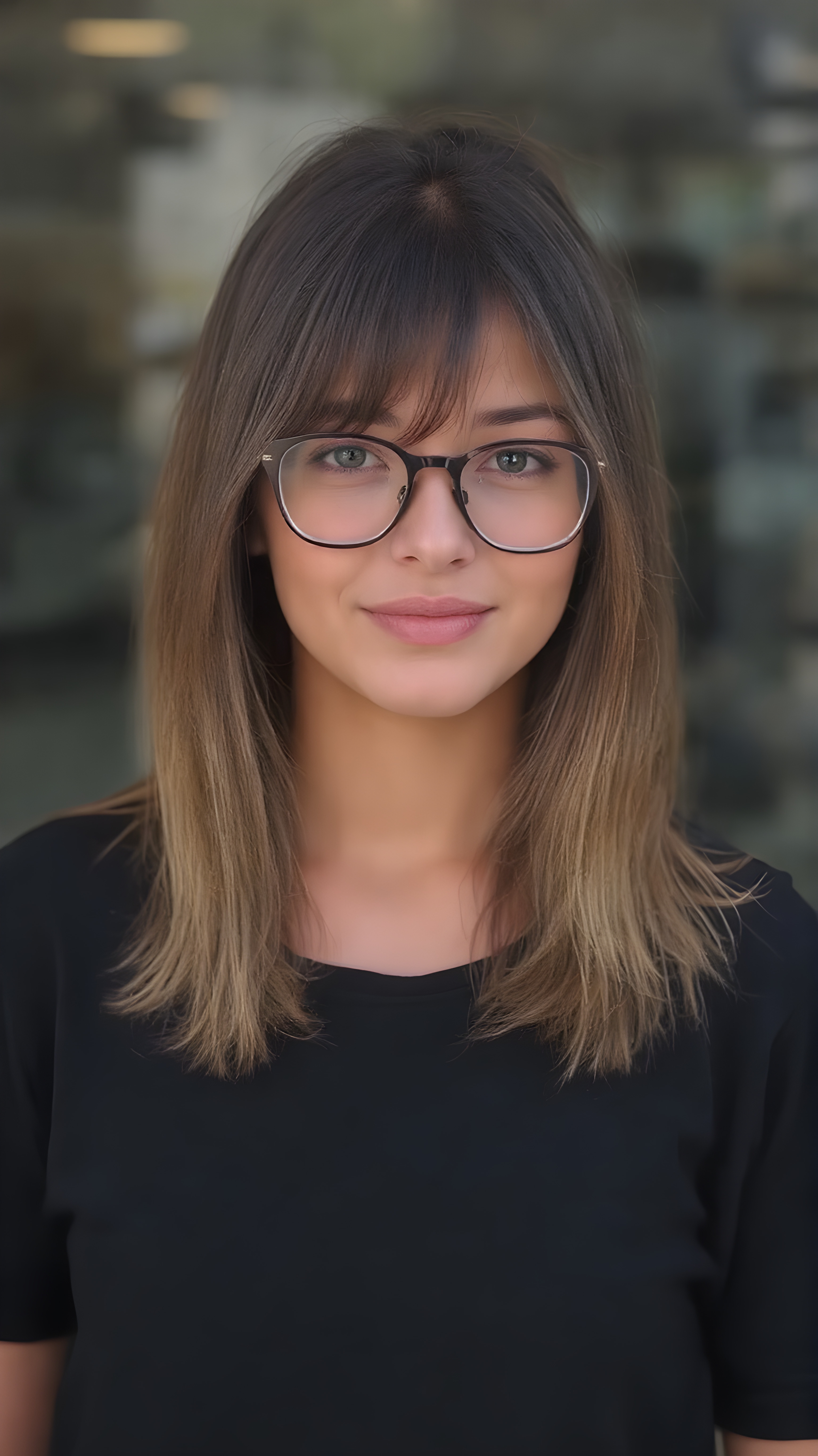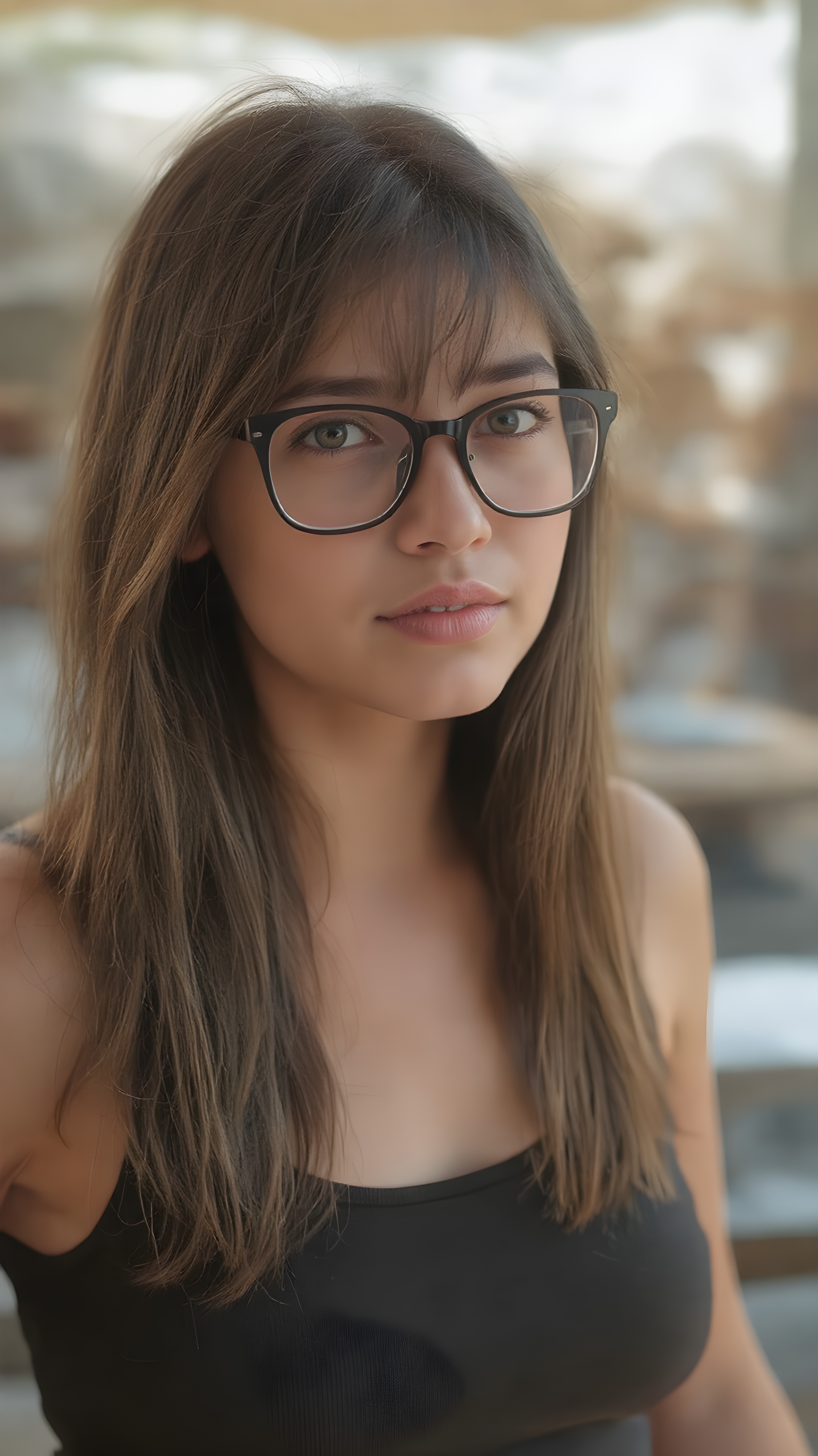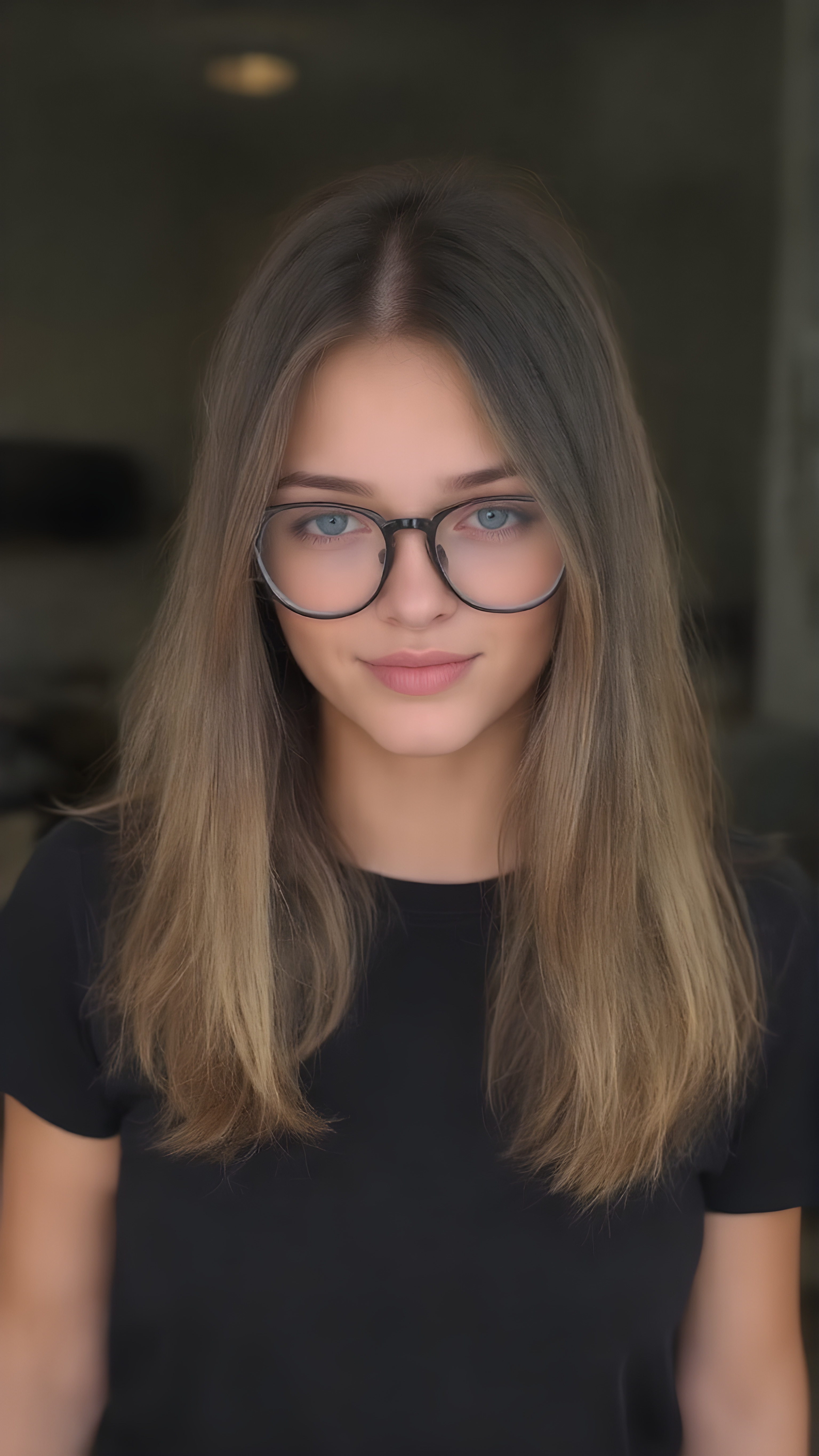 she’s a stunning young woman, around 19 years old. She’s incredibly beautiful and cute. She’s wearing a gorgeous dark black t-shirt and stylish black baggy jeans. Her medium-length hair is absolutely lovely, straight and perfectly framed for her face. Her hair color is a beautiful blend of light brown and dark black tones. She complements her outfit with a pair of beautiful glasses, adding a touch of elegance to her overall look.
