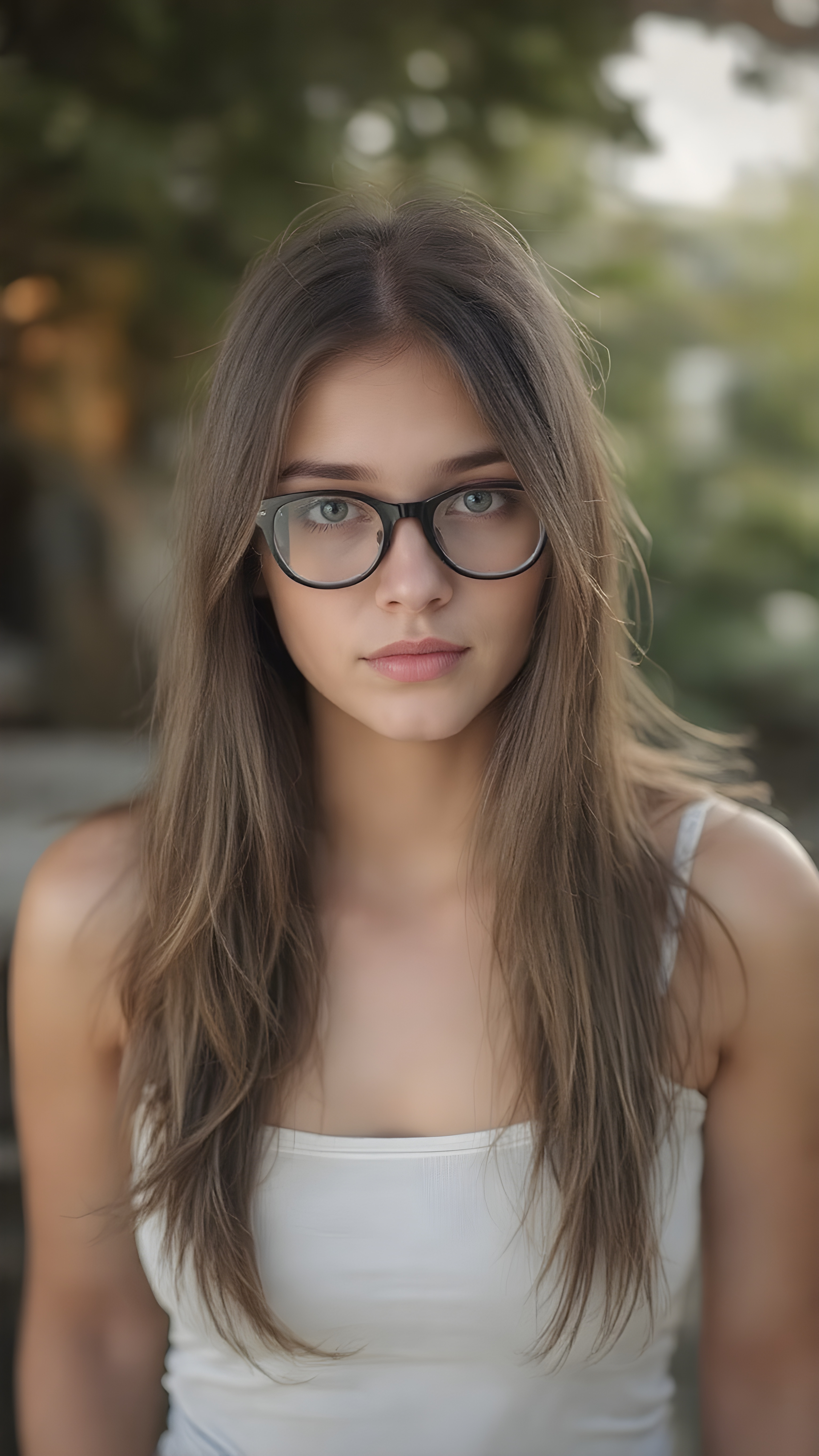 A (((beautiful cute nerd girl, black glasses))) (((full body view))) with long, brown shoulder-length jet soft flowing hair, ((dark brown eyes)) that convey a sense of warmth and playfulness, dressed in a (((tight, form-fitting tank top))), which emphasizes her perfect body in a tasteful, ((sunny backdrop)) (((perfect hands))) that convey a sense of warmth and elegance