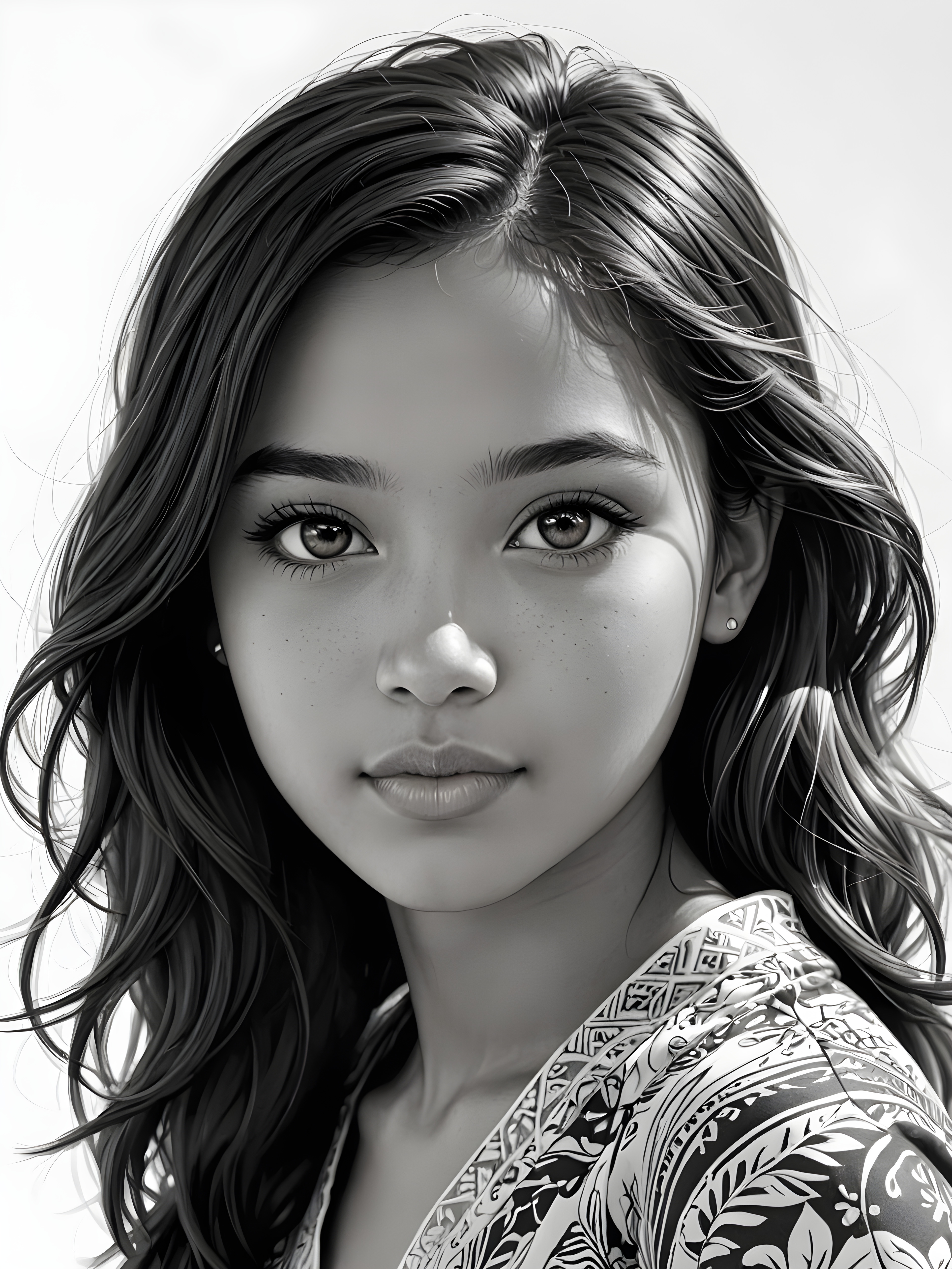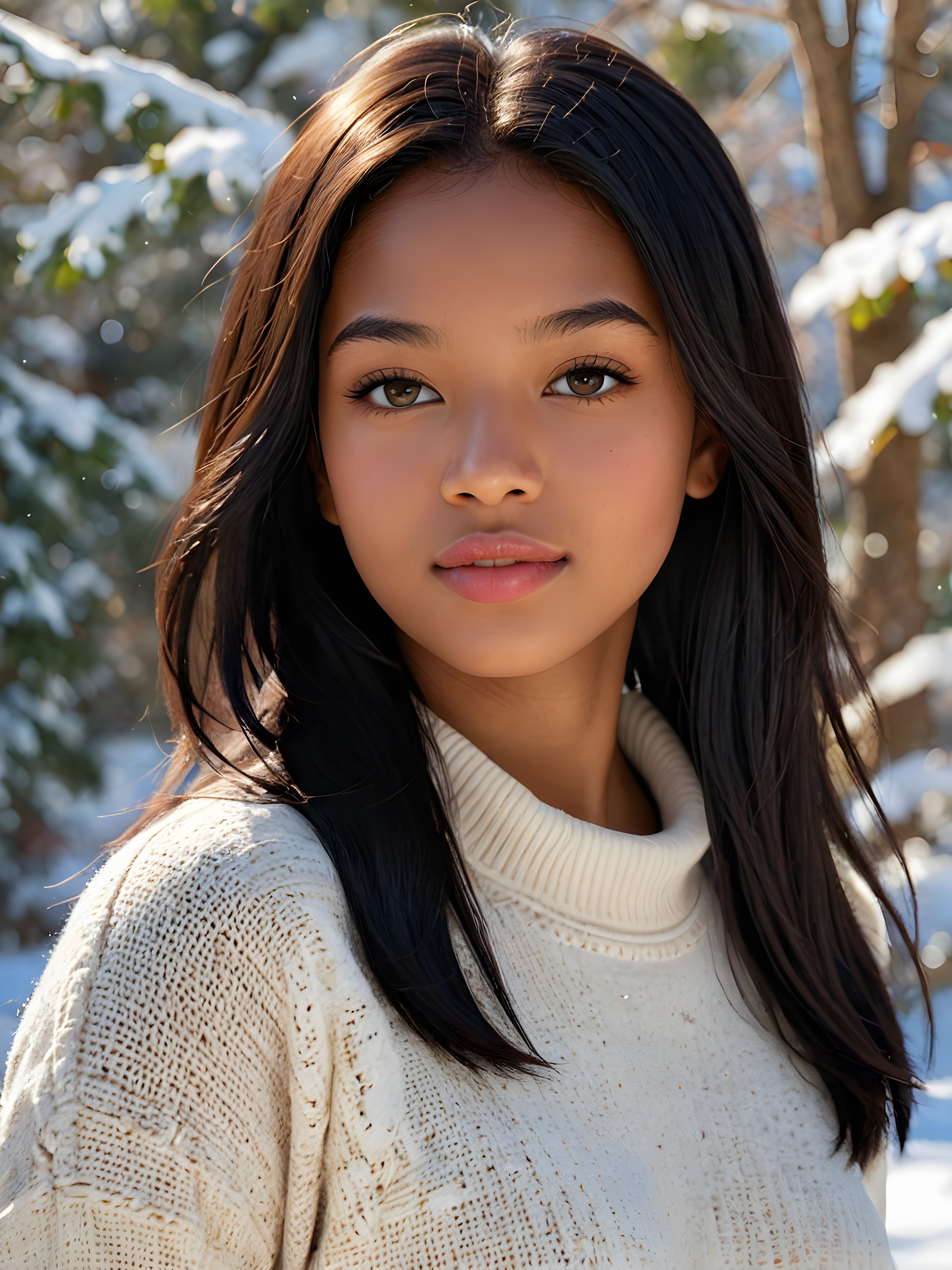 a detailed and realistic photo:a(((stunning young light brown-skinned Exotic teen girlwith flawless, soft skin))) (glossy hair with subtle layering, (((vivid obsidian black soft straight hair)))), whose frame a (seriously sensual face) with (dramatically contrasting, full, (((natural lips)))), round face and a warm smile, the mouth slightly open with white teeth, (light brown eyes), set against a (broodingly atmospheric snow backdrop) for an unforgettable (upper body shot). Her features are captured in (intense detail), accentuated by the (ombré shadow and highlights) that draw the eye, ((she wears a white , finely knitted wool sweater that emphasizes her perfectly shaped body)), ((gorgeous)) ((side view))