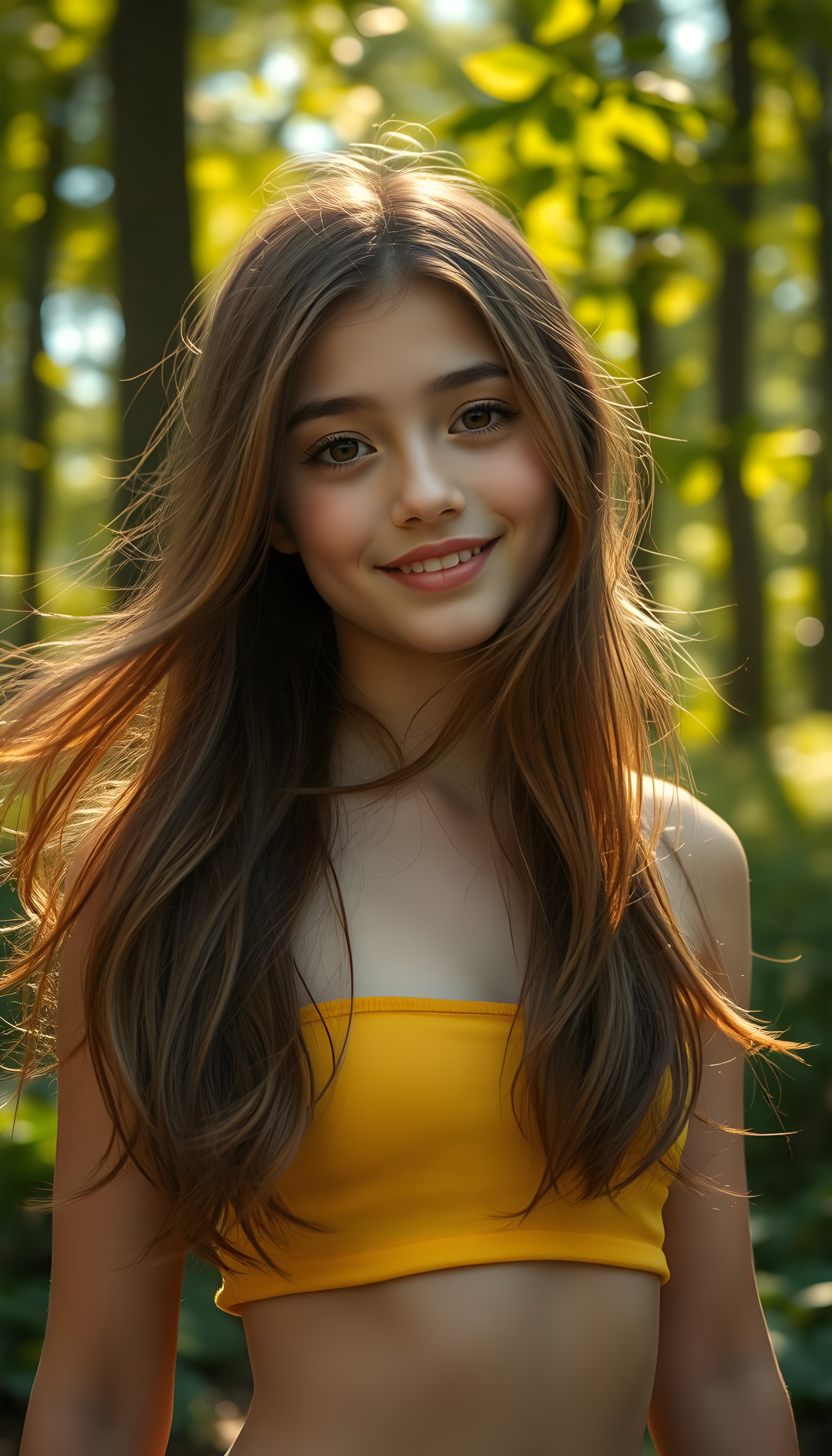 Upper body portrait from a playful, sunlit forest glade features a radiant young cute girl with flowing chestnut hair cascading down her shoulders. She’s dressed in a vibrant, summery yellow and green sun-kissed crop top, complementing her fair, flawless skin. Her soft, expressive eyes sparkle with curiosity and her lips curl into a friendly smile. The scene is alive with dappled sunlight filtering through lush trees, casting a warm, golden glow. A gentle breeze stirs the leaves around her, adding a sense of serene motion to the tranquil setting.