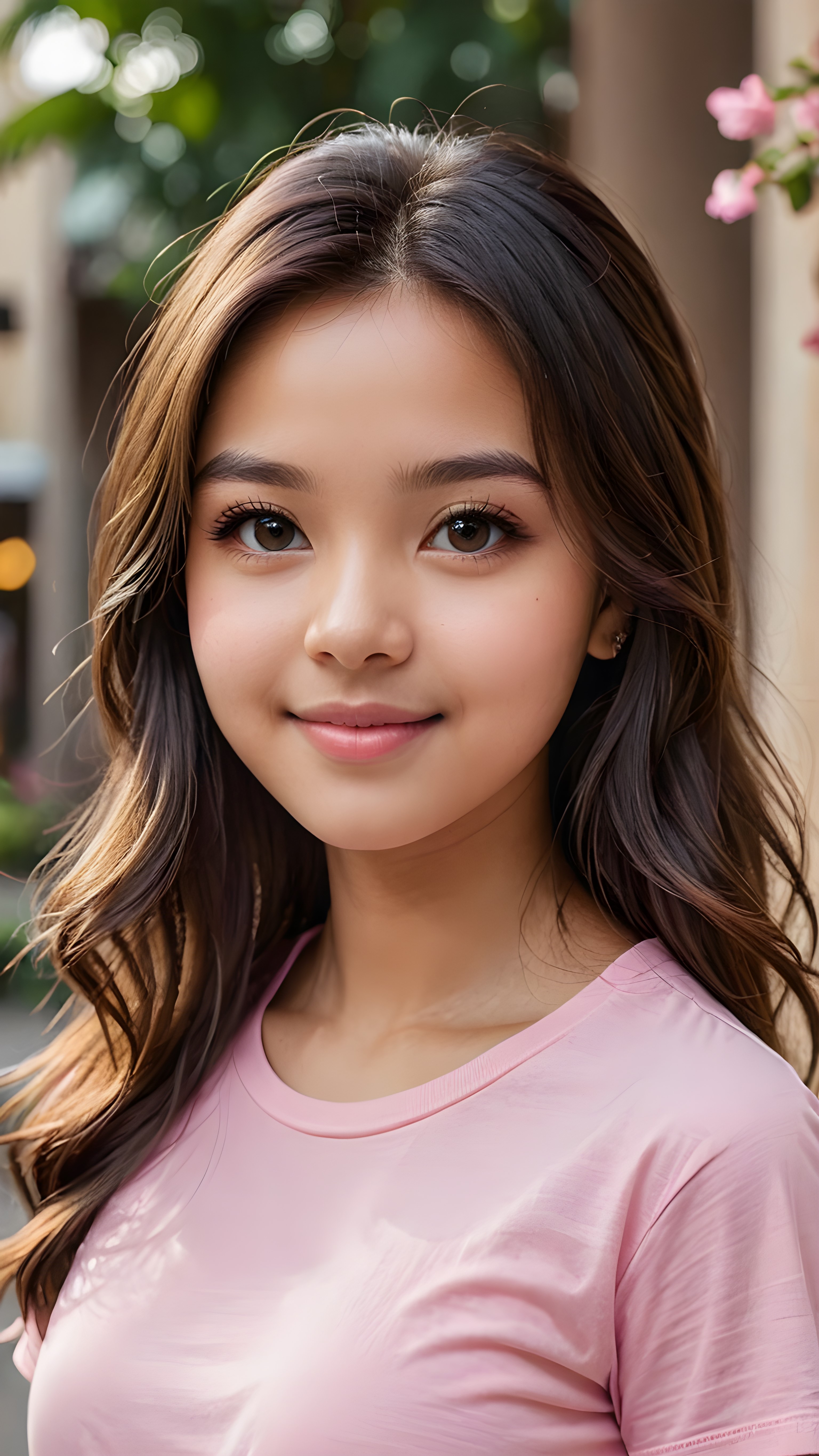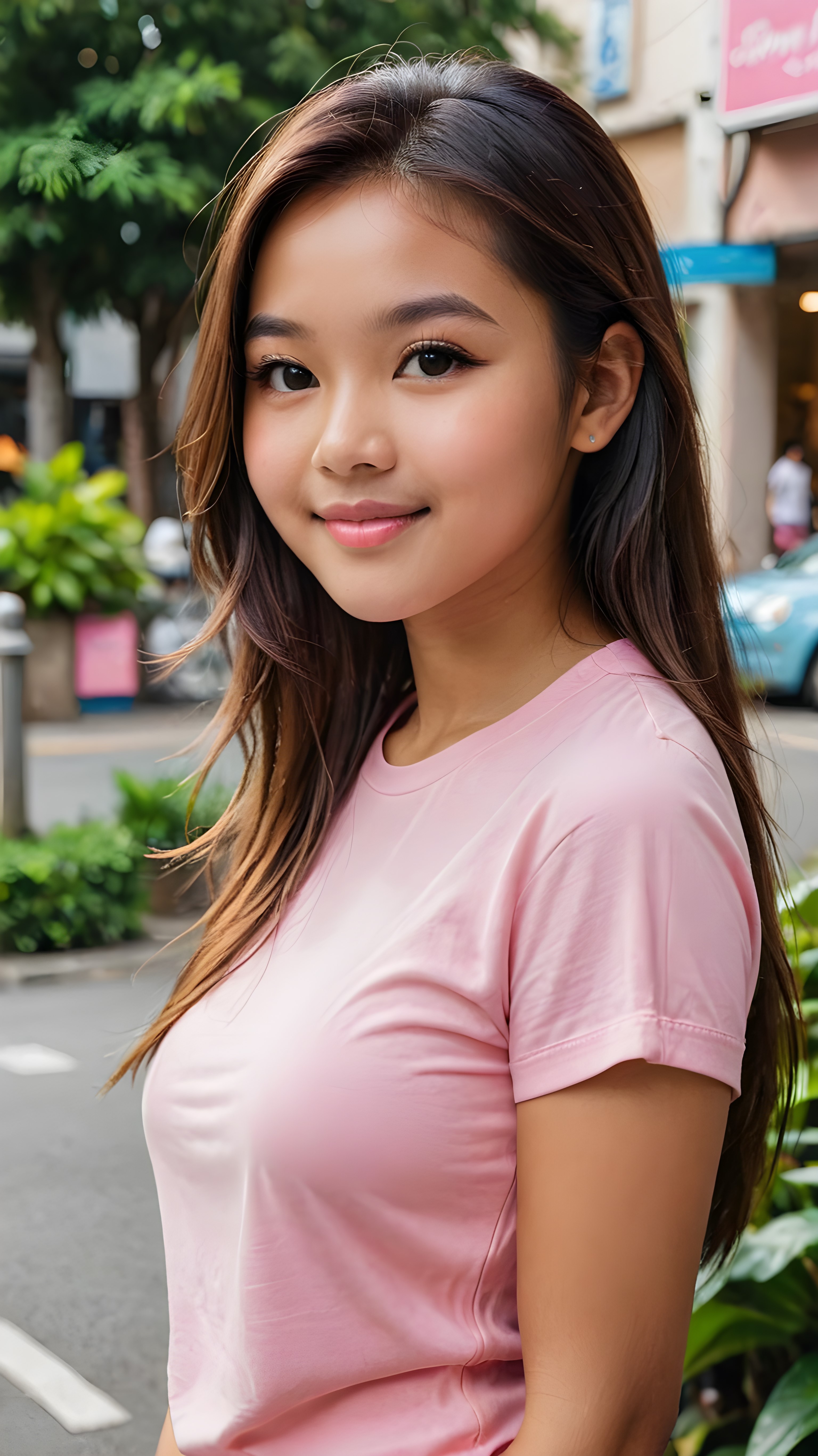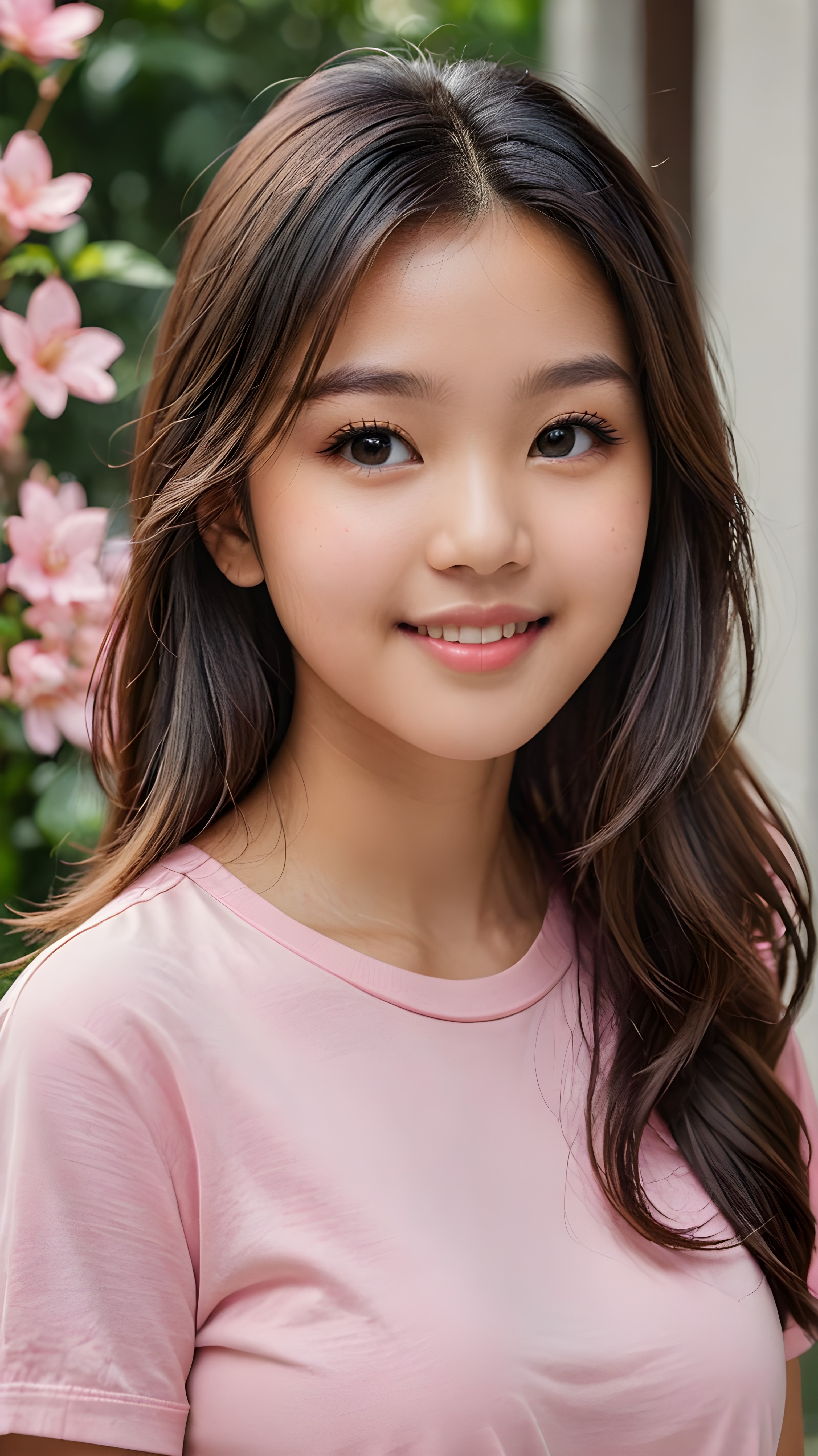 a stunning portrait (((ultra realistic professional photograph))) ((cute)) ((gorgeous)) excellently capturing an amiable, young +ATTRIBUT teen girl, straight jet long hair, round face, full lips, smile, side view, ((pink no printed t-shirt))