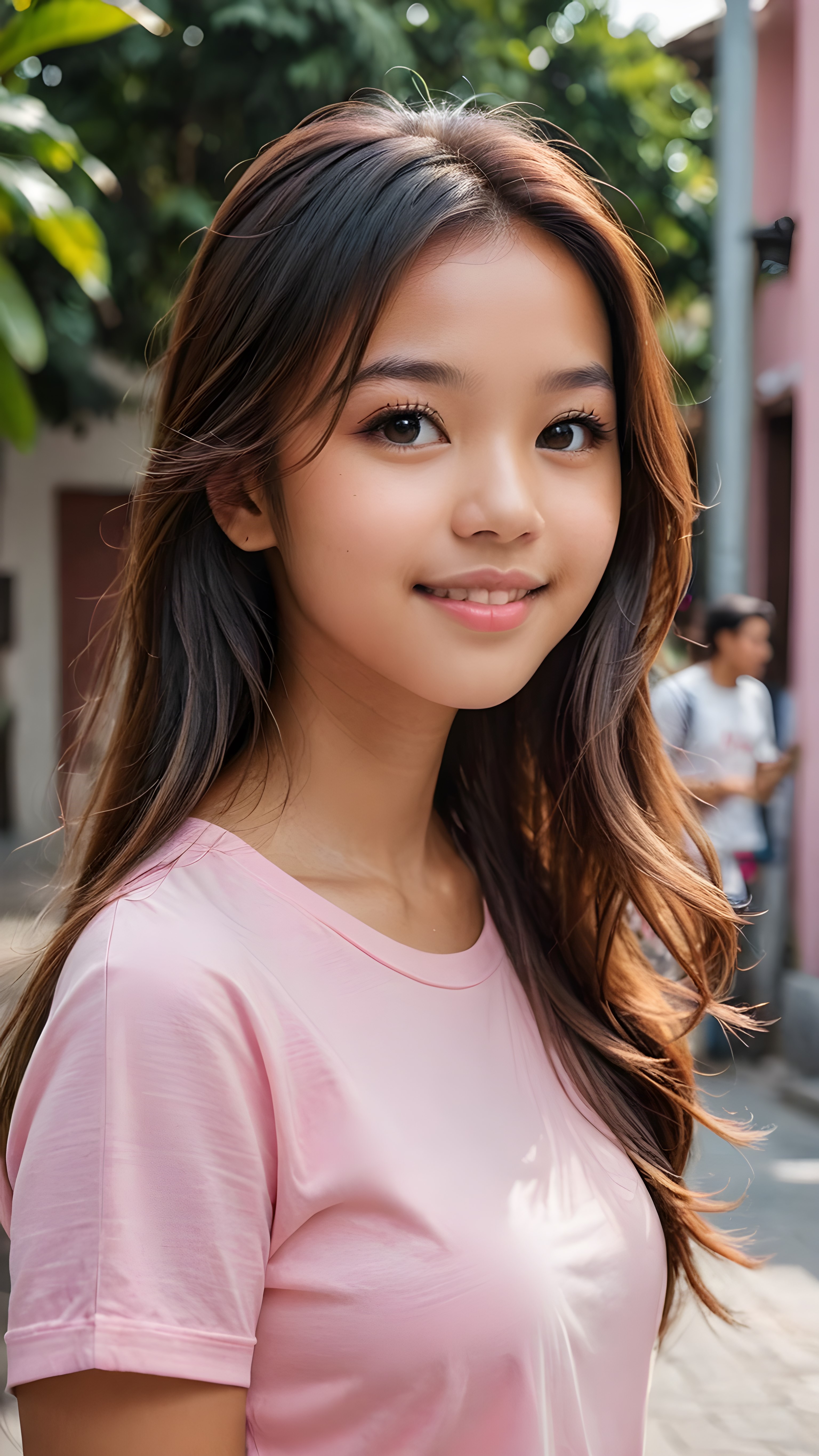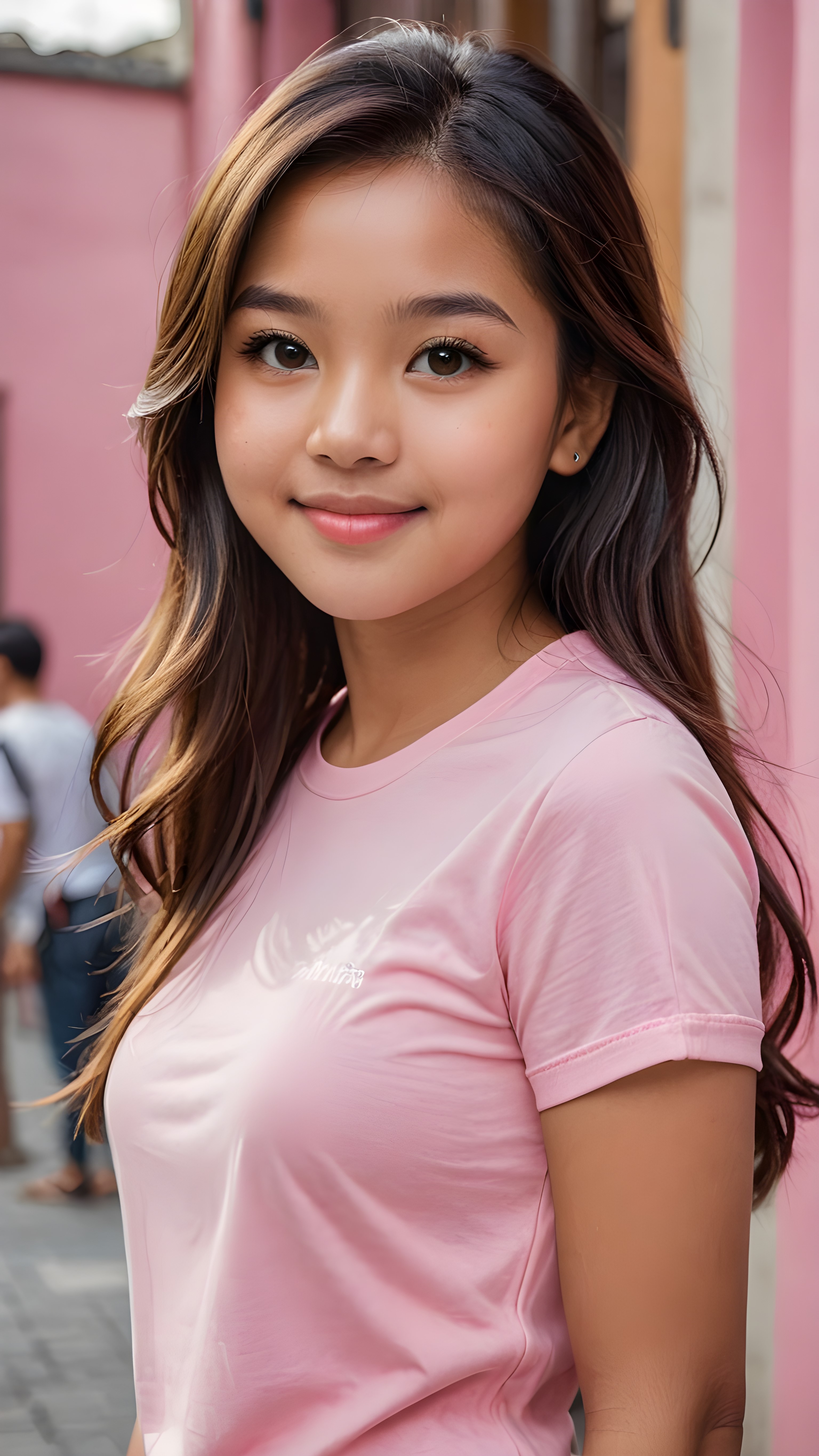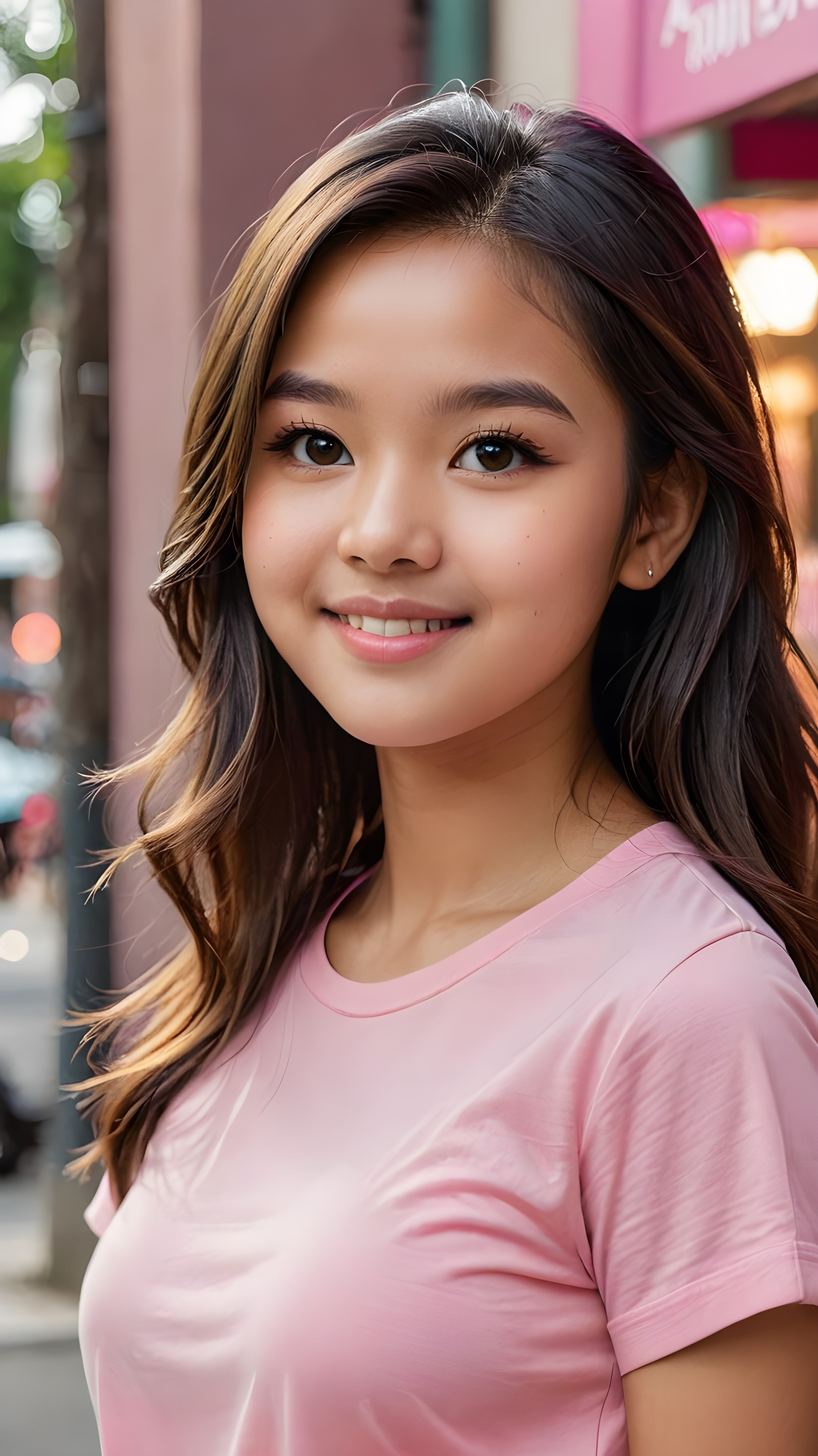 a stunning portrait (((ultra realistic professional photograph))) ((cute)) ((gorgeous)) excellently capturing an amiable, young +ATTRIBUT teen girl, straight jet long hair, round face, full lips, smile, side view, ((pink no printed t-shirt))