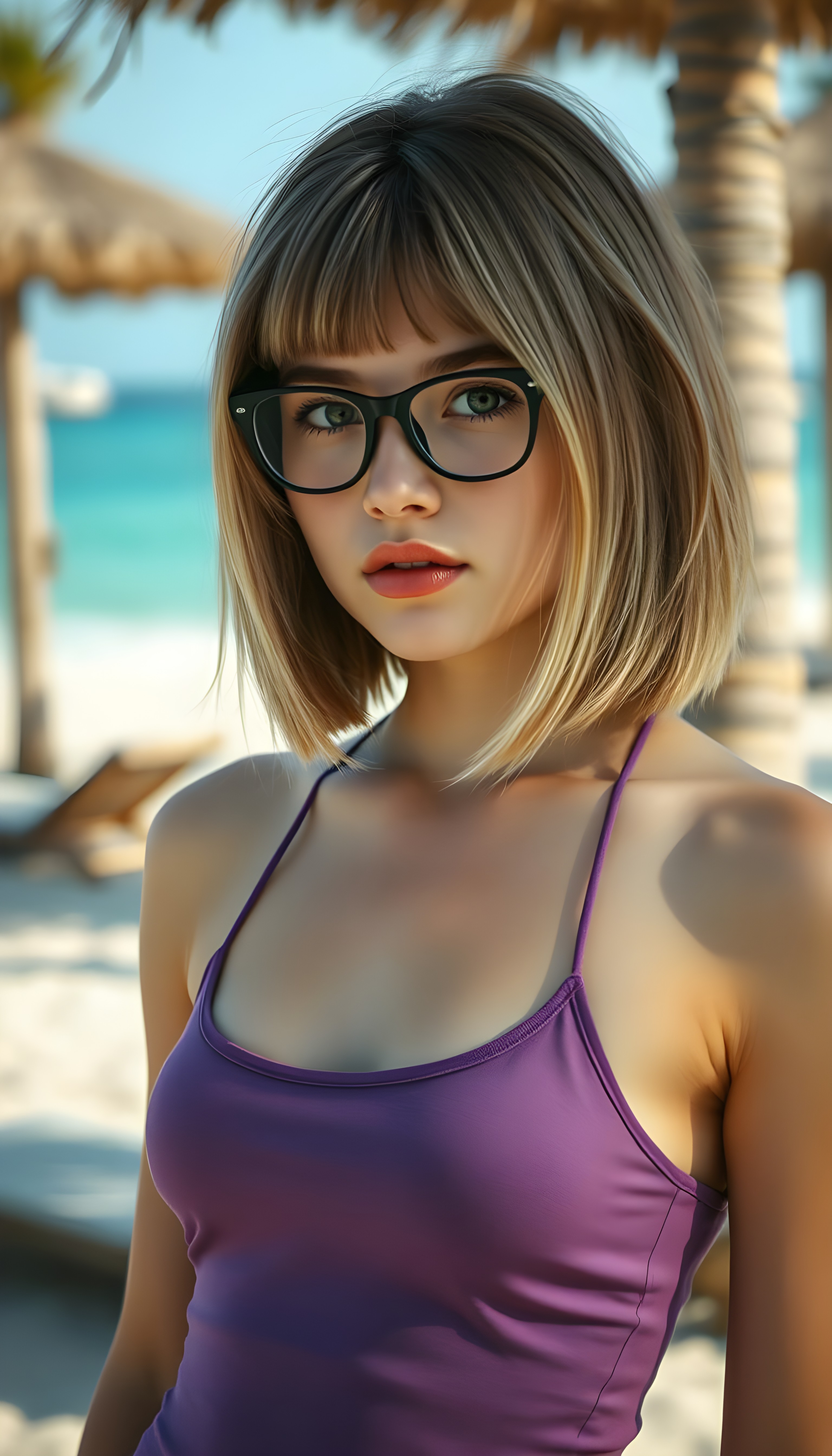 super realistic, detailed portrait, a beautiful young Asian girl with long brown straight hair and white highlights looks sweetly into the camera. She wears a white thin t-shirt. The t-shirt support her perfect female body. White plain simple backdrop.