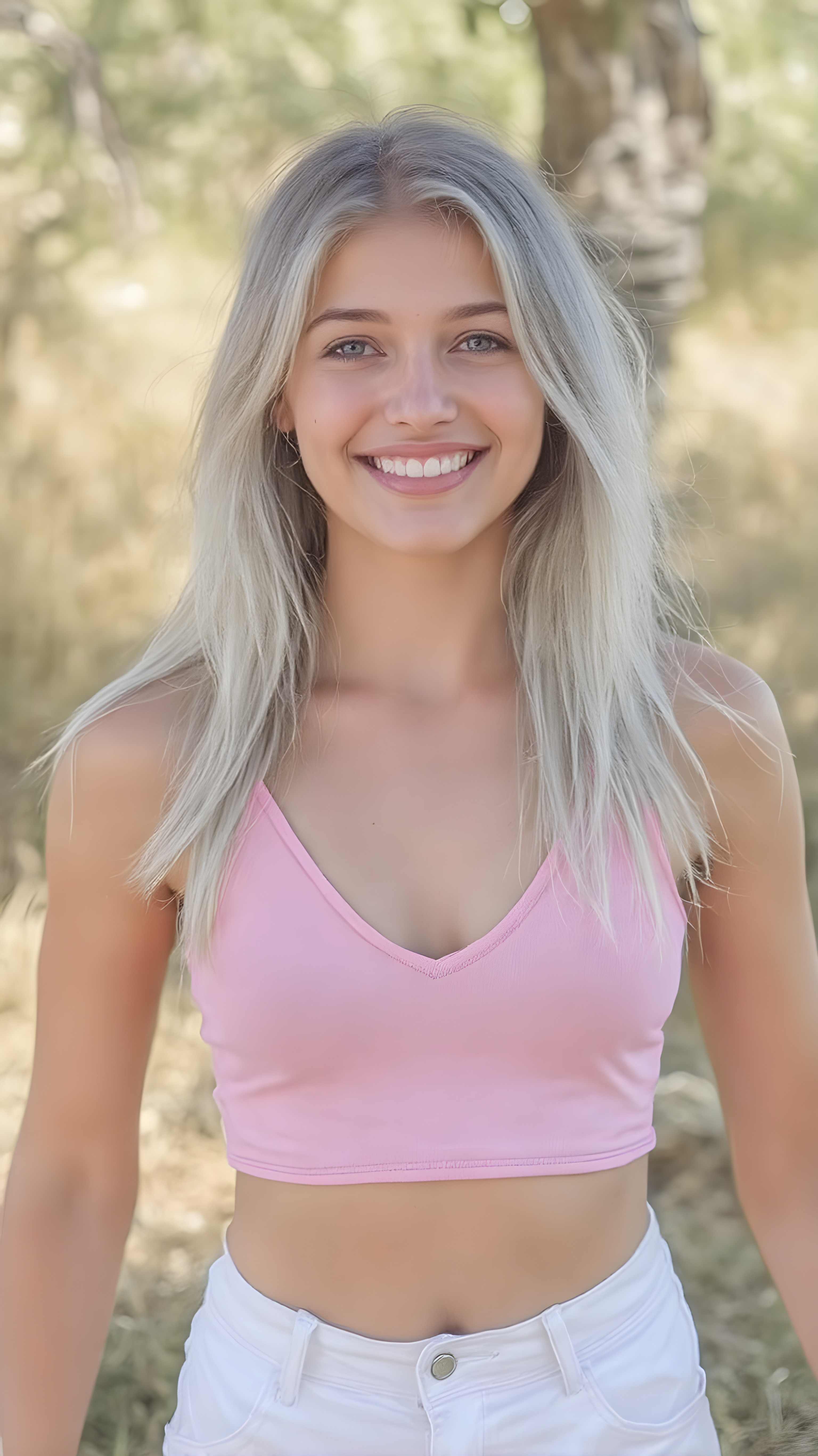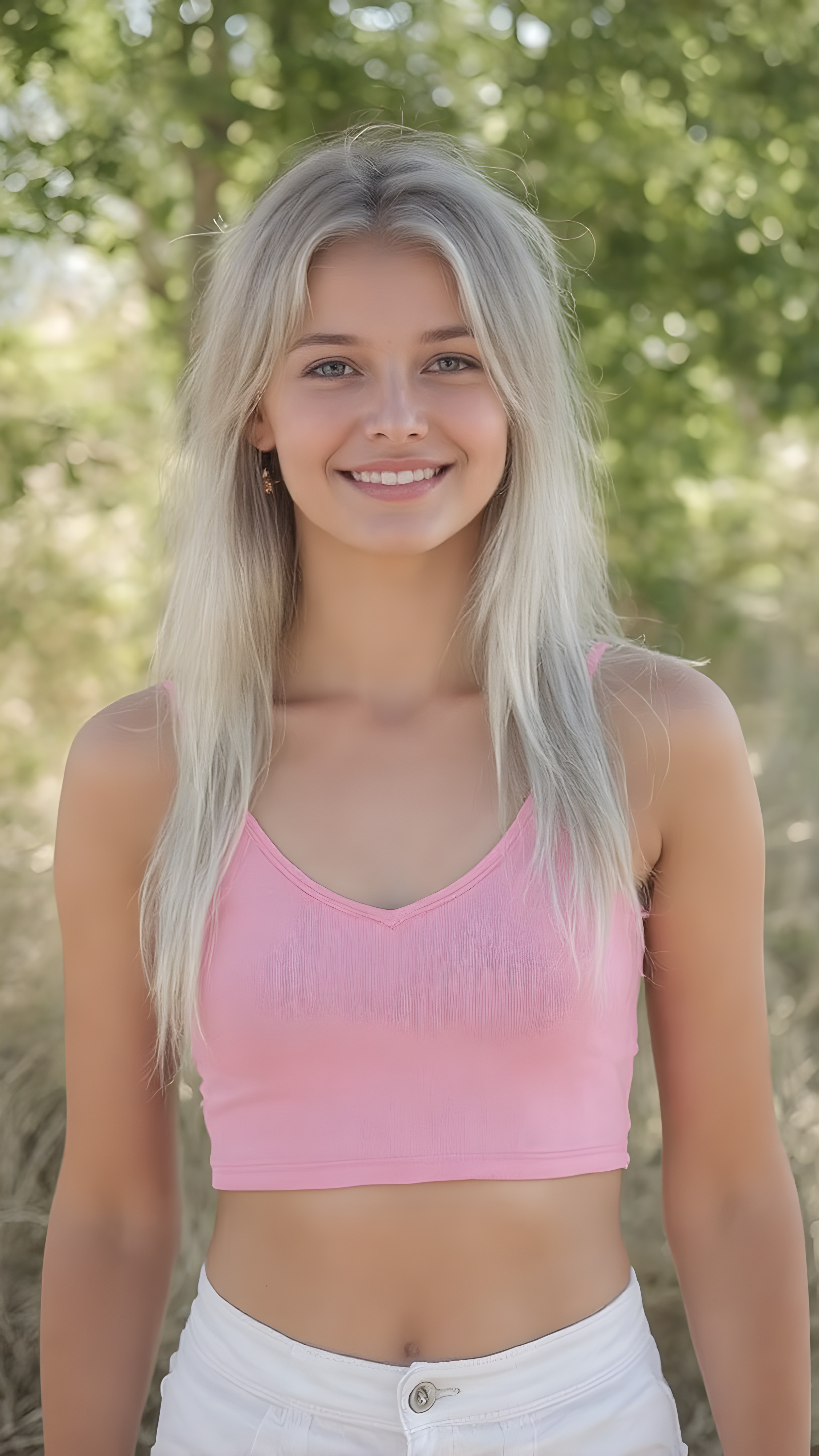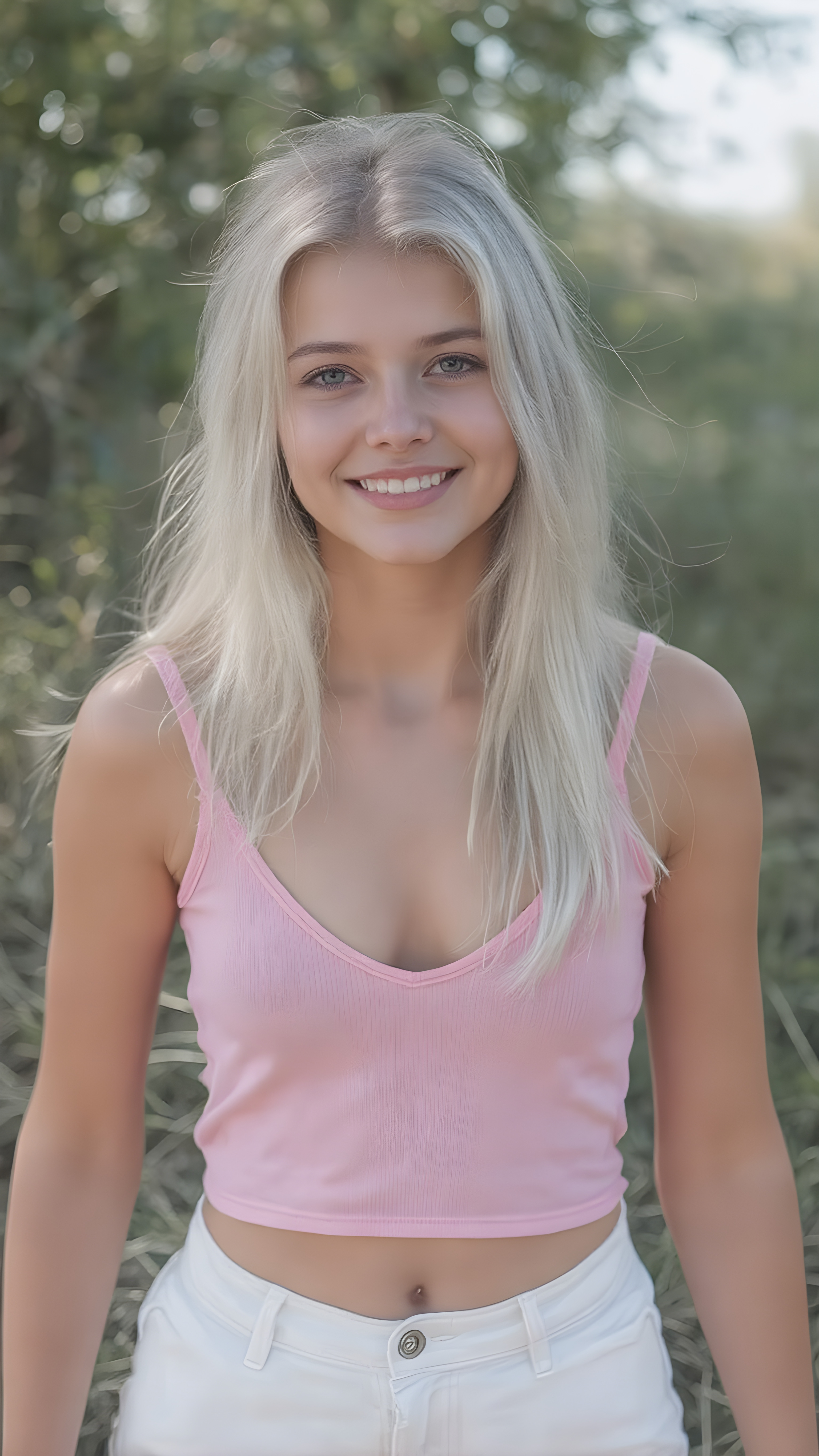 a realistic and detailed portrait of teen girl, 16-year-old level, in a plunge neck ((short pink crop tank top)), ((short white pants)), ((angelic round face)), ((white soft long straight hair)) in a (((carefree, happy expression))), surrounded by an air of exuberance and vivacity against a ((natural, sunny backdrop))