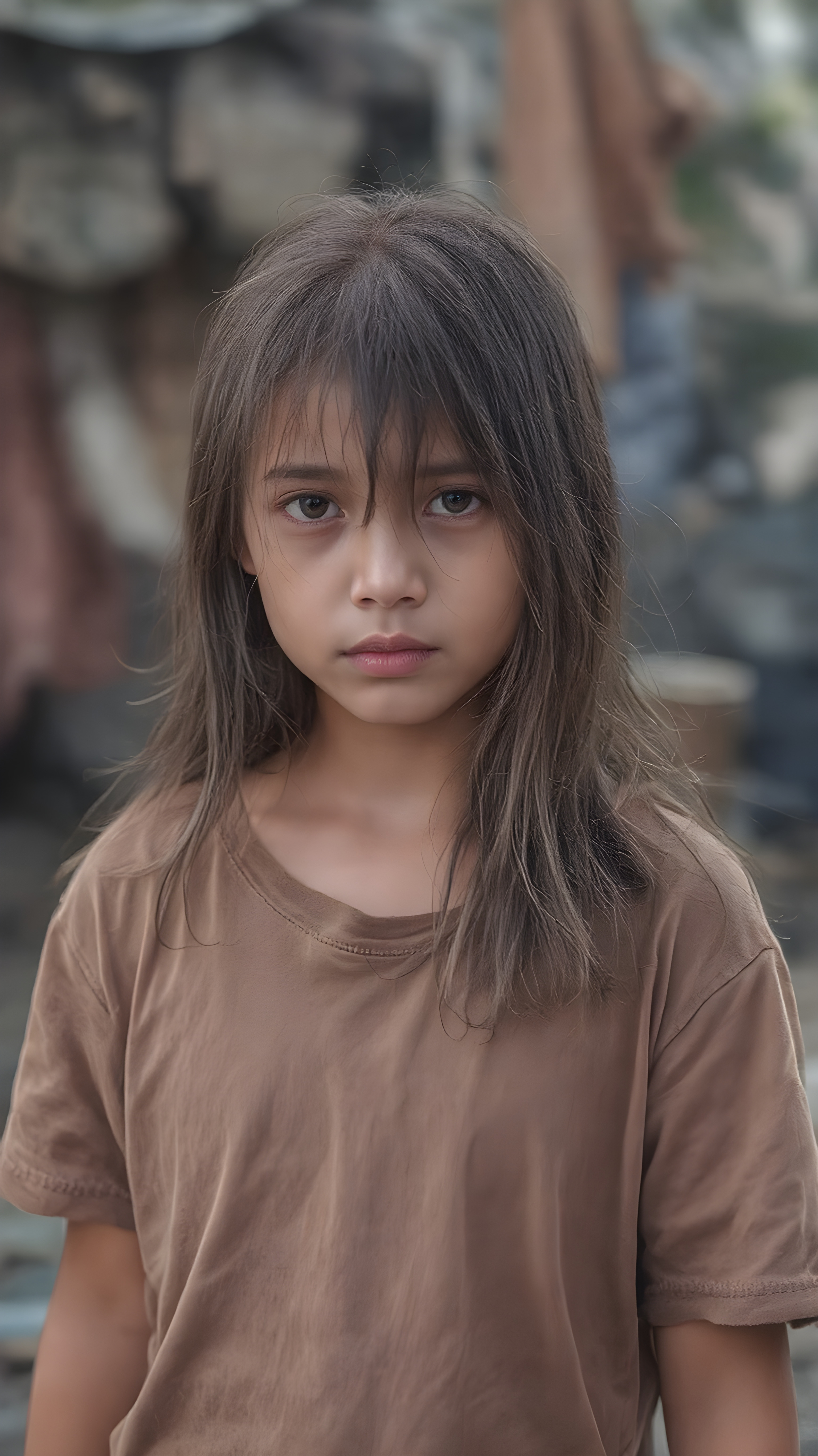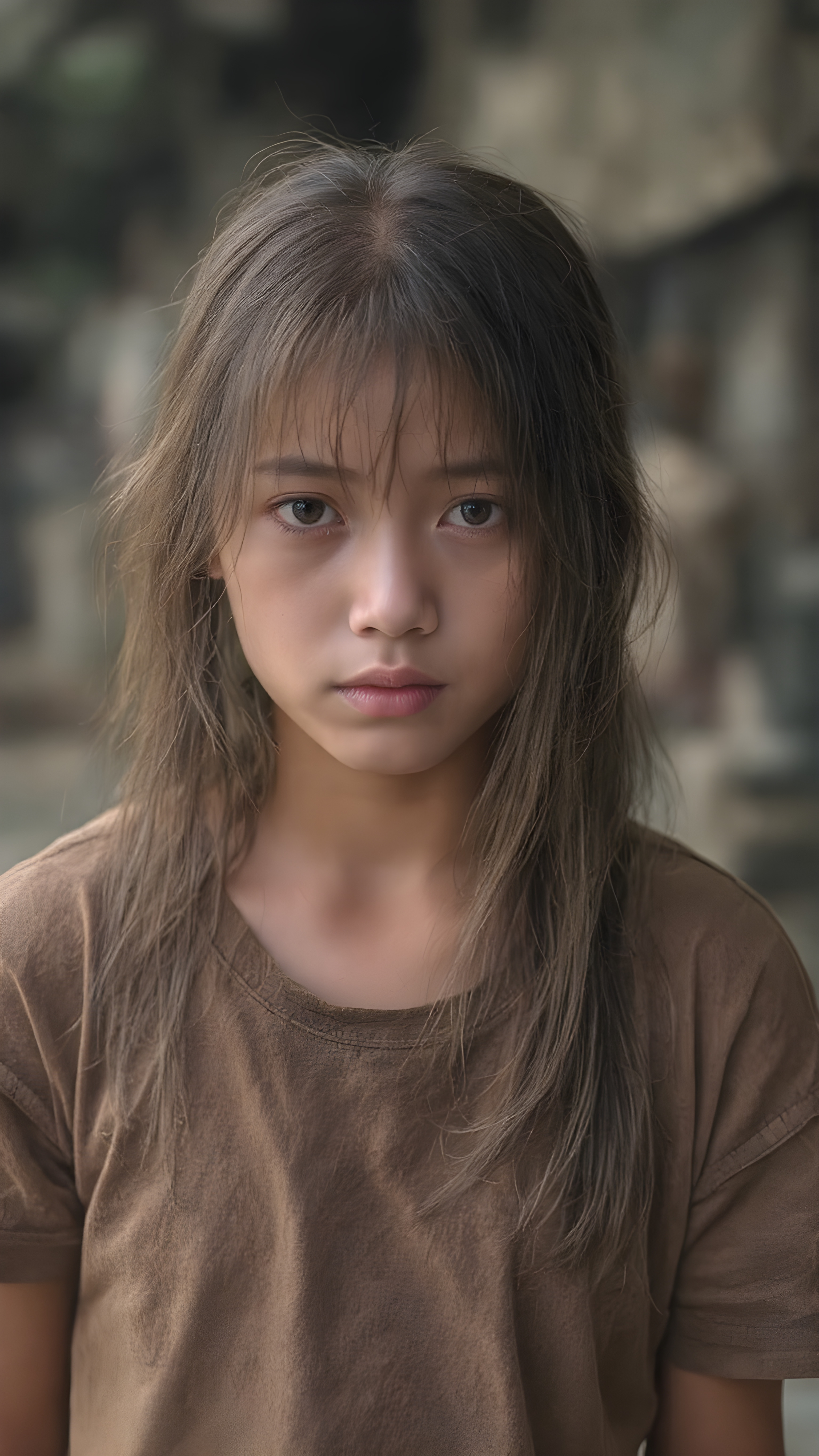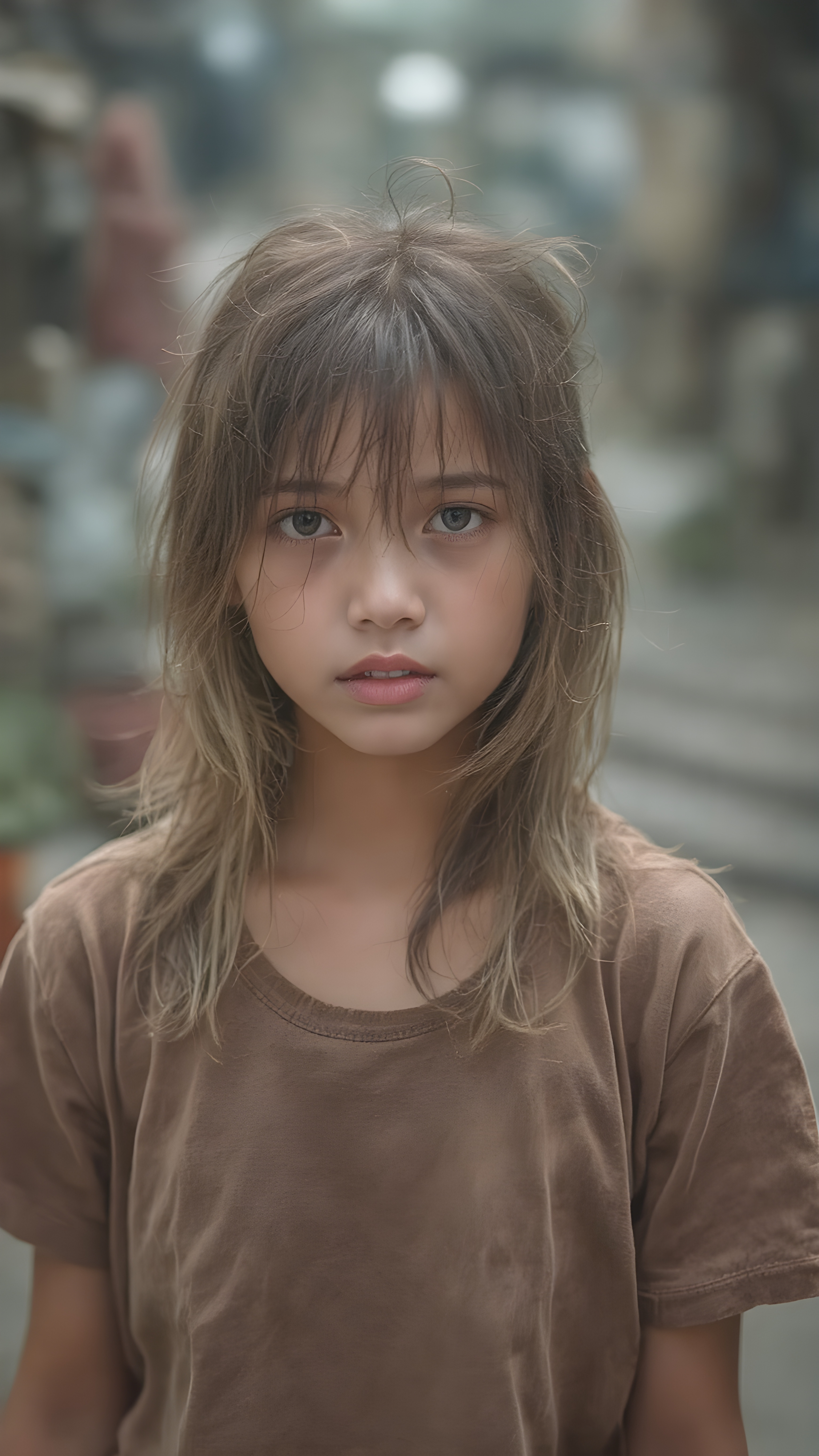 a very adult Asian tomboy girl, light brown hair, stand alone, straight messy wet hair, wet skin, looks sadly at the camera, she is looking for help, detailed hair, angelic face, full body, in the street, poor dressed in a tattered brown t-shirt, dirty, vietnamese style