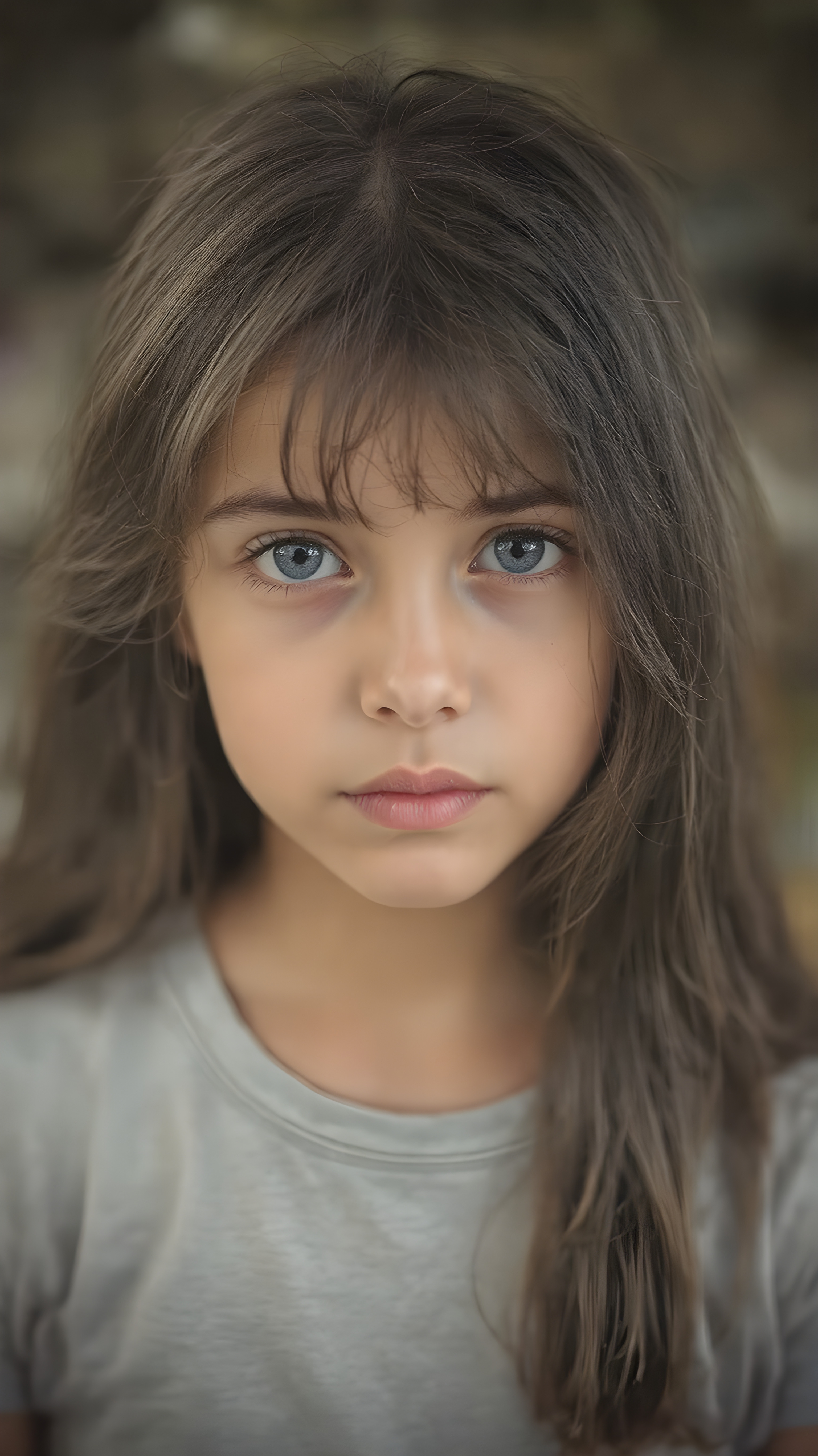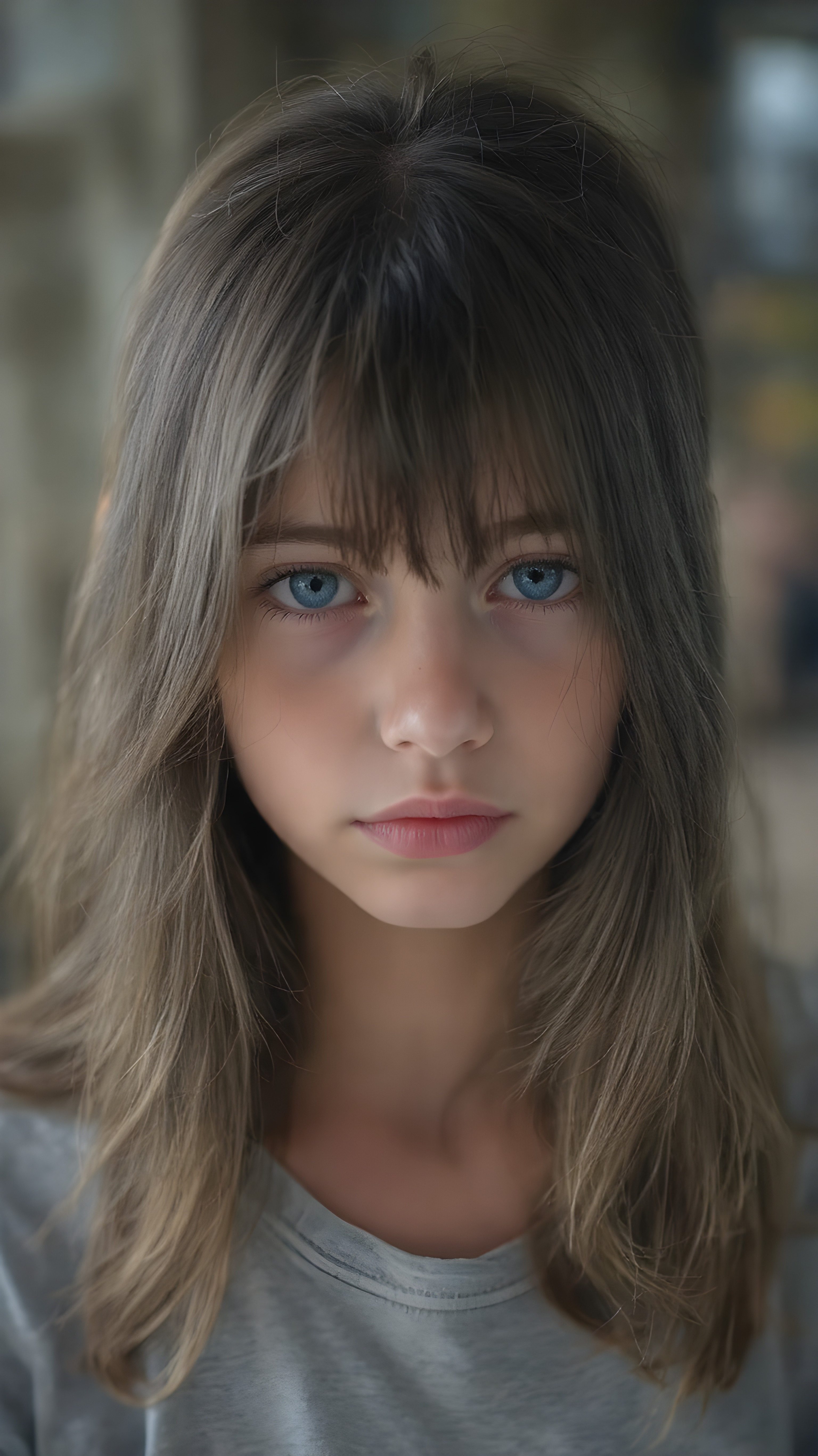 (a vividly stunning (((full body portrait))), with intricate details and exquisite coloring, capturing a ((beautiful young girl)) with long, wavy black hair framing her delicate face, the hair has exact the same length left and right, dressed in a light grey t-shirt, (((pale skin))), and (((light brown skin))), which complements the ((cool, realistic blue eyes)) that exude a sense of realism. Her face is beautifully drawn with the highest level of detail and attention to detail, reflecting an extremely high standard of artistry, hyper realistic, natural beauty