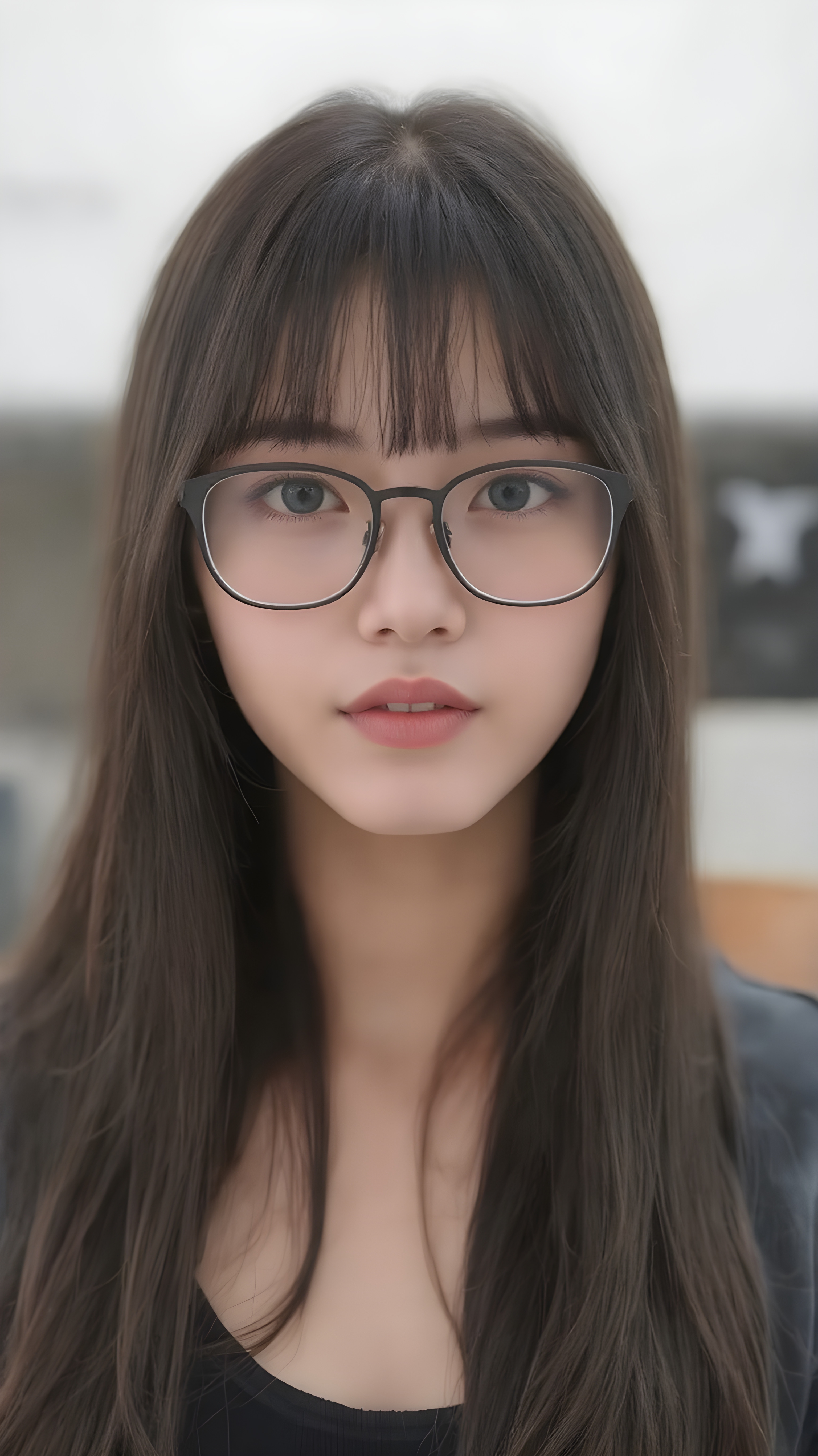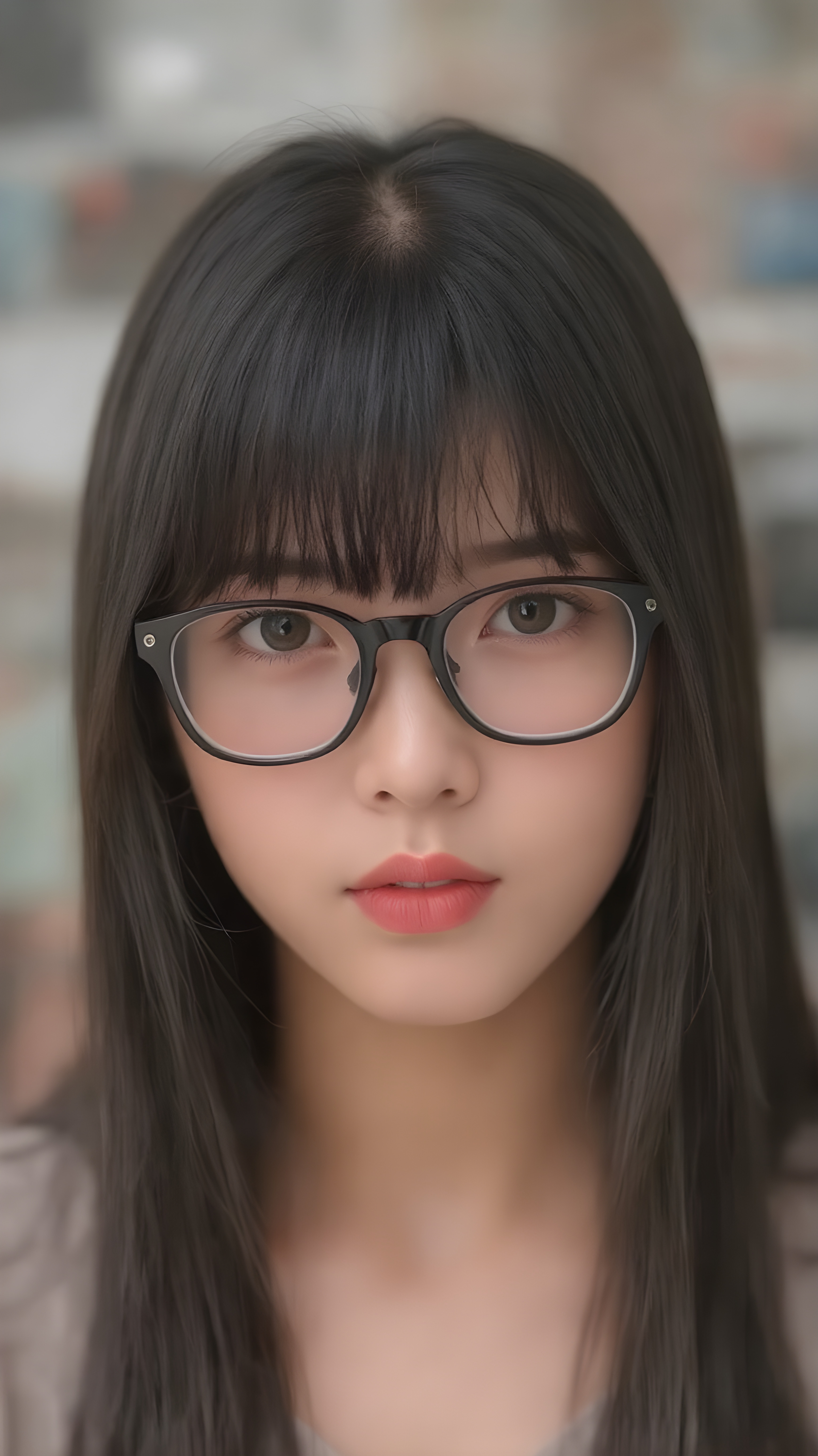 a (((super realistic full body image))) with intricate details and high quality that captures a (((beautiful young Japanese teen girl))), long straight black hair, bangs, black glasses, red lips