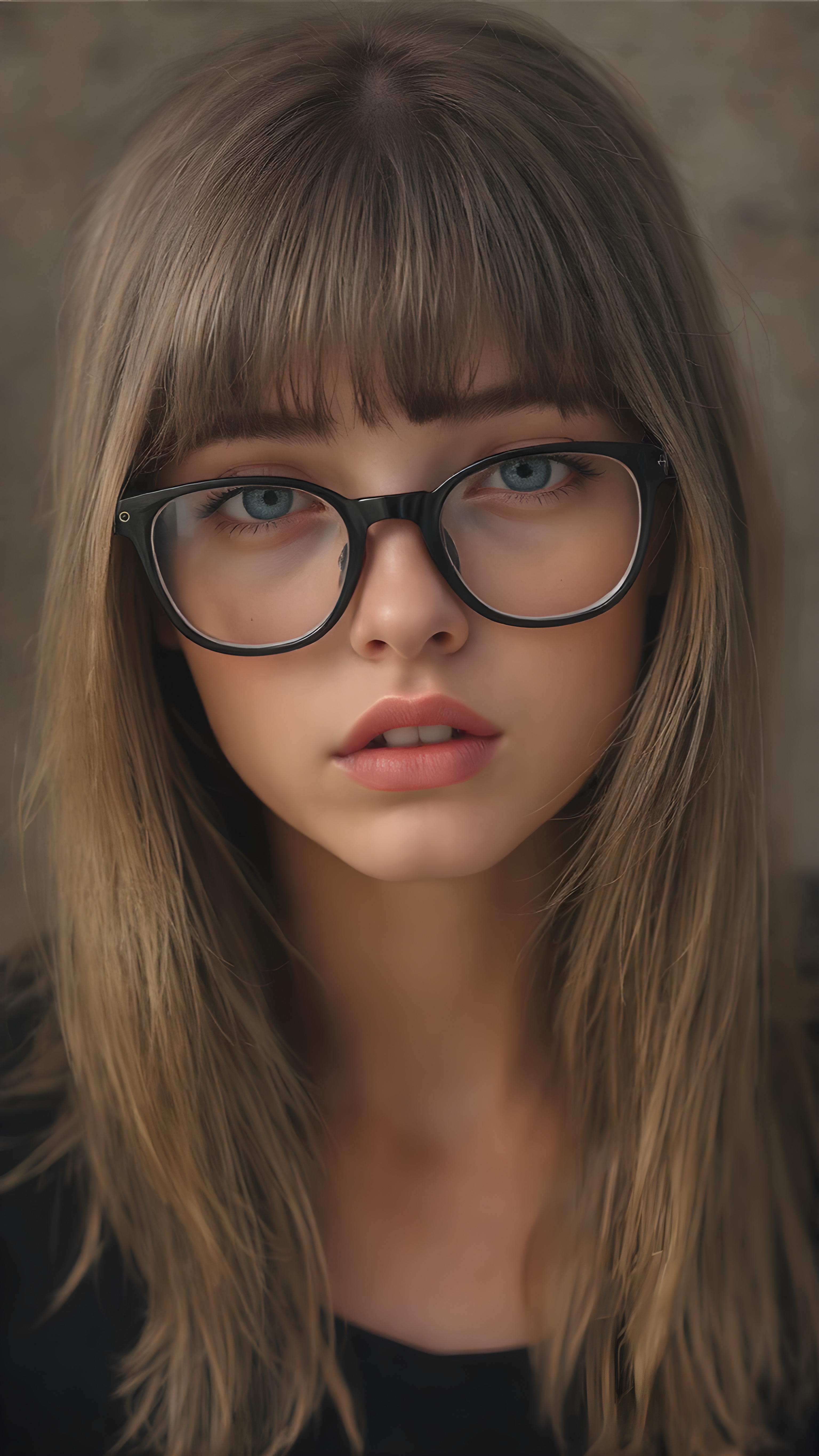 a (((super realistic full body image))) with intricate details and high quality that captures a (((beautiful young Exotic teen girl))), long straight dark blond hair, bangs, black glasses, red lips