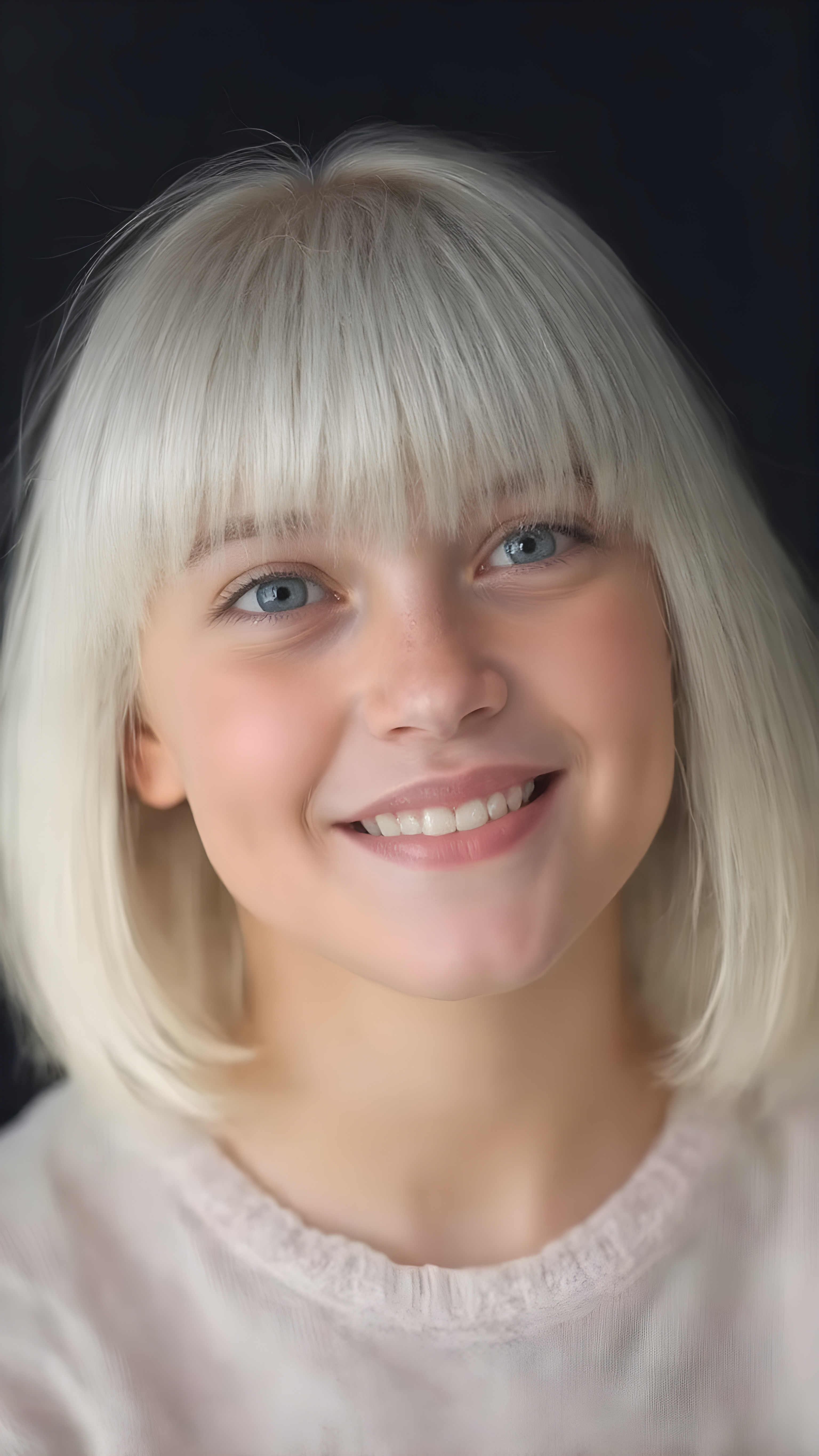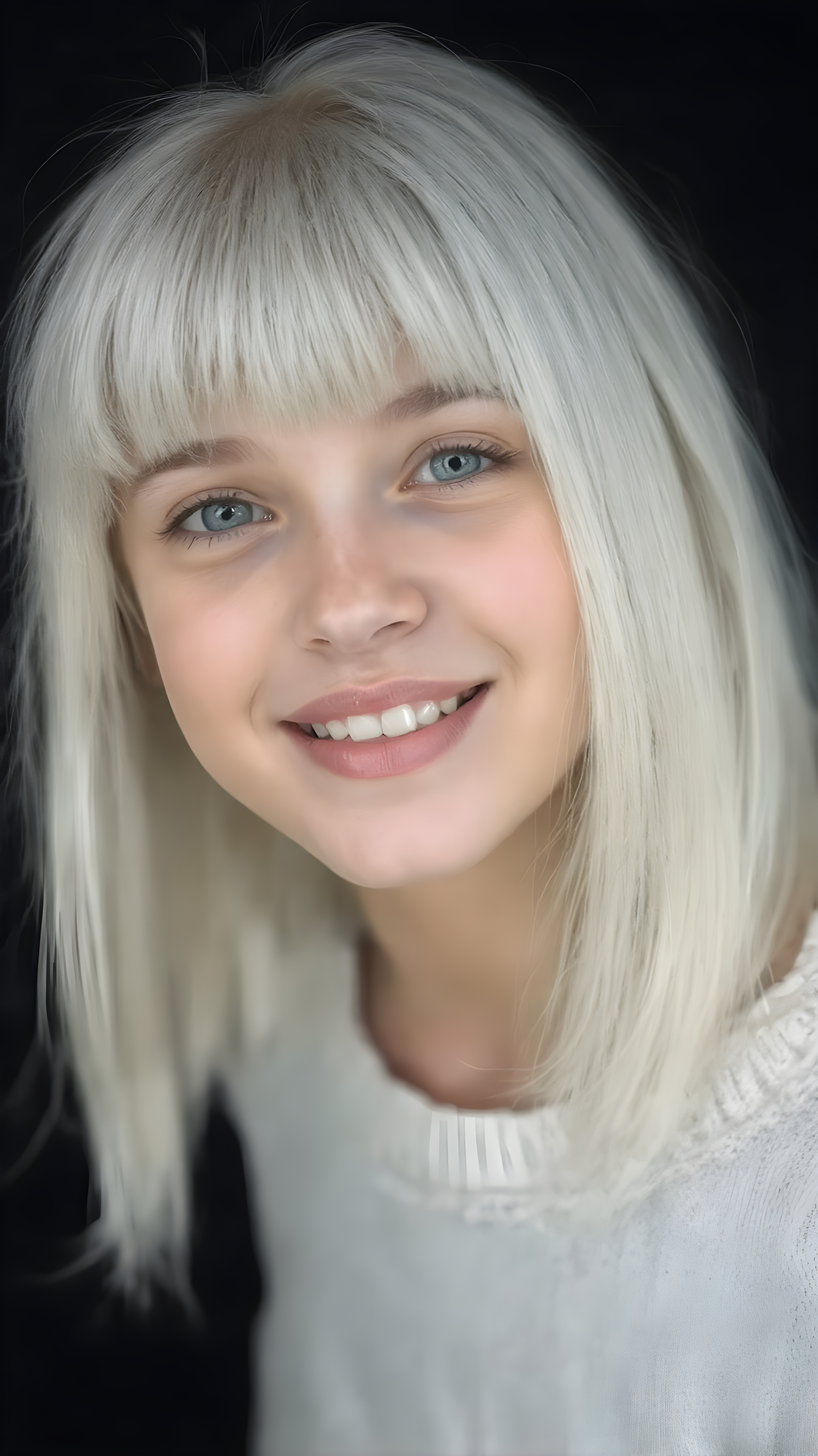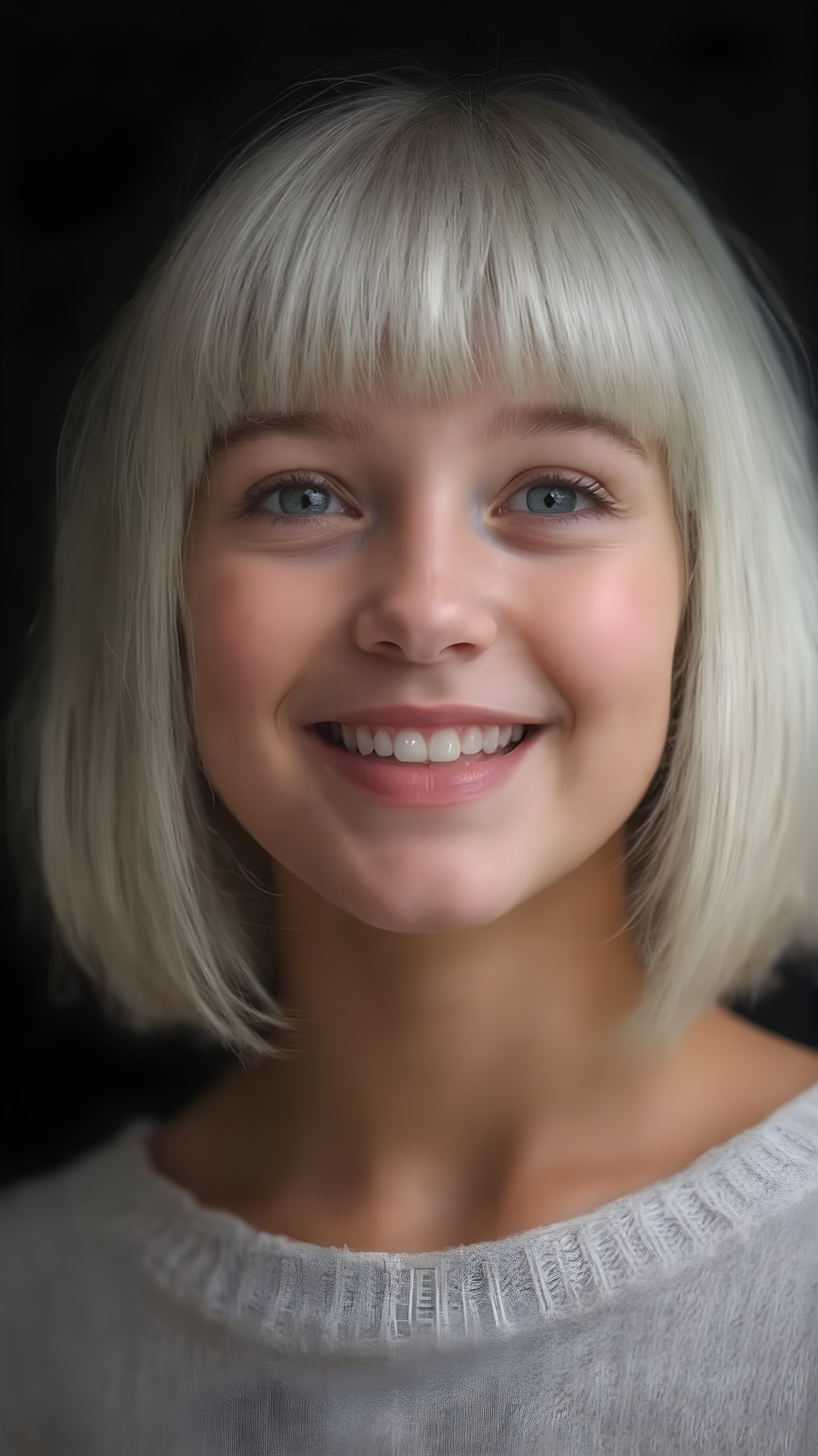 ((stunning)) ((gorgeous)) a beautiful silver-skinned very young teen girl, perfect studio photo, portrait, perfect curved body, round face, realistic fine straight platinum snow white hair, bangs and bob, full kissable lips, wears a white thin sweater, dark background, warm smile, realistic, smile white teeth, she is so innocent, looking up to the viewer, open mouth