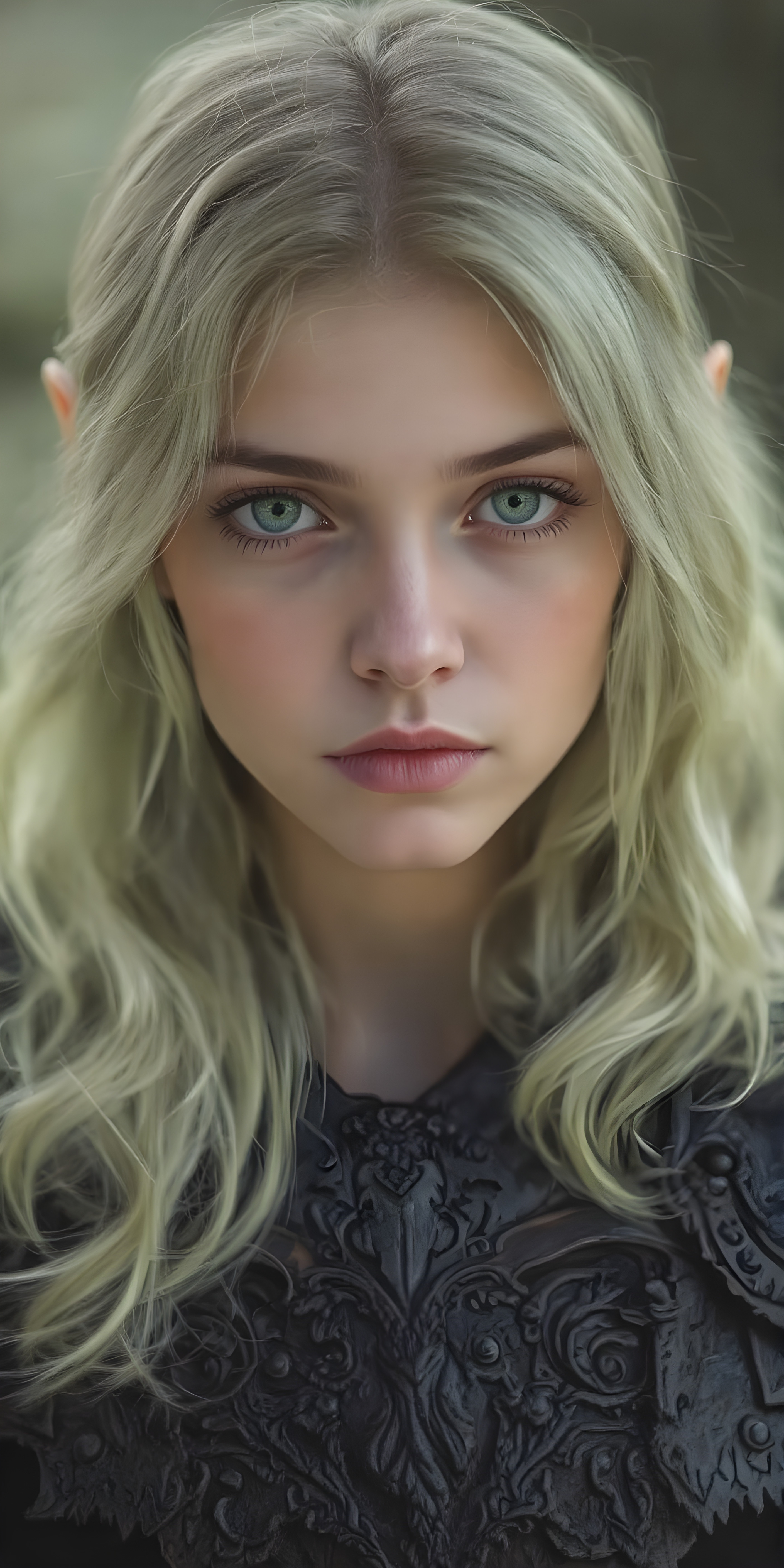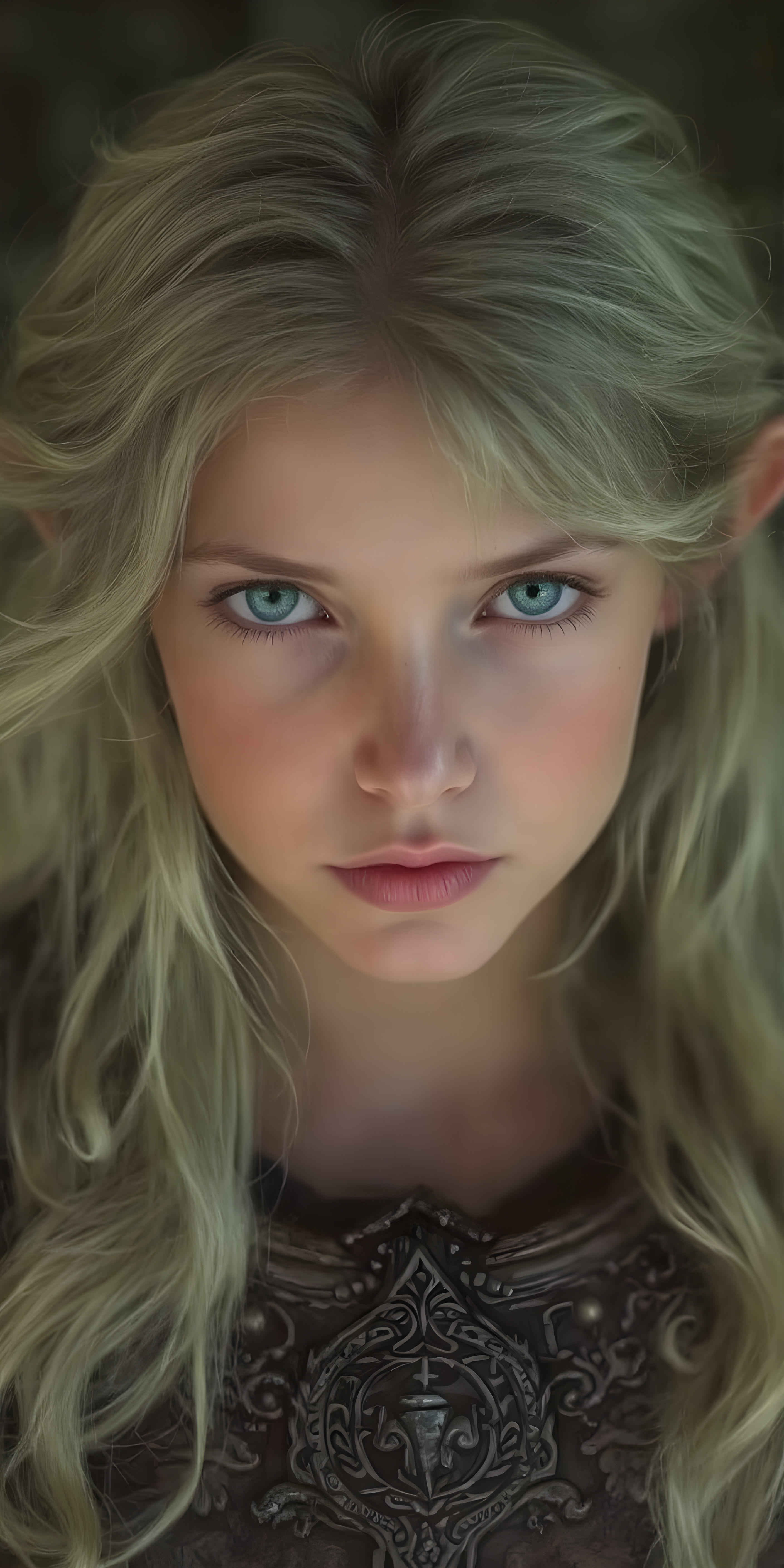 A (((Wood Elf))) with a (((sweet and endearing face))), featuring ((long, wavy, neon light green hair)) that softly flows down to her shoulders, complemented by (((vividly green eyes))). Her armor is a ((fantastical fusion of intricate wooden patterns and ornate metal accents)), evoking a sense of natural elegance and strength