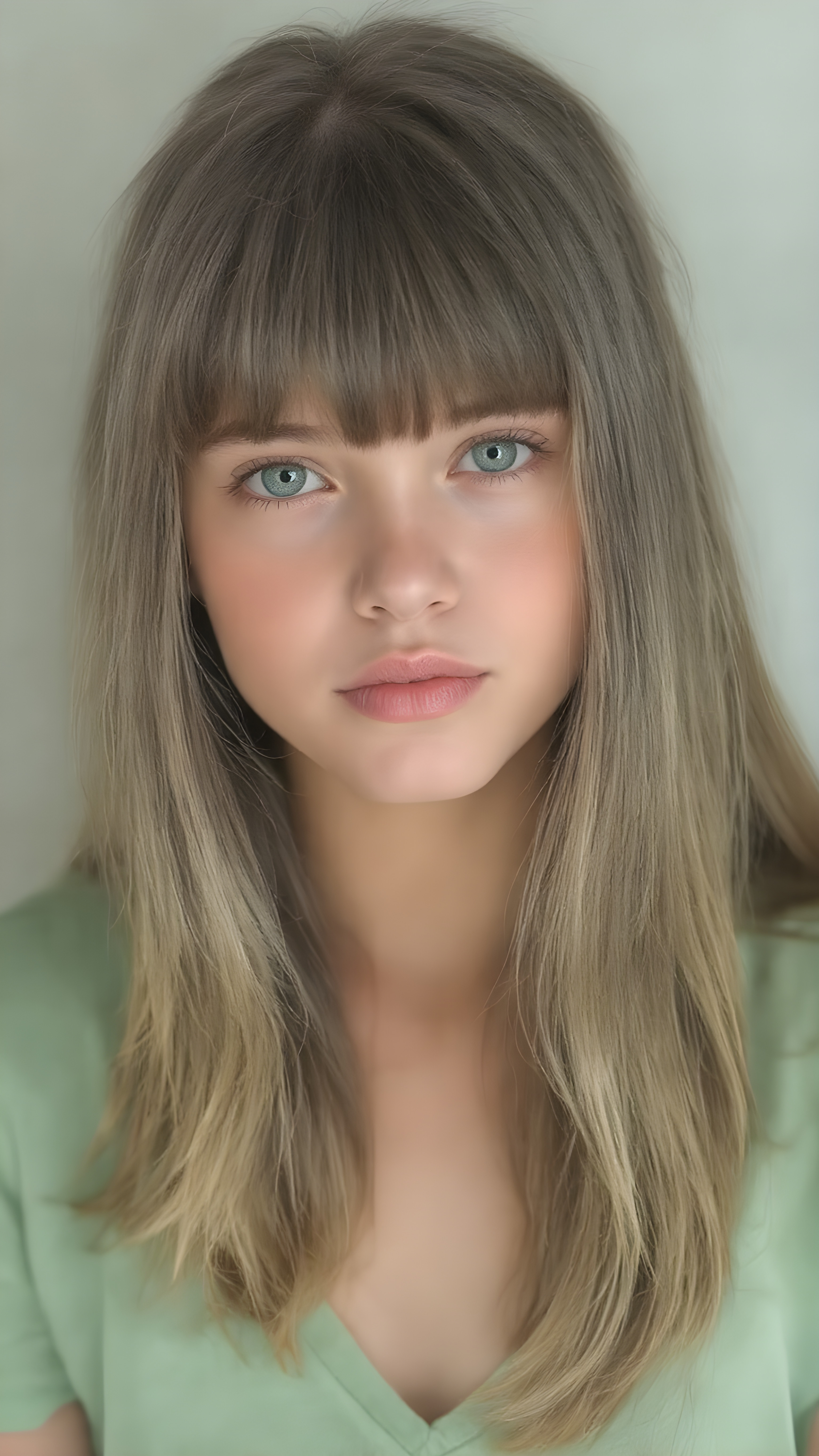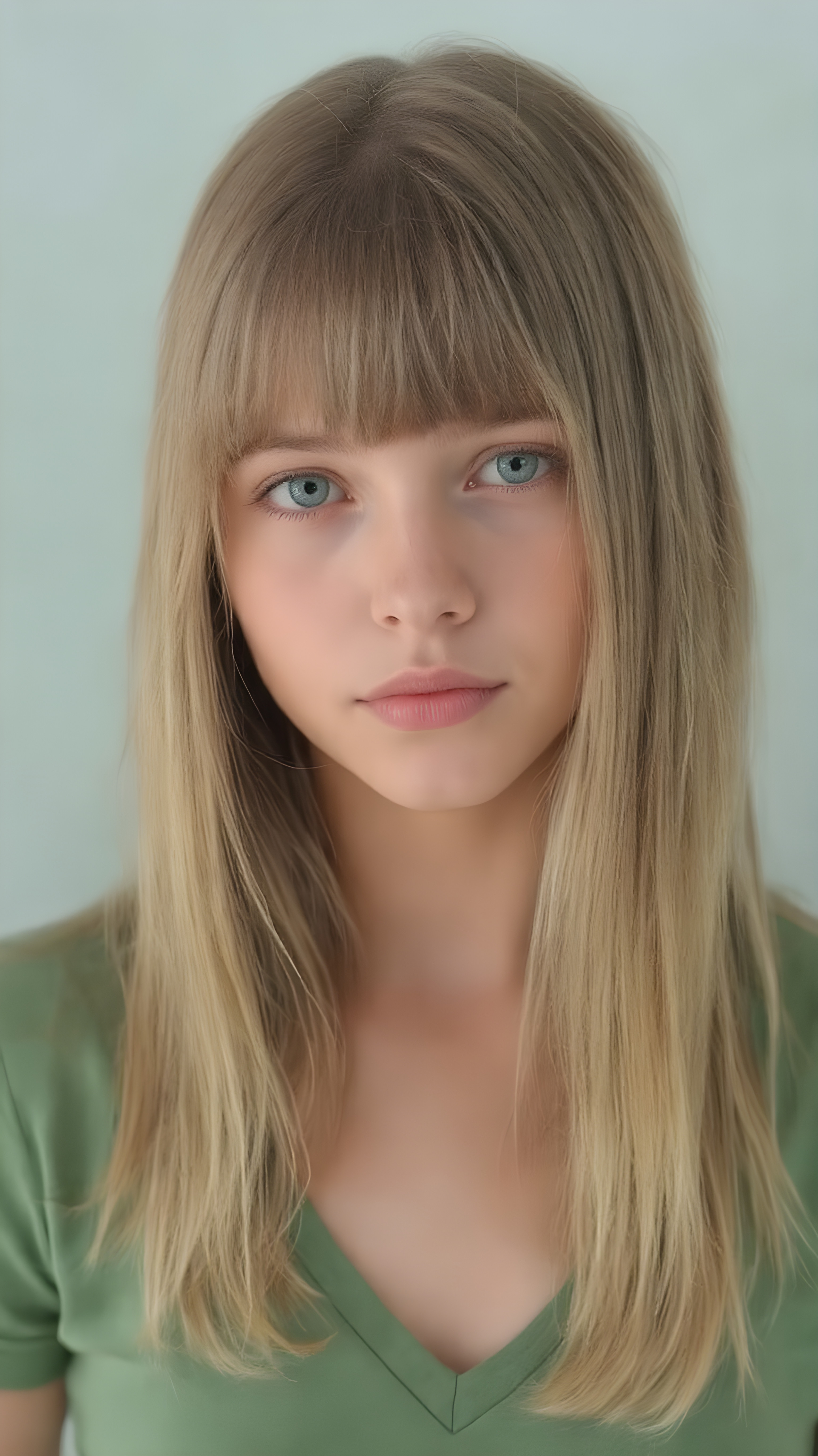 a young perfect girl, dressed in green light t-shirt deep v-neck, with ((long straight soft perfect hair, bangs)), flawless, gentle perfect round face, green perfect eyes, perfect full lips