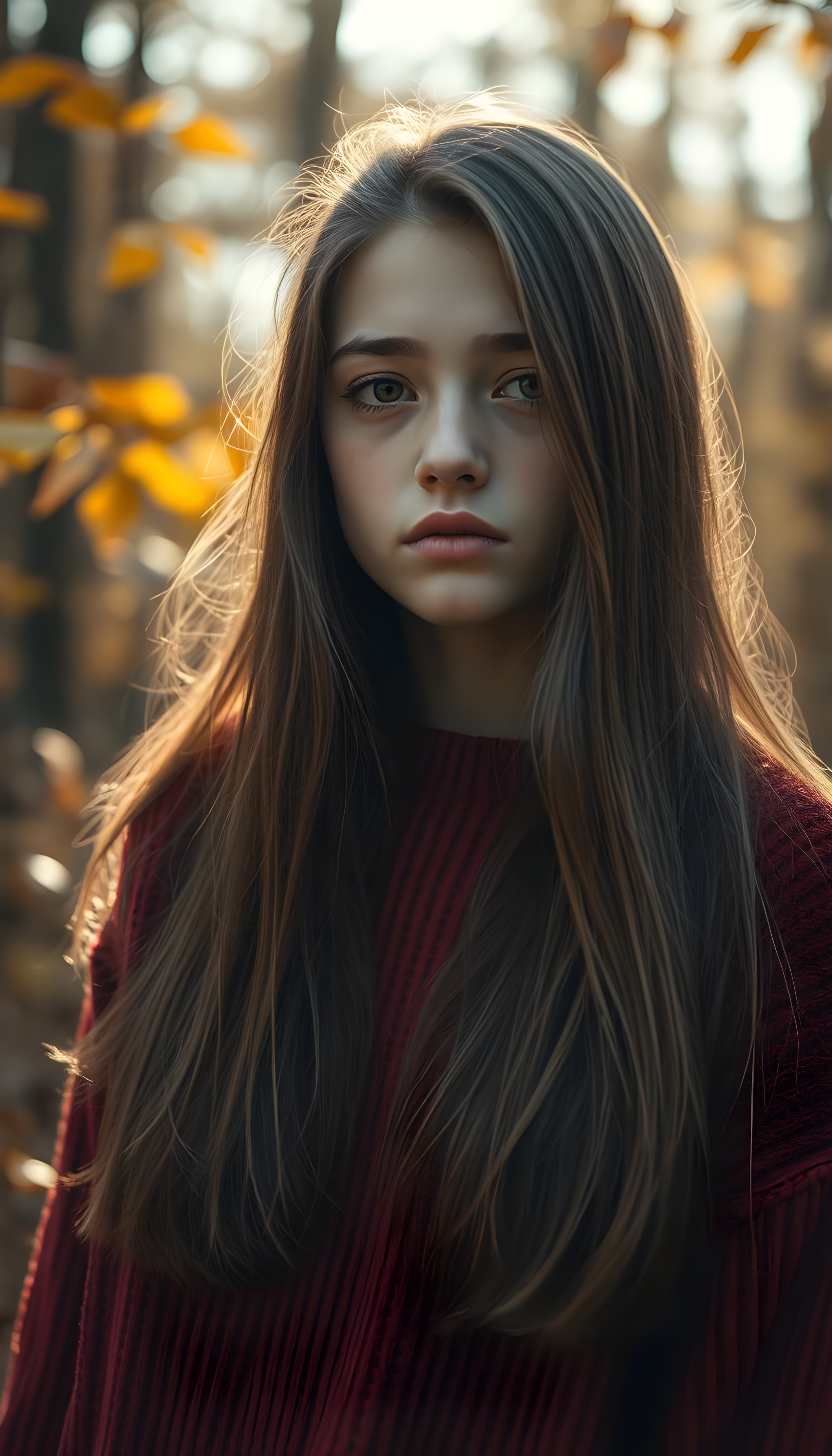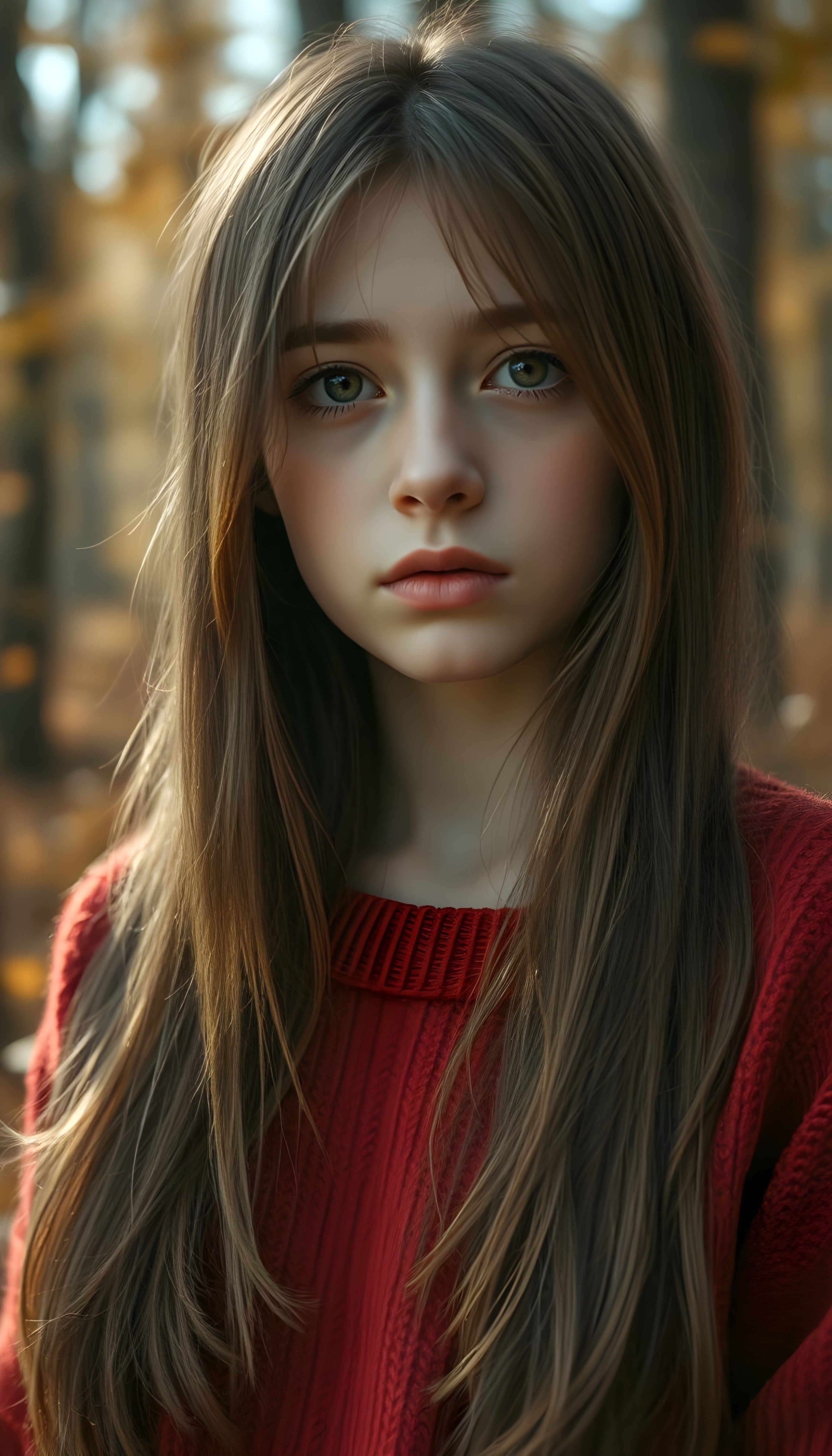 upper body photo from a young girl, with a sad expression and full plump lips, stands in an autumn forest. She has soft, long straight hazelnut brown hair with golden highlights. She is wearing a cozy red sweater, and her amber eyes are filled with tears. The forest around her is filled with colorful leaves, and the sky is filled with soft sunlight.