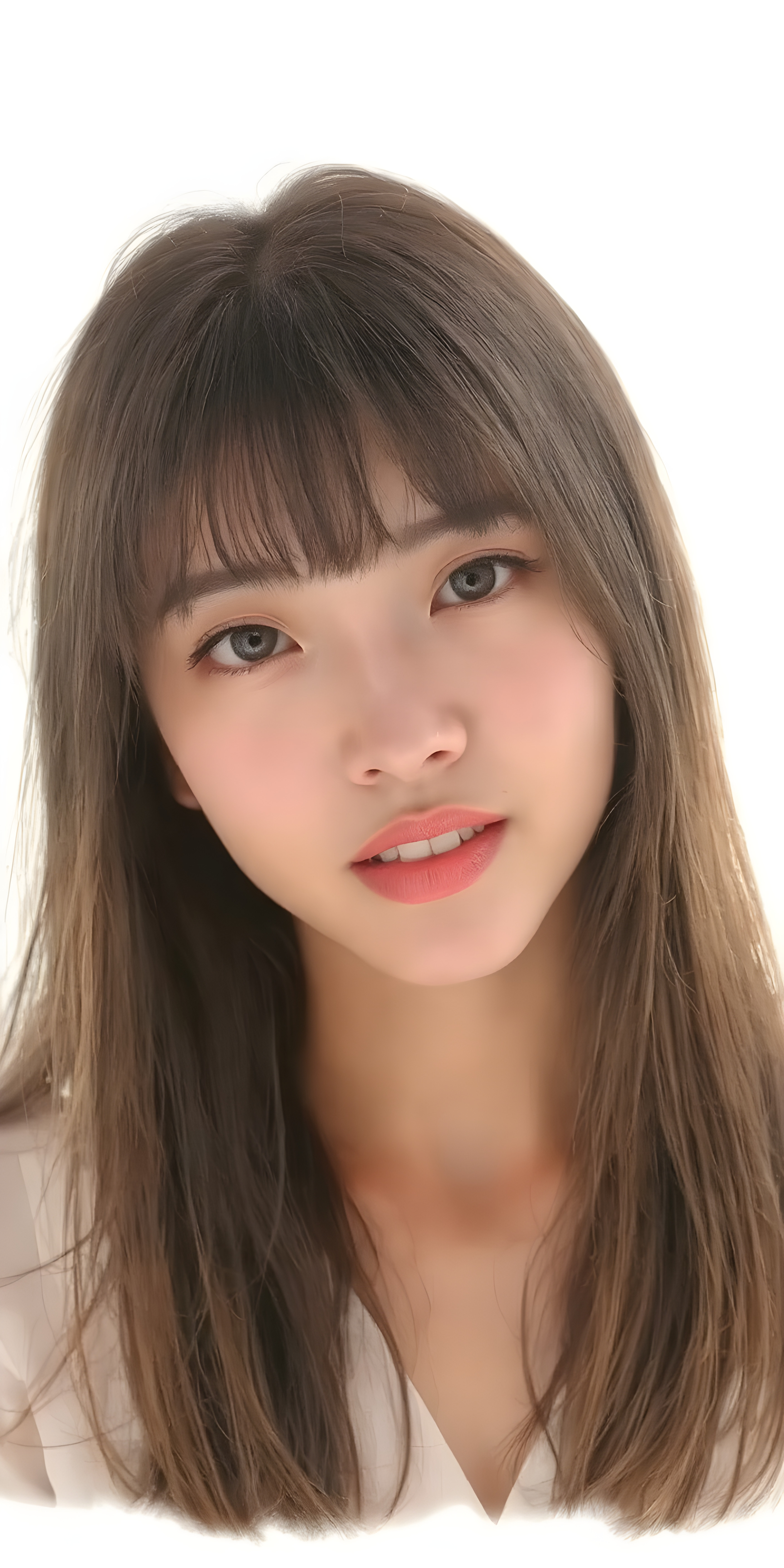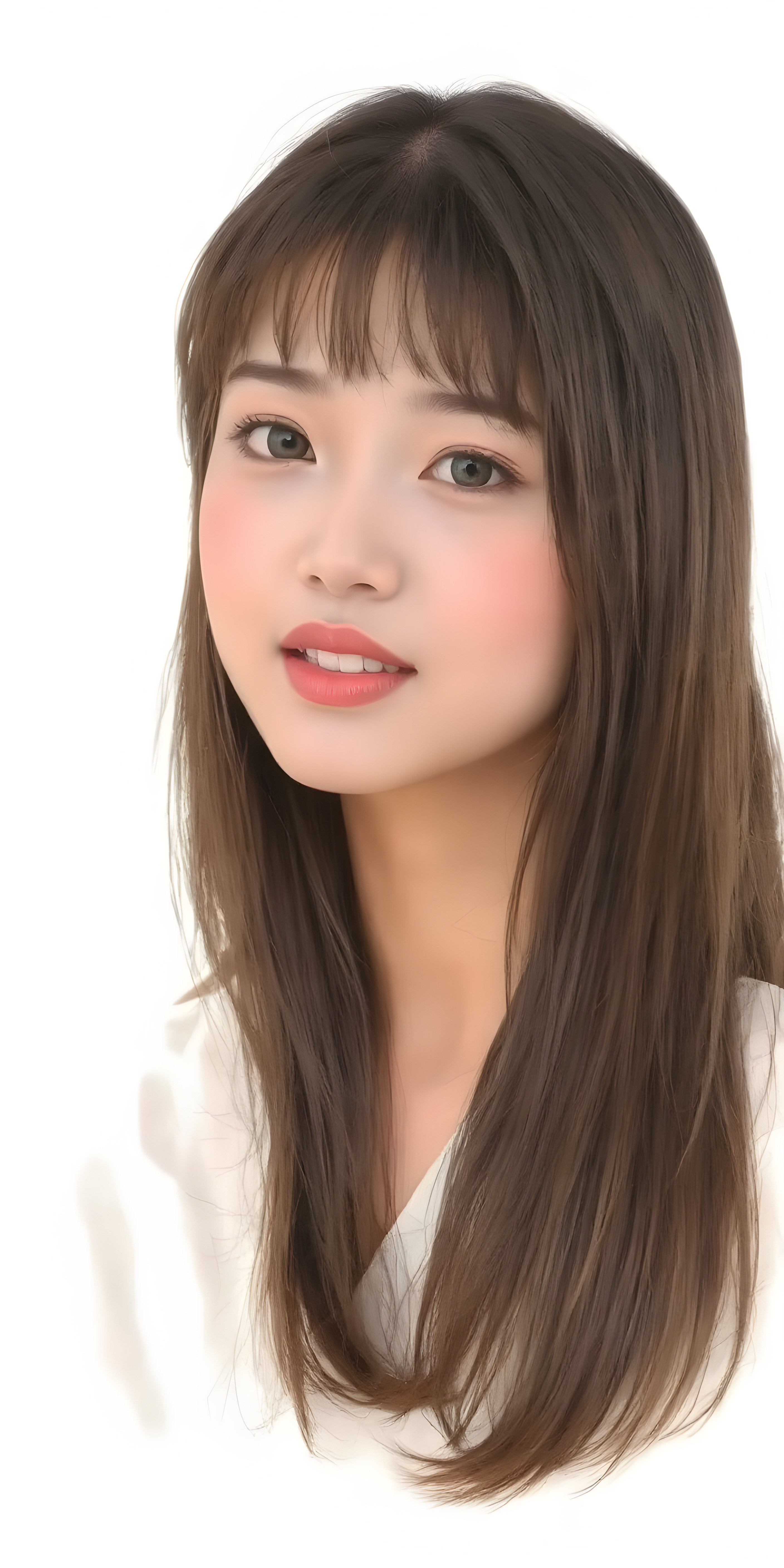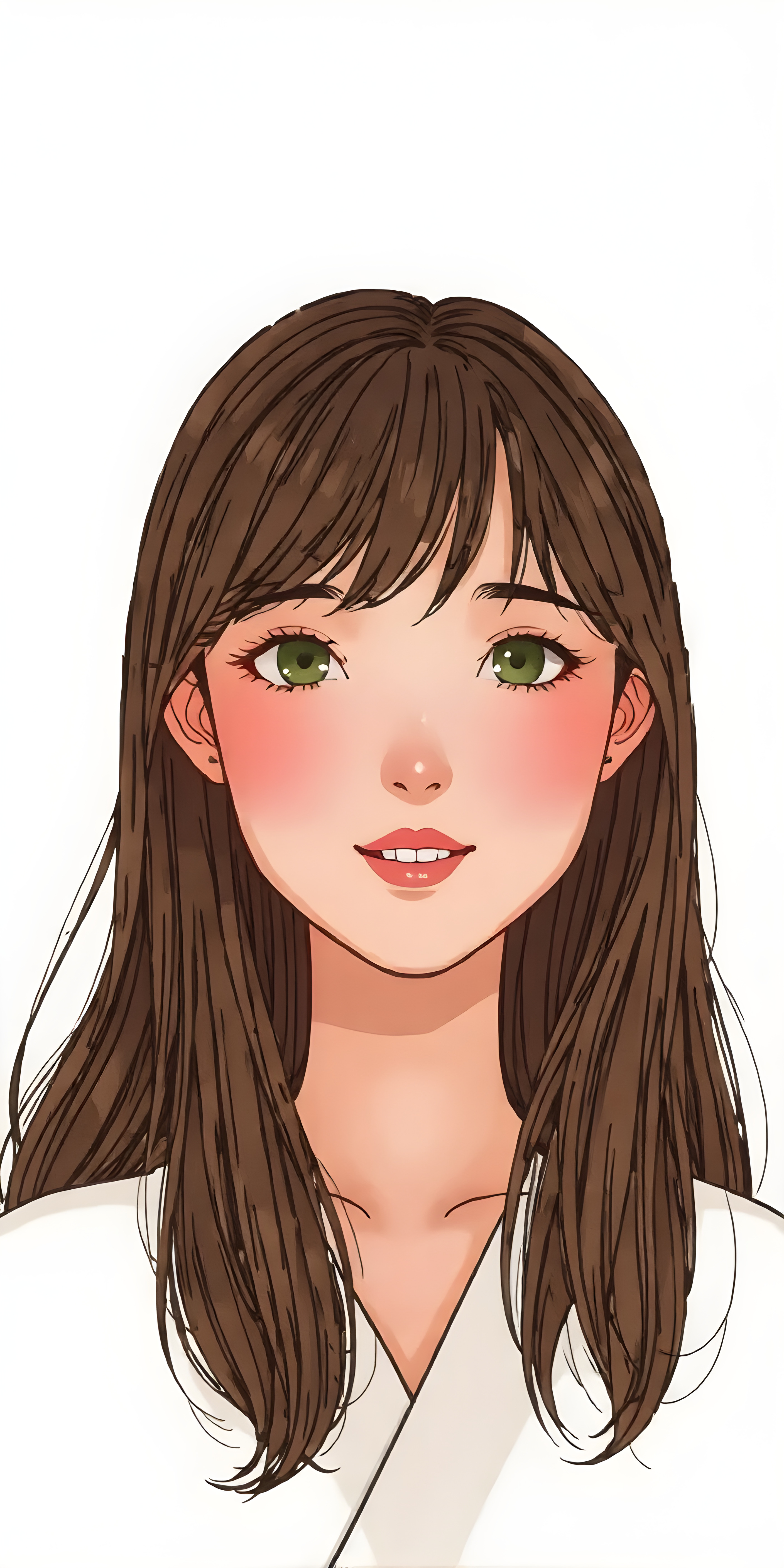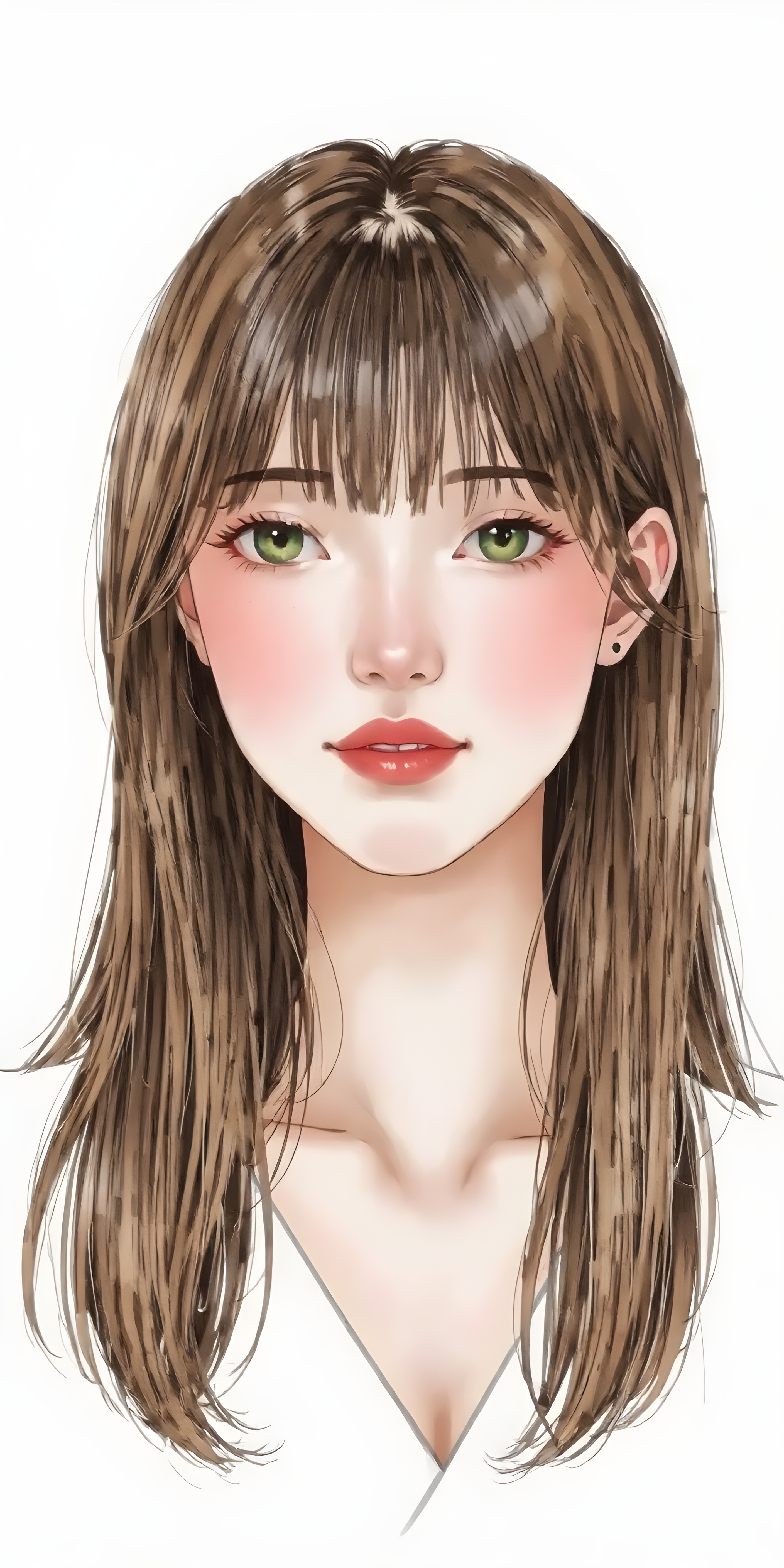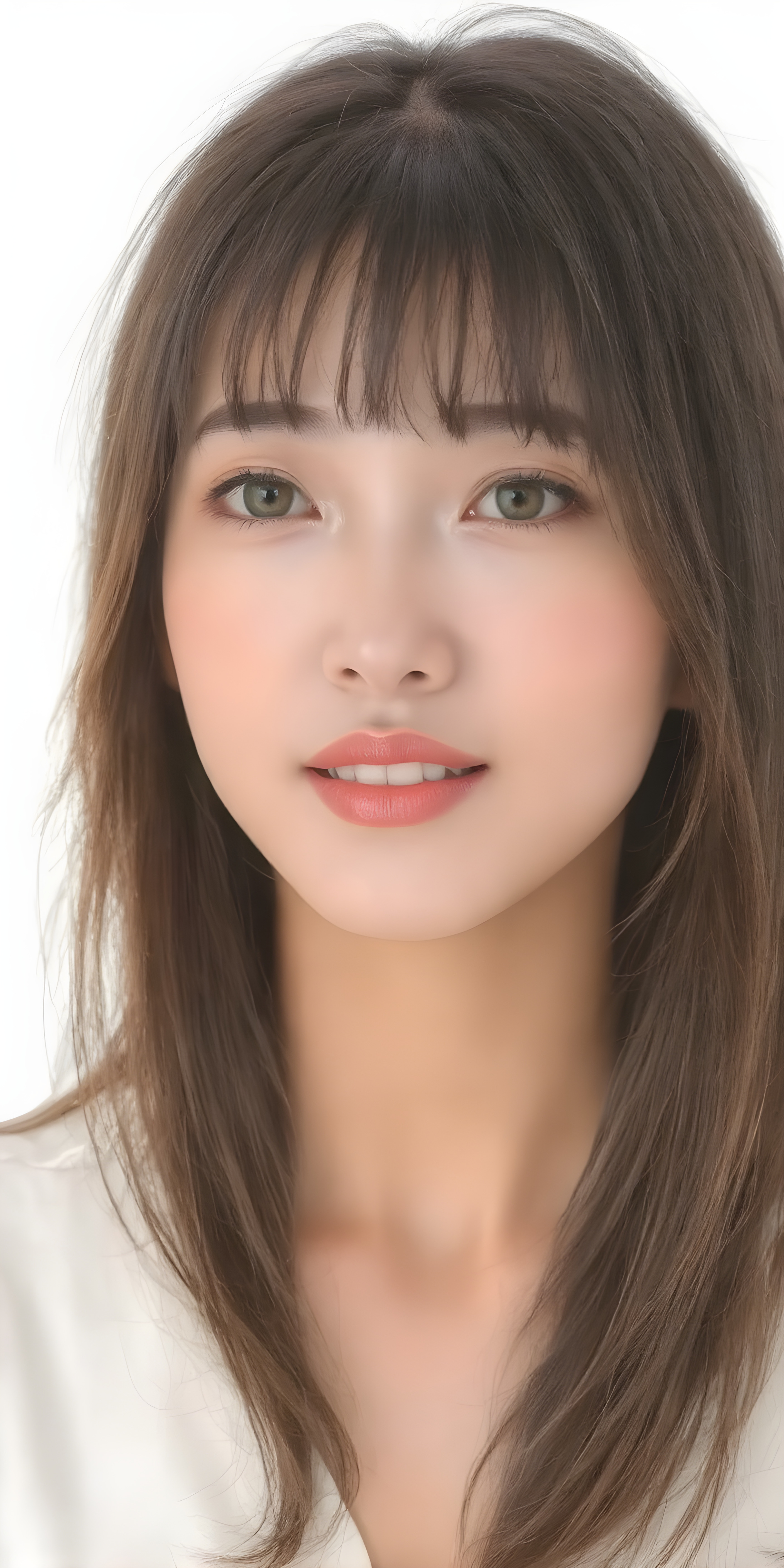 a (((wonderful, detailed hand drawing))) show (((beautiful, thoughtful and expressive cute adult Asian girl))), with (((softly curved long brown straight hair, bangs))), natural (looking) light green eyes, and (delicate yet defined cheekbones), poised in a (seductively thoughtful pose) with a ((flawlessly matching set of pearly white teeth)) and elegantly draped ((natural looking)) light sheer draped garments, ((completely covering her front and back, and perfectly shaped to convey a sense of natural beauty)), against a (natural looking, detailed white backdrop), head is centered
