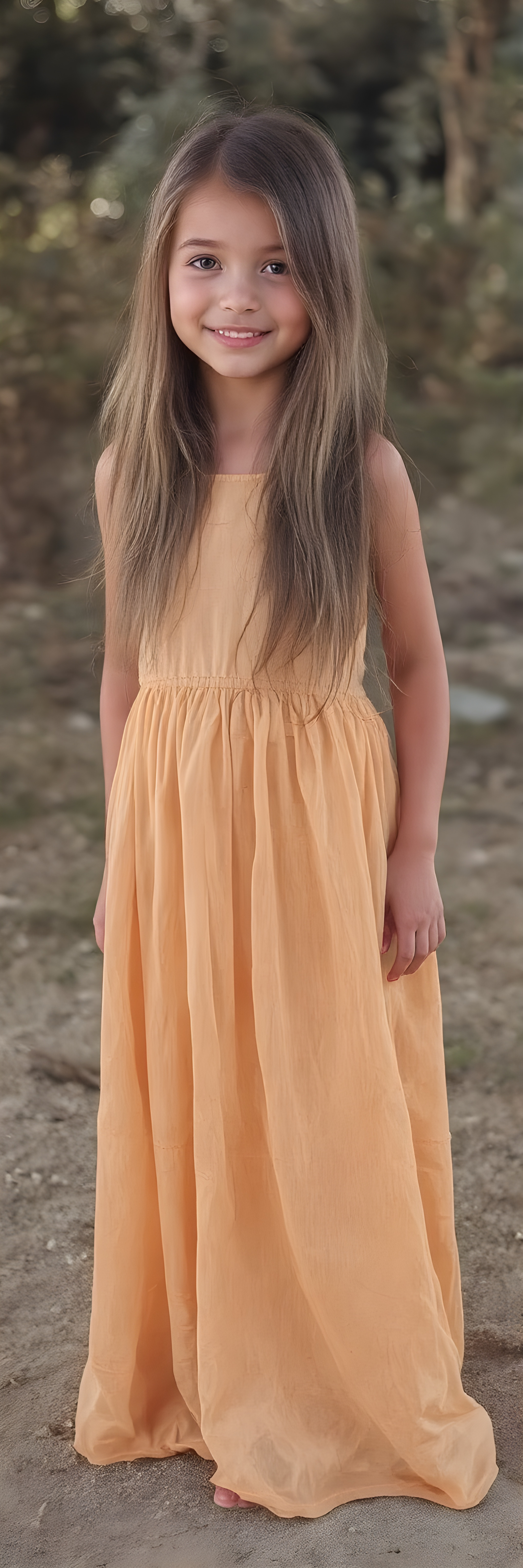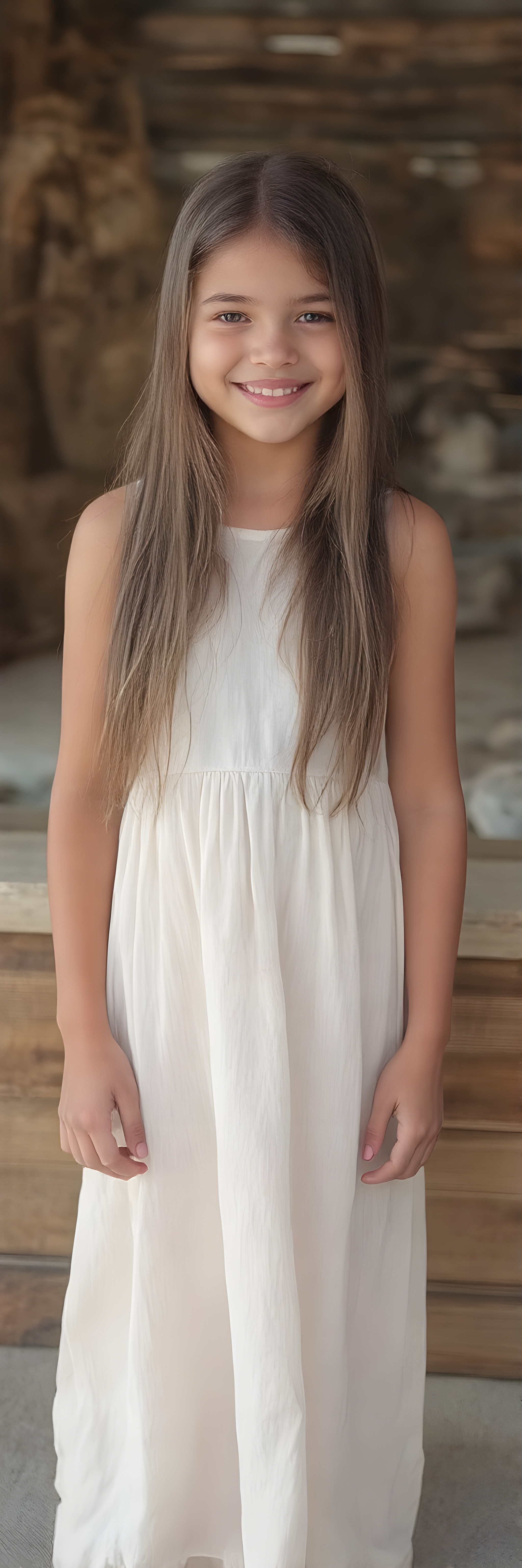 (((full body shot)) a (((vividly beautiful young girl, 18 years old))), with incredibly strong, thick, natural legs and a perfectly toned, intricate female form, dressed in a (((extremely light long dress))) that emphasizes her natural beauty, featuring straight, full soft hair that gives off a gentle glow. Her smile radiates warmth and confidence, perfectly accentuating her adult face. She exudes perfect physical and emotional health, representing a stunning 8K image that captures her perfectly serene yet playful essence