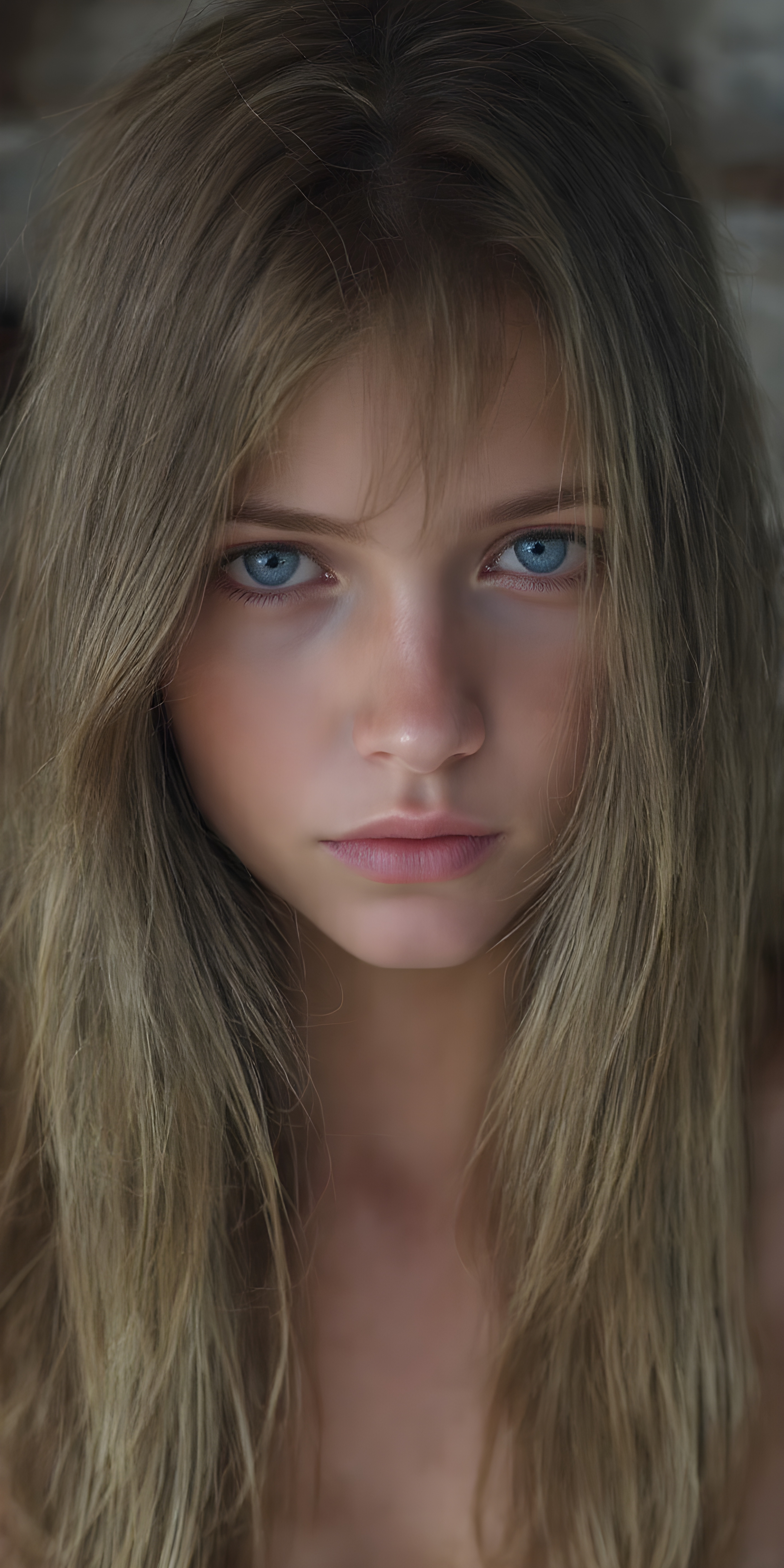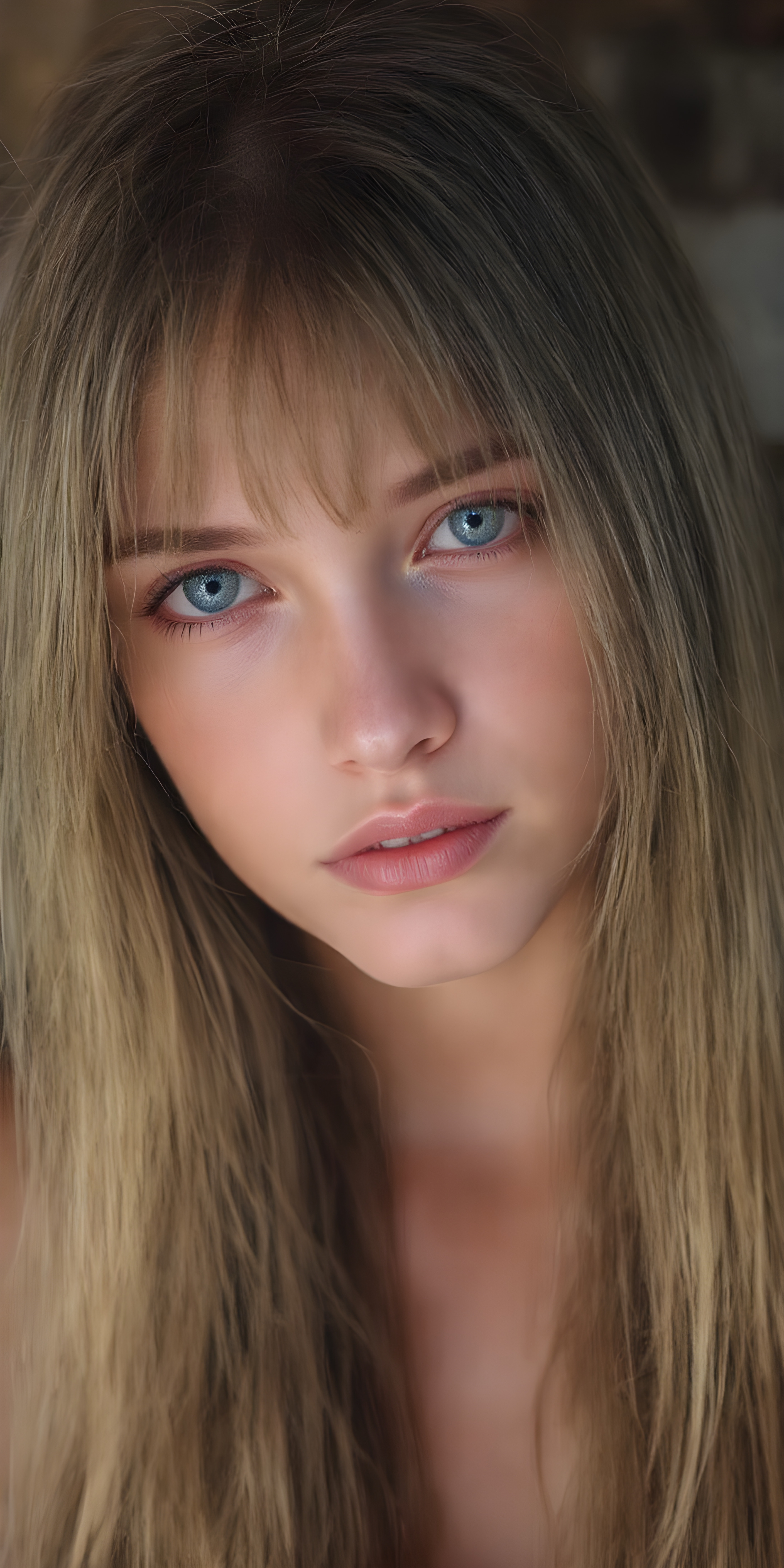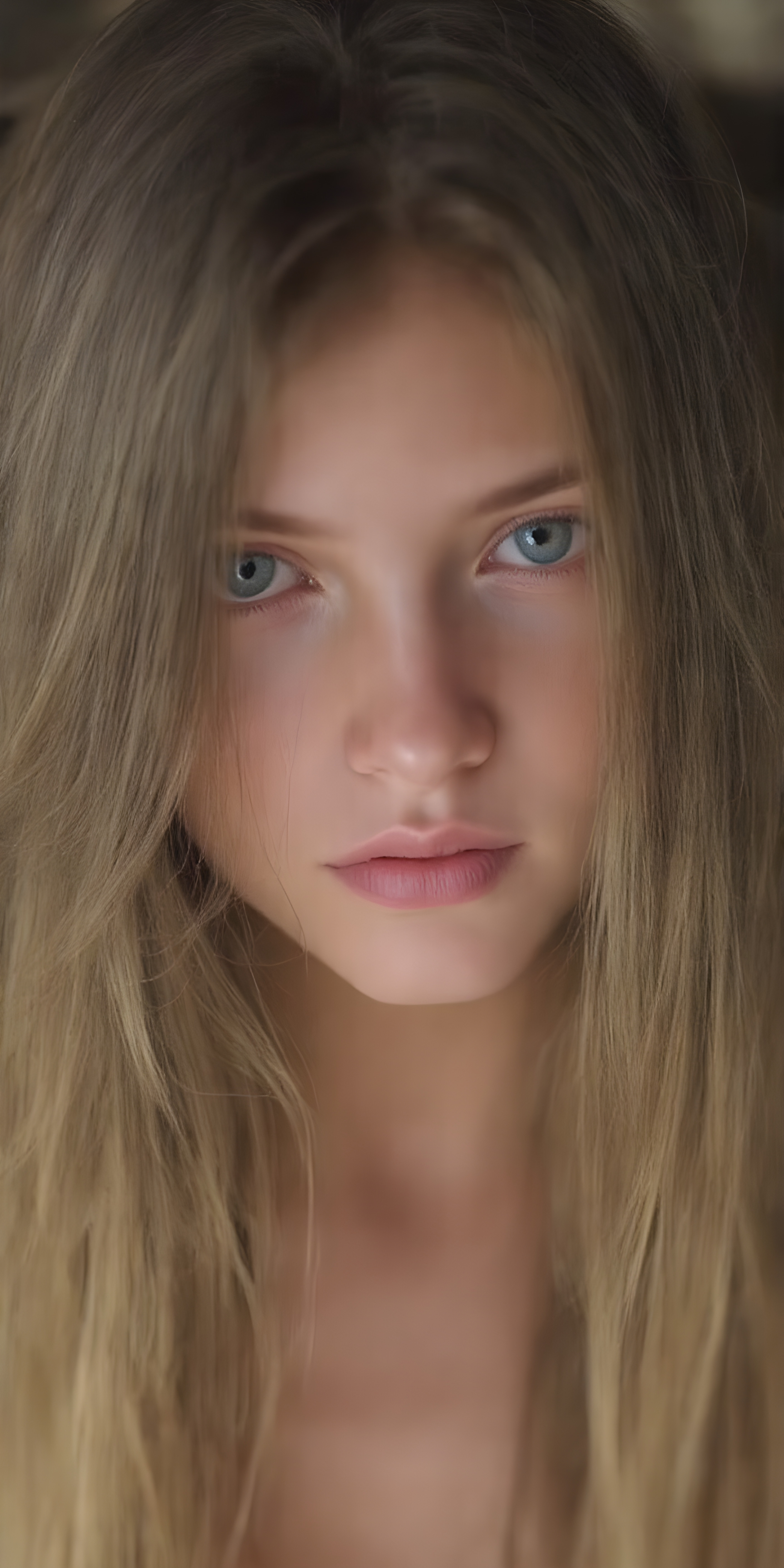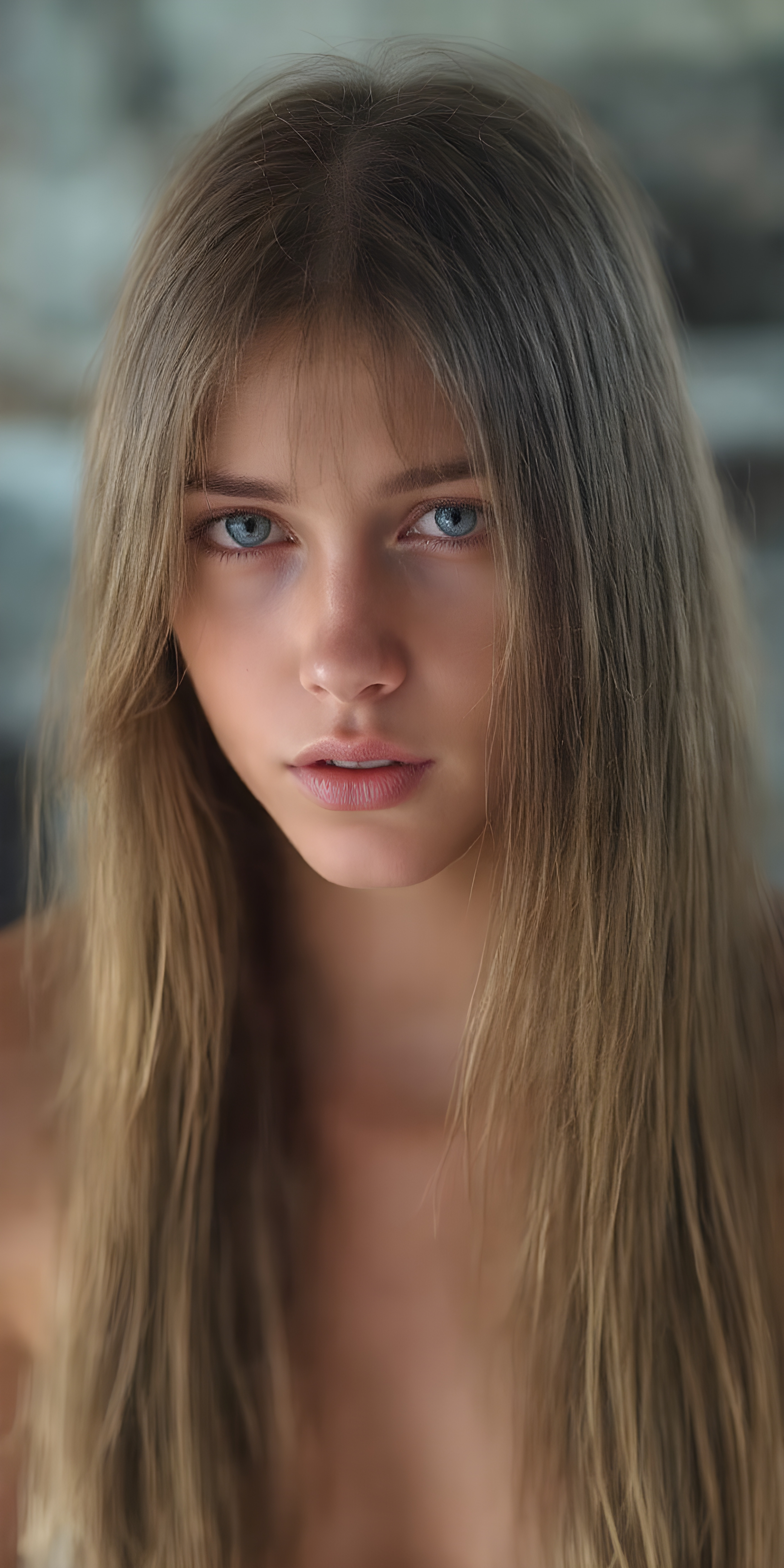 (realistic and detailed photo), (full body shot) a young, gentle adult busty teen girl with very long, soft straight brown hair, her full hair falls over the upper body and cover her body, round face. She has blue eyes and gentle features. Her young, perfect body radiates pure femininity and she looks seductively into the camera, wide angle