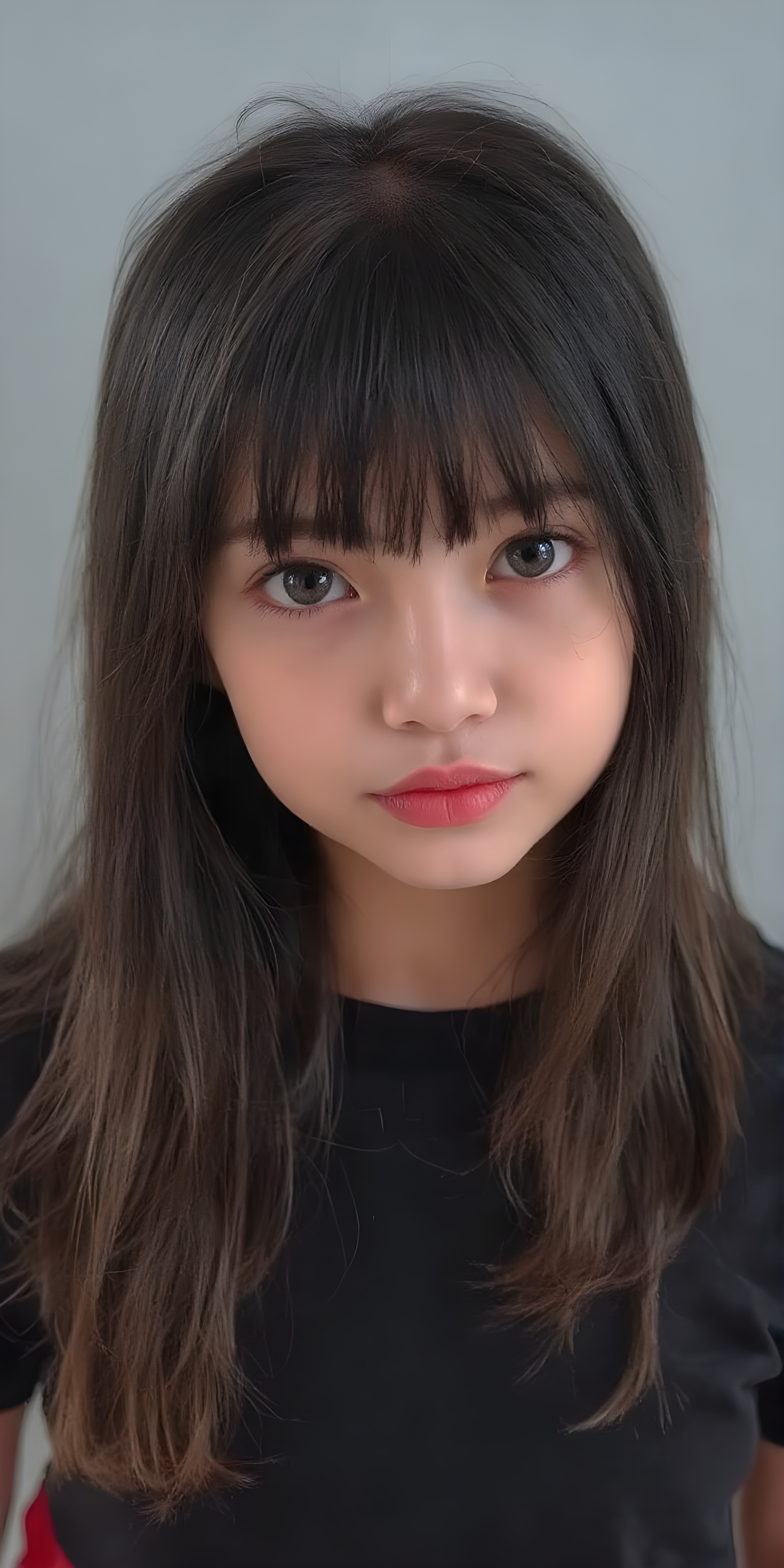 a (((cute adult girl))) with (((thoughtfully long soft COLOR straight hair))), that gently curls into a (((playful but welcoming pose))), as she gives off an air of (carefulness and attention to detail) in her expression. Her (((vividly beautiful eyes))), which exude a sense of (curious intelligence), are framed by (full, defined red lips) that convey a feeling of (playfulness). She’s dressed in a (softly fitted short black T-shirt) with (flared, glossy red skirt) that make her overall height and figure (extremely accurate and exceptionally + ATTRIBUT), stand in front of the viewer, grey backdrop